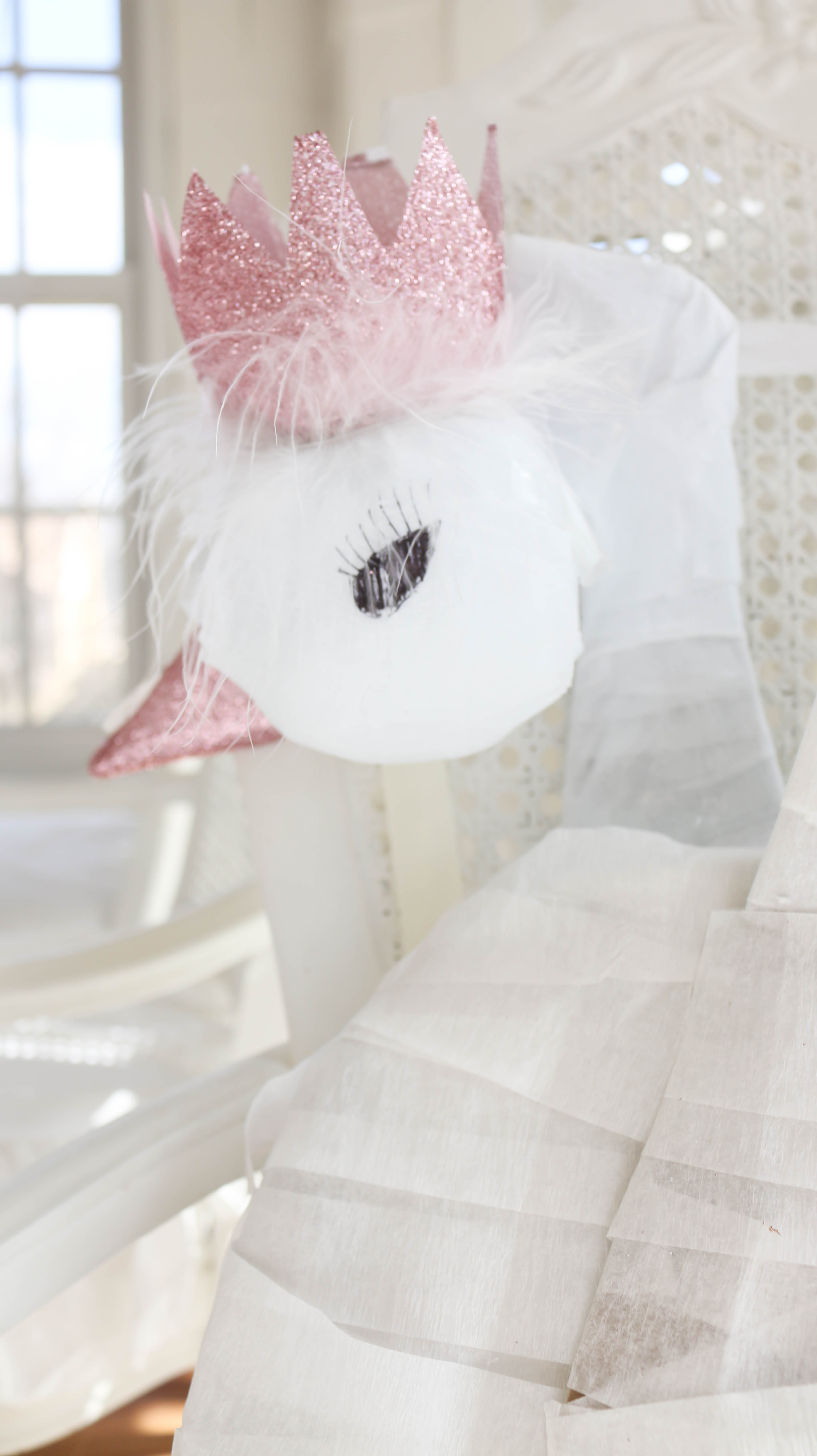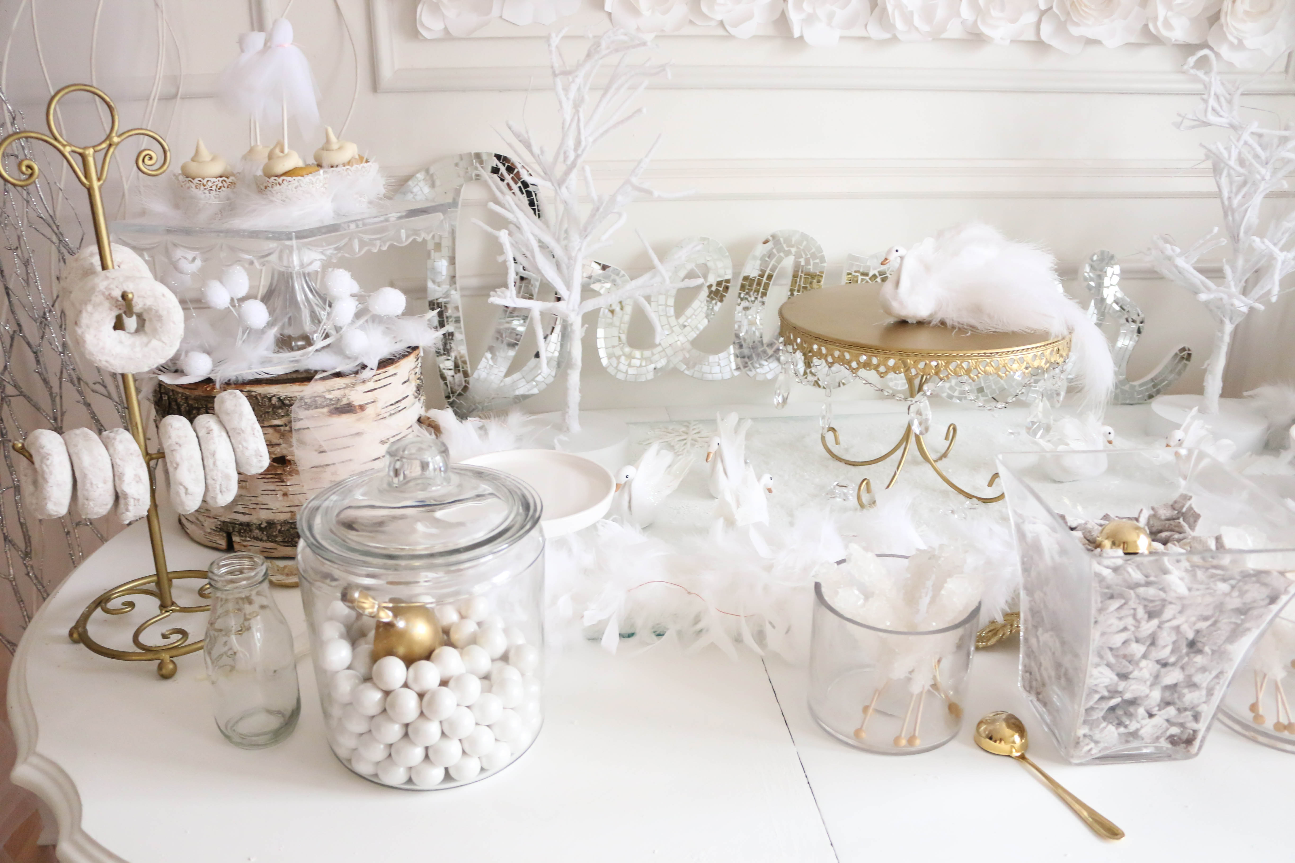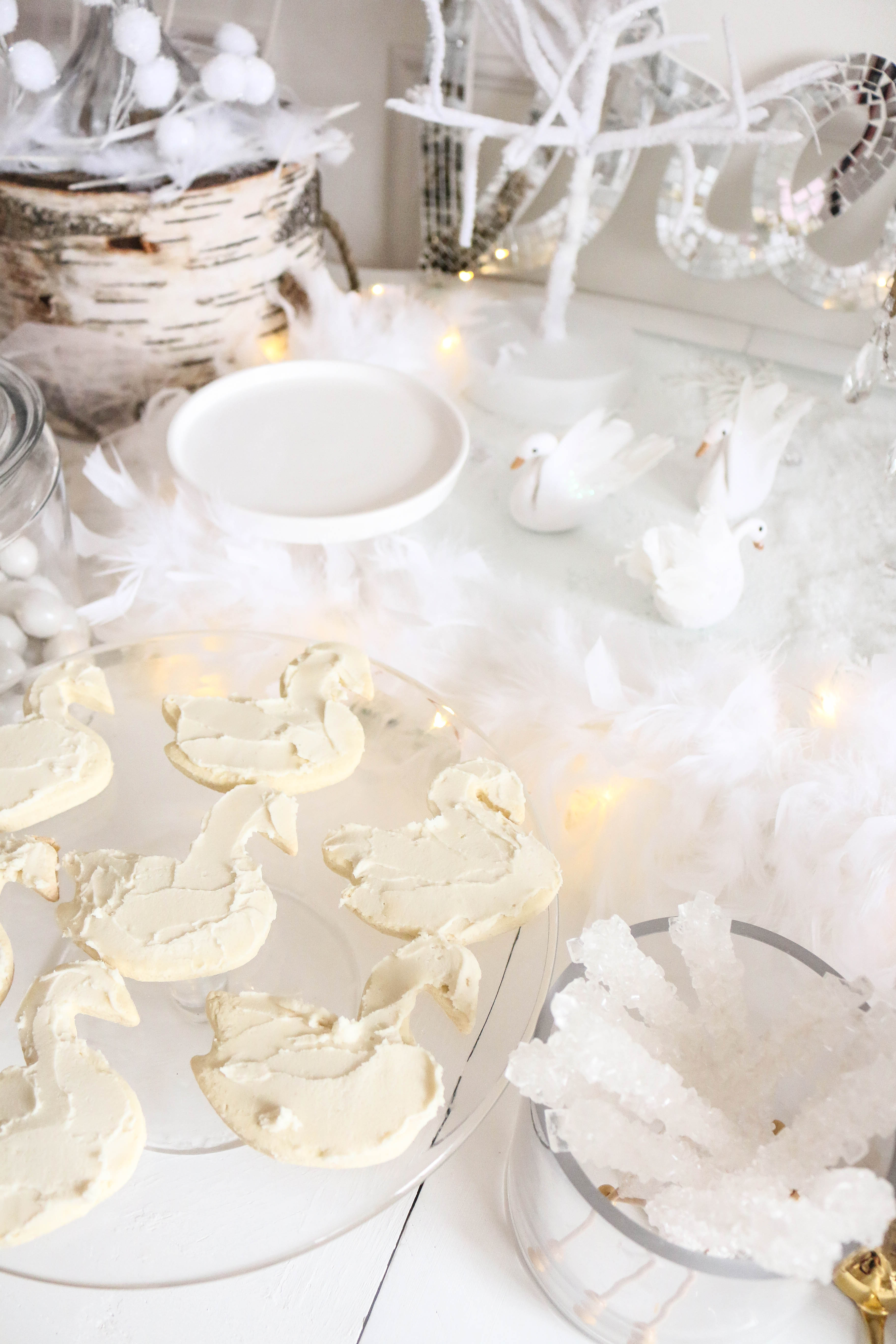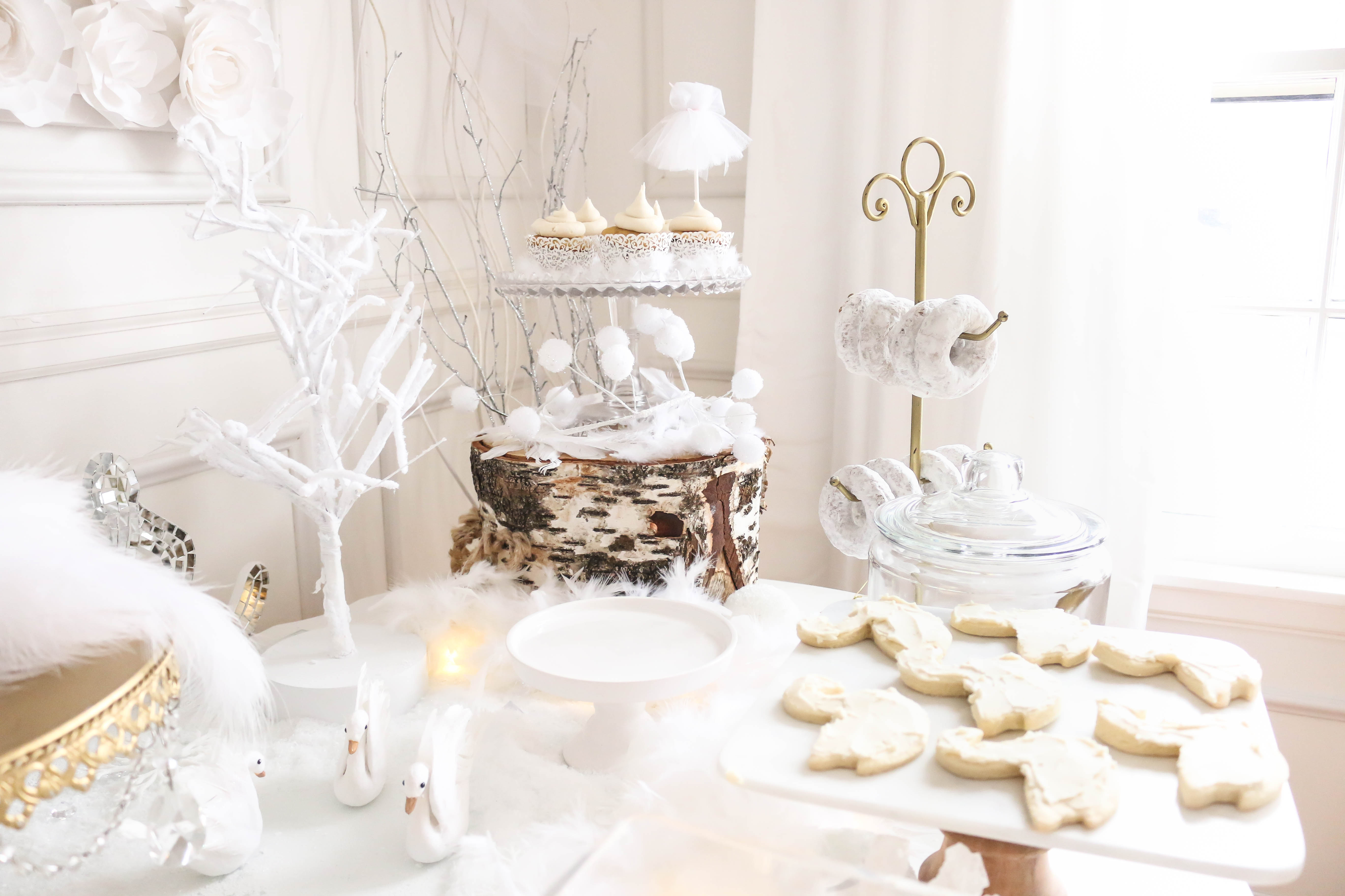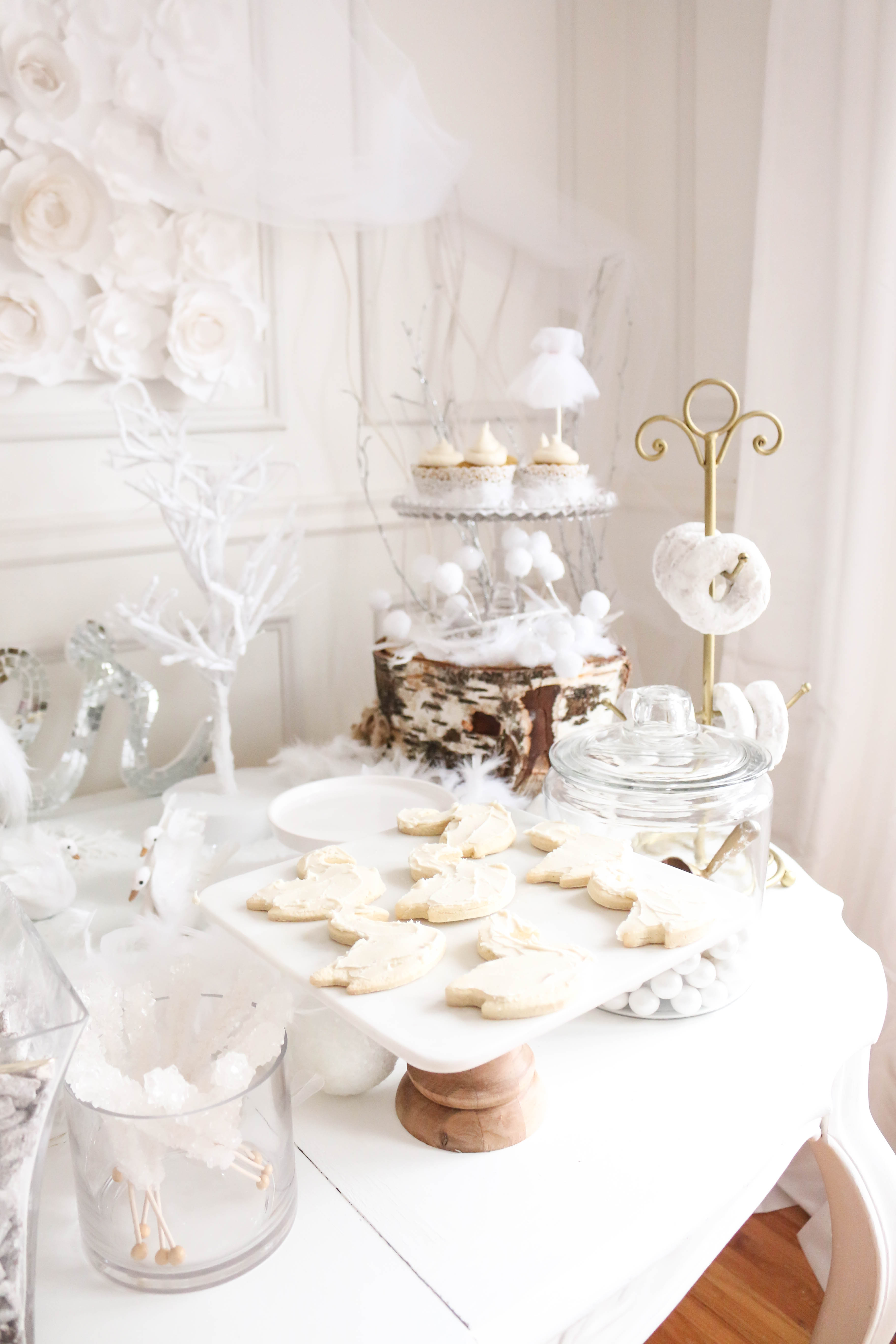 Bella had a swan lake party! It was a wintry party filled with feathered swans, white cookies, cupcakes, donuts and candy, swan ice sculptures, swan pinata and a white hot cocoa bar. The girls got to make feathered headbands with sequin ribbon and the boys had black swan masks! We turned our 3 season into a swan wintry wonderland for the little ones to enjoy their food. All the kids were asking if I made a pinata again this year, and I'm so glad that I stayed up making one the night (or morning) before her party. My husband thought I was crazy constructing a swan at midnight!