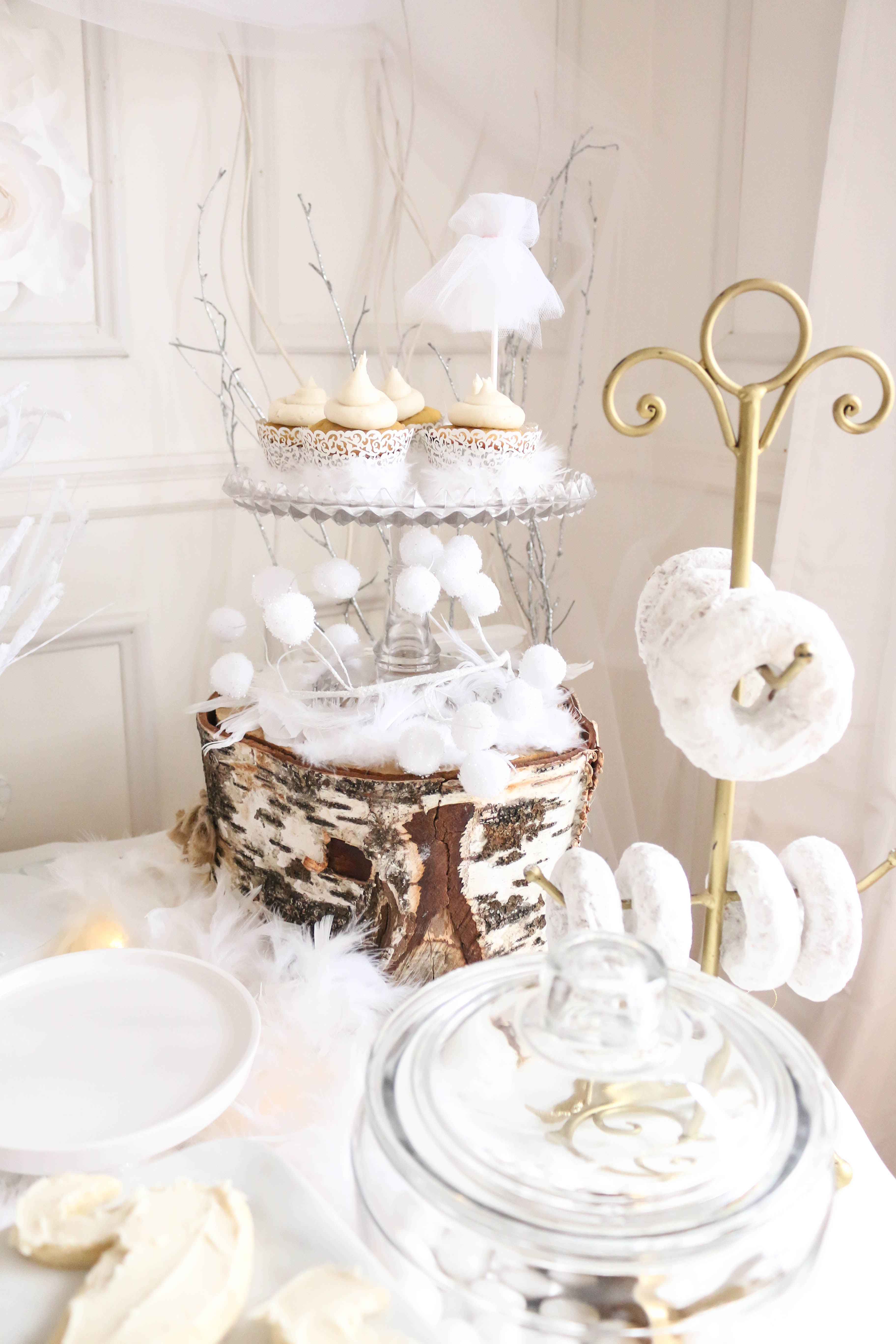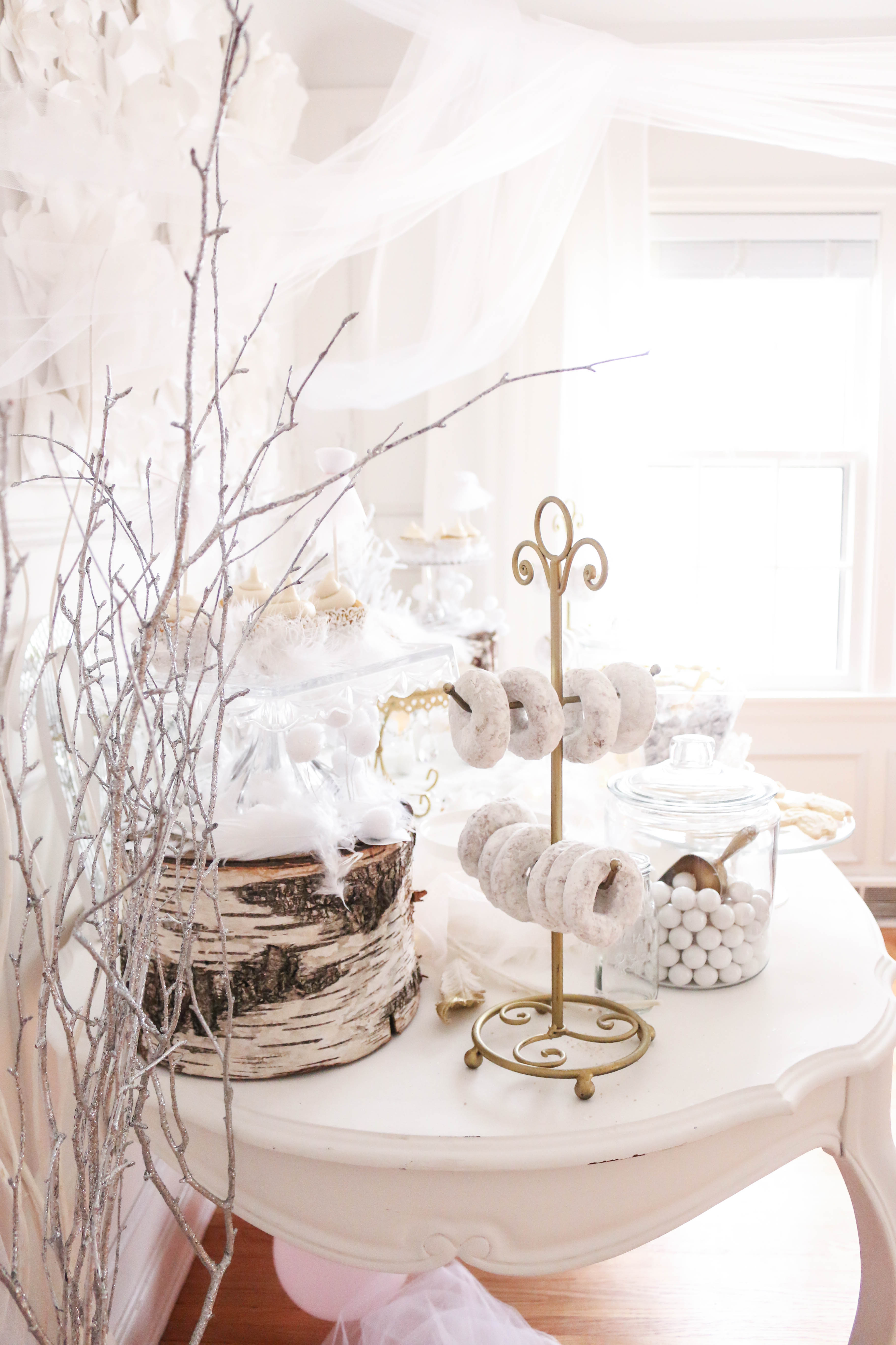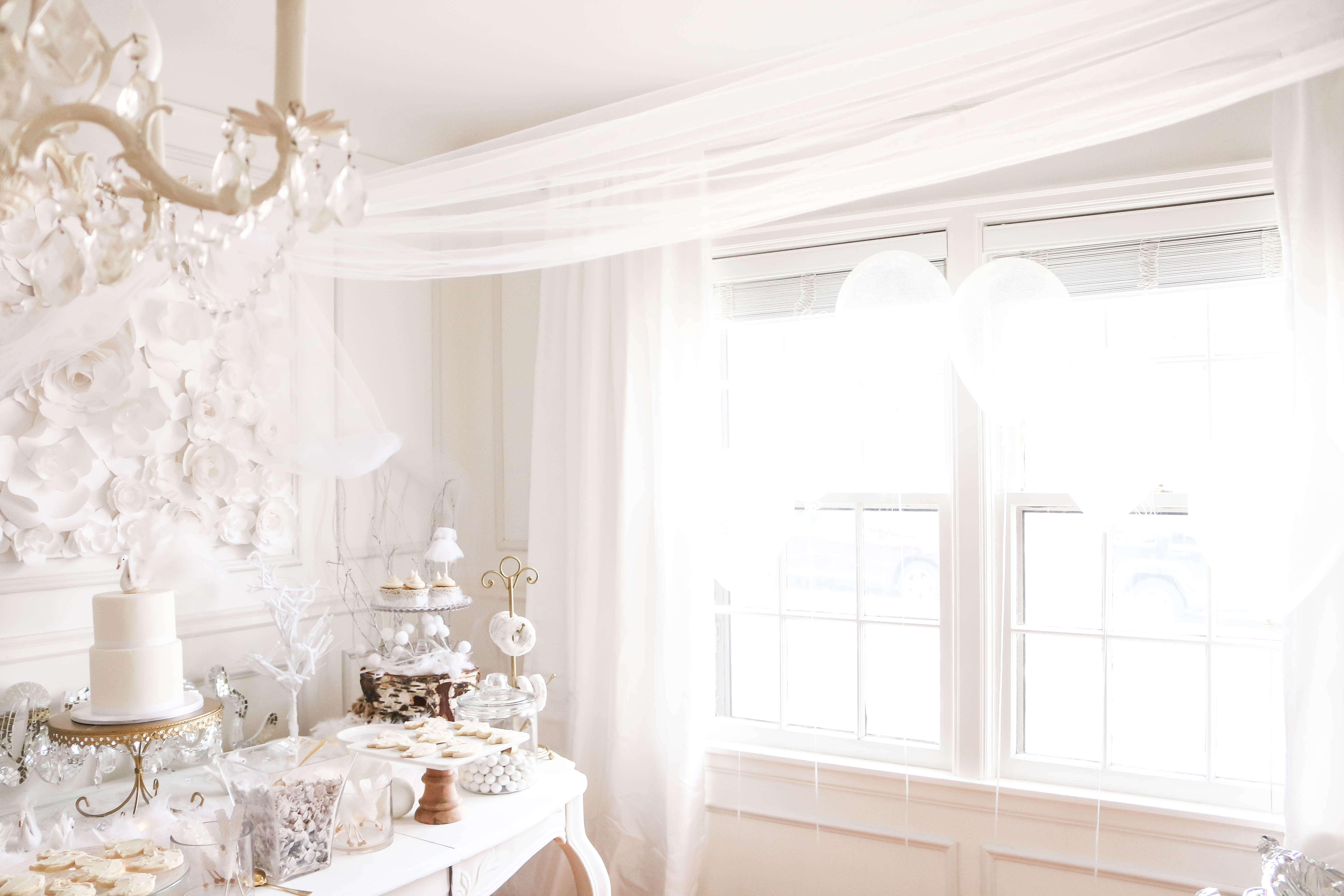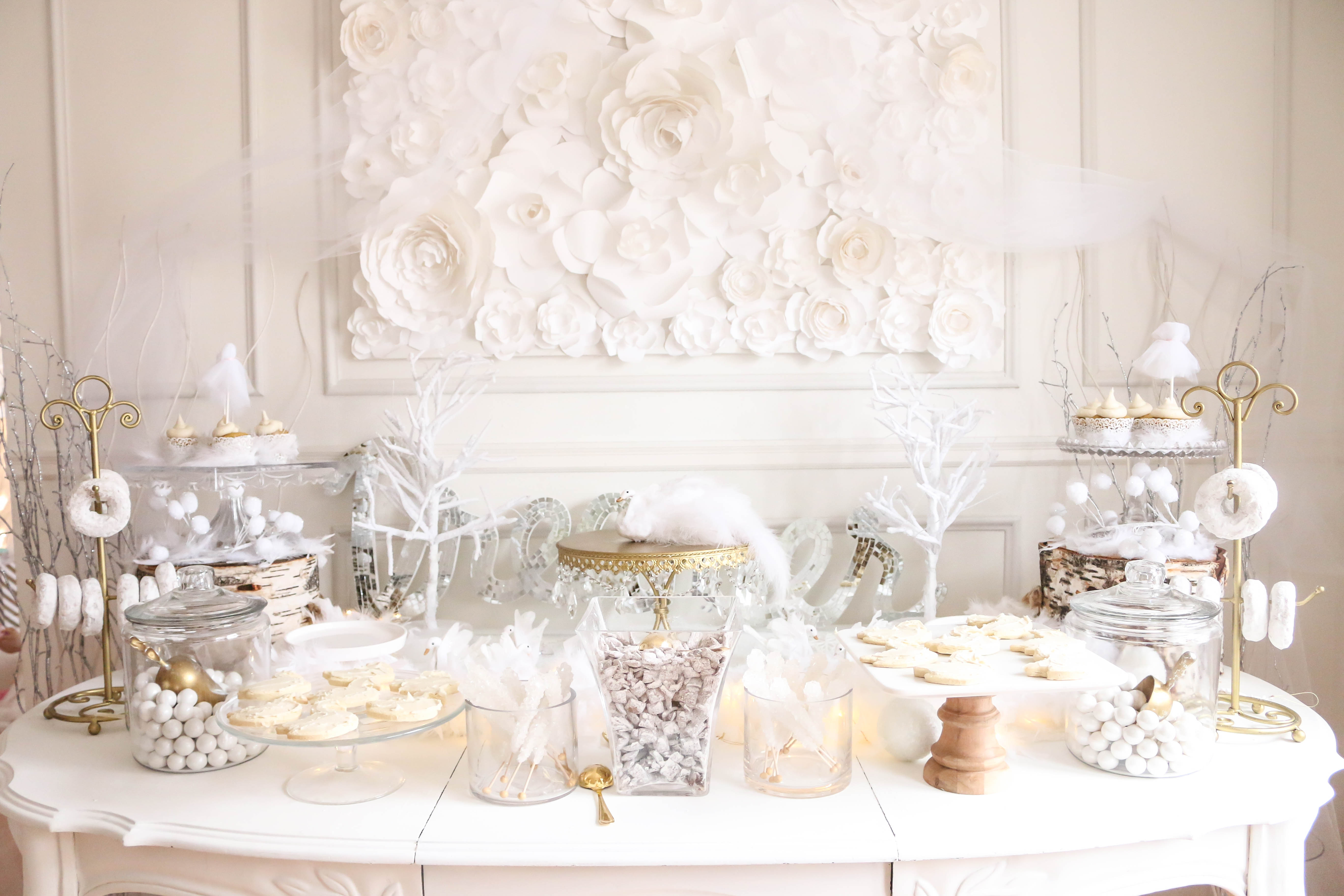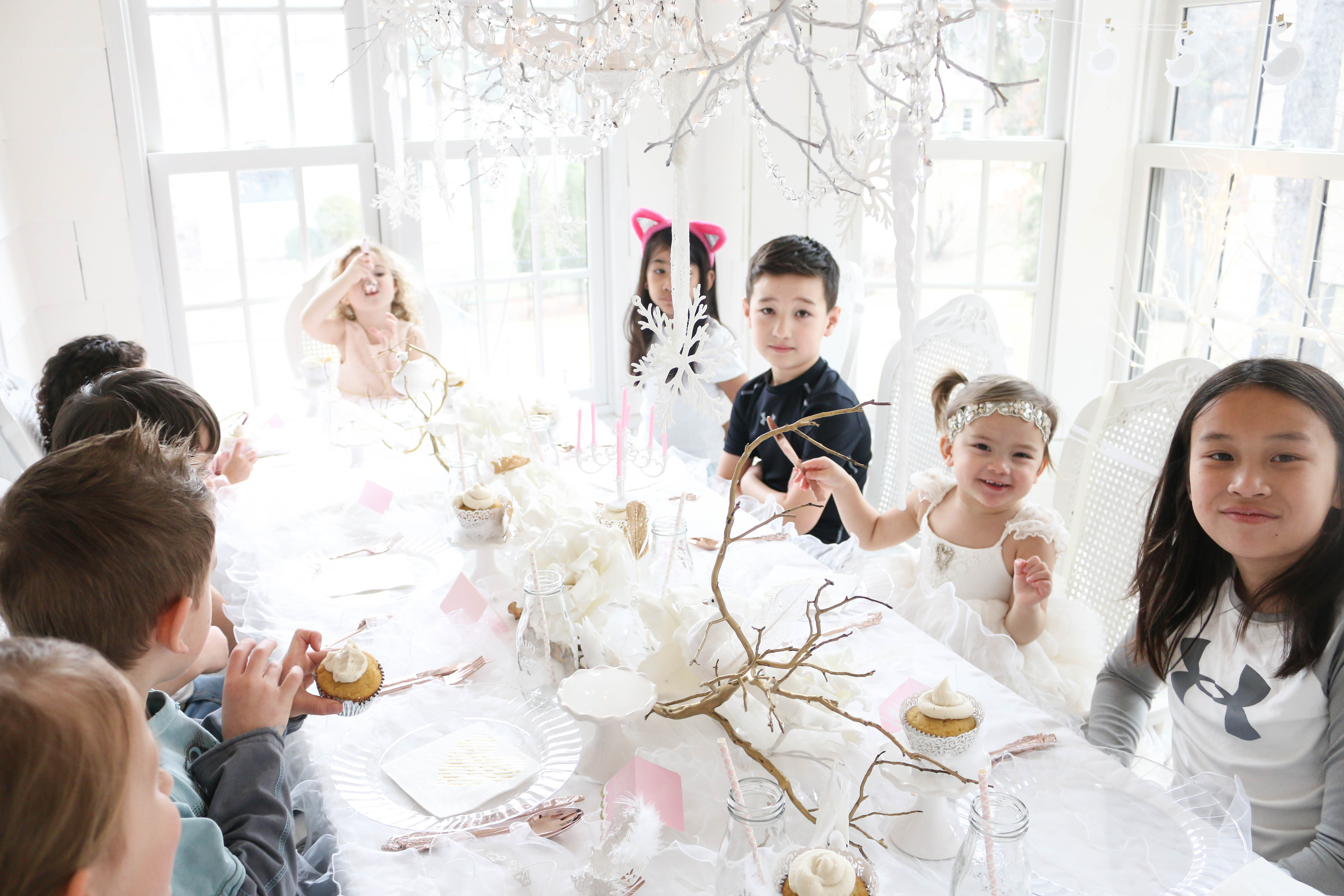 Bella had a swan lake party! It was a wintry party filled with feathered swans, white cookies, cupcakes, donuts and candy, swan ice sculptures, swan pinata and a white hot cocoa bar. The girls got to make feathered headbands with sequin ribbon and the boys had black swan masks! We turned our 3 season into a swan wintry wonderland for the little ones to enjoy their food. All the kids were asking if I made a pinata again this year, and I'm so glad that I stayed up making one the night (or morning) before her party. My husband thought I was crazy constructing a swan at midnight!