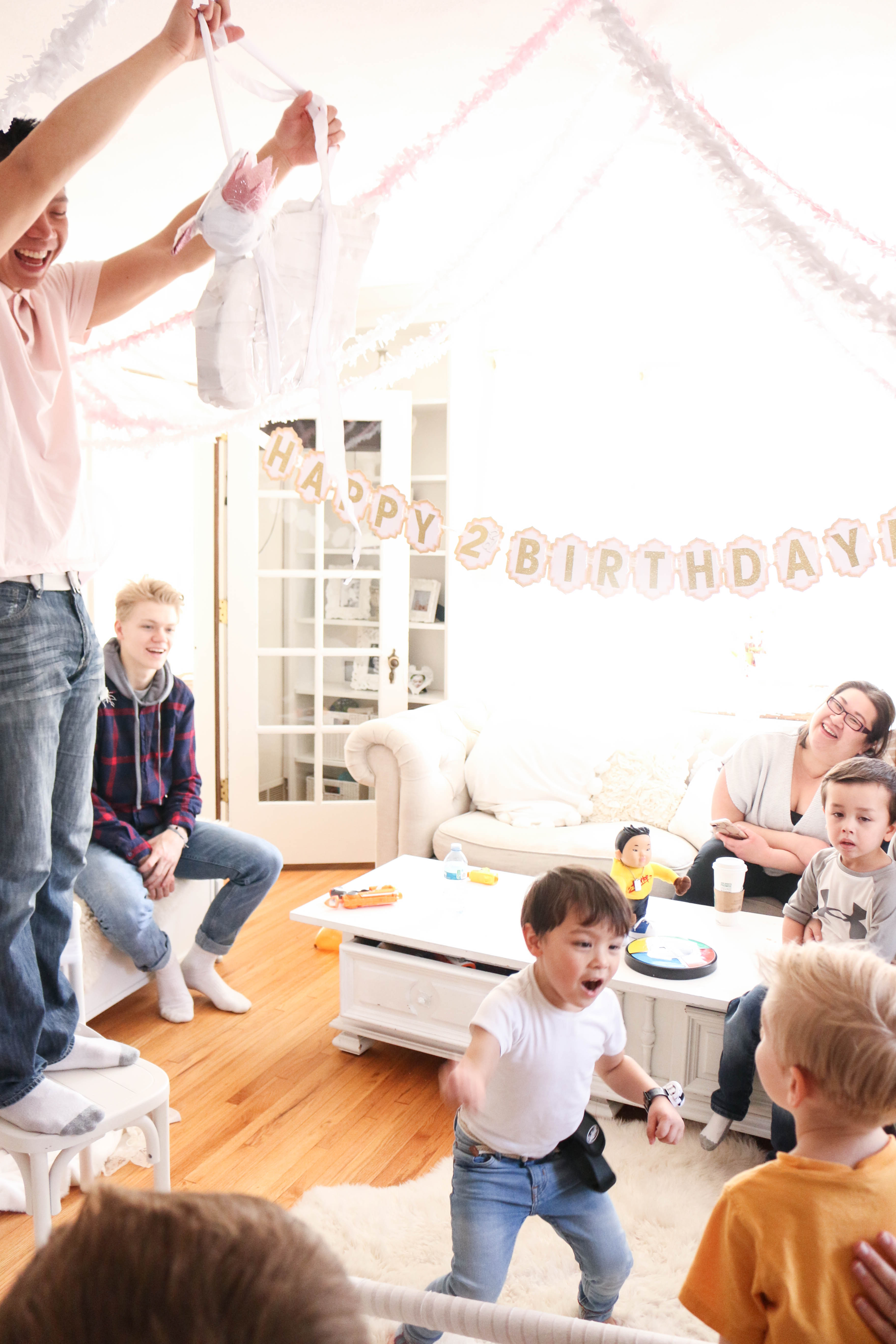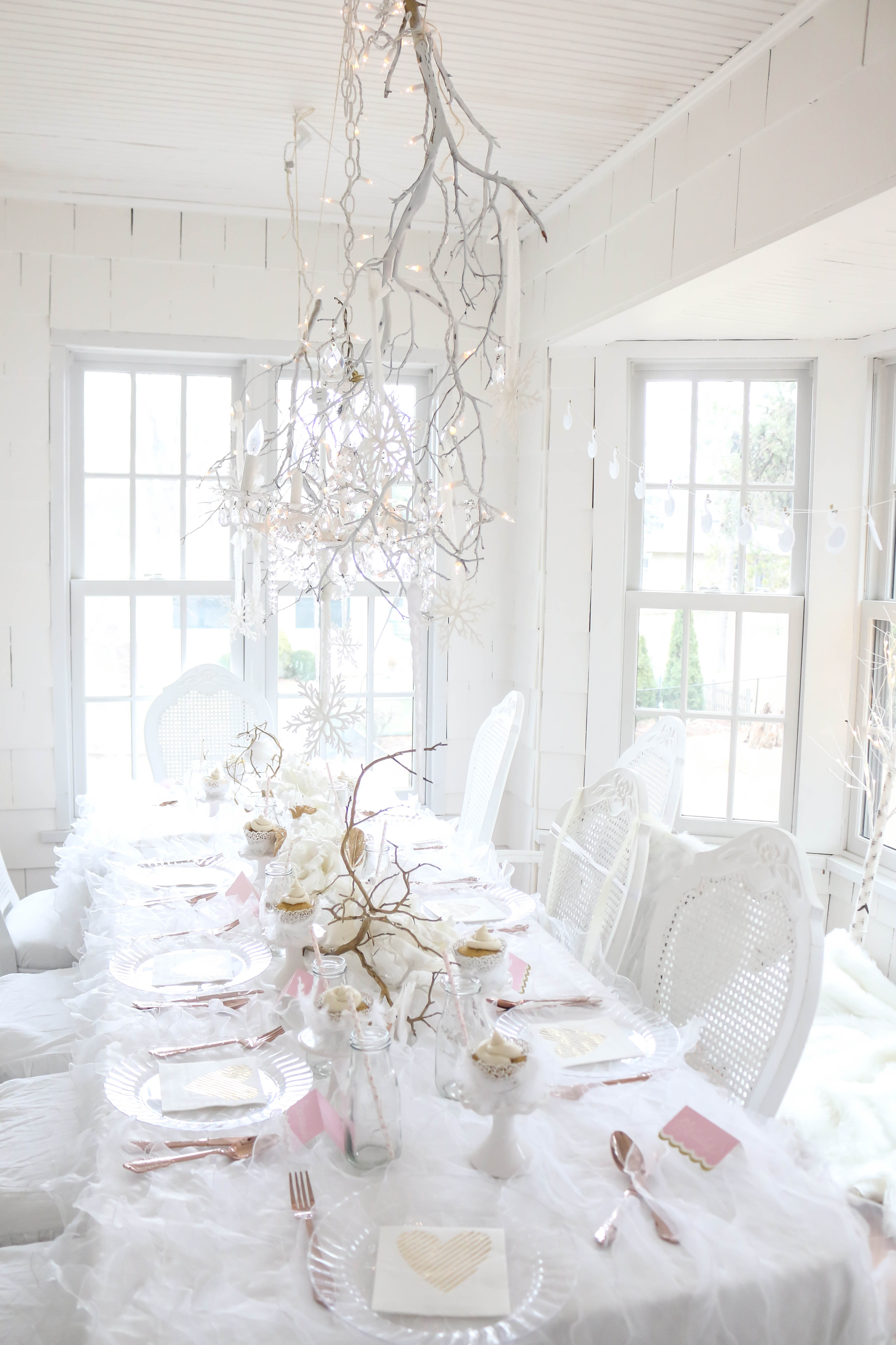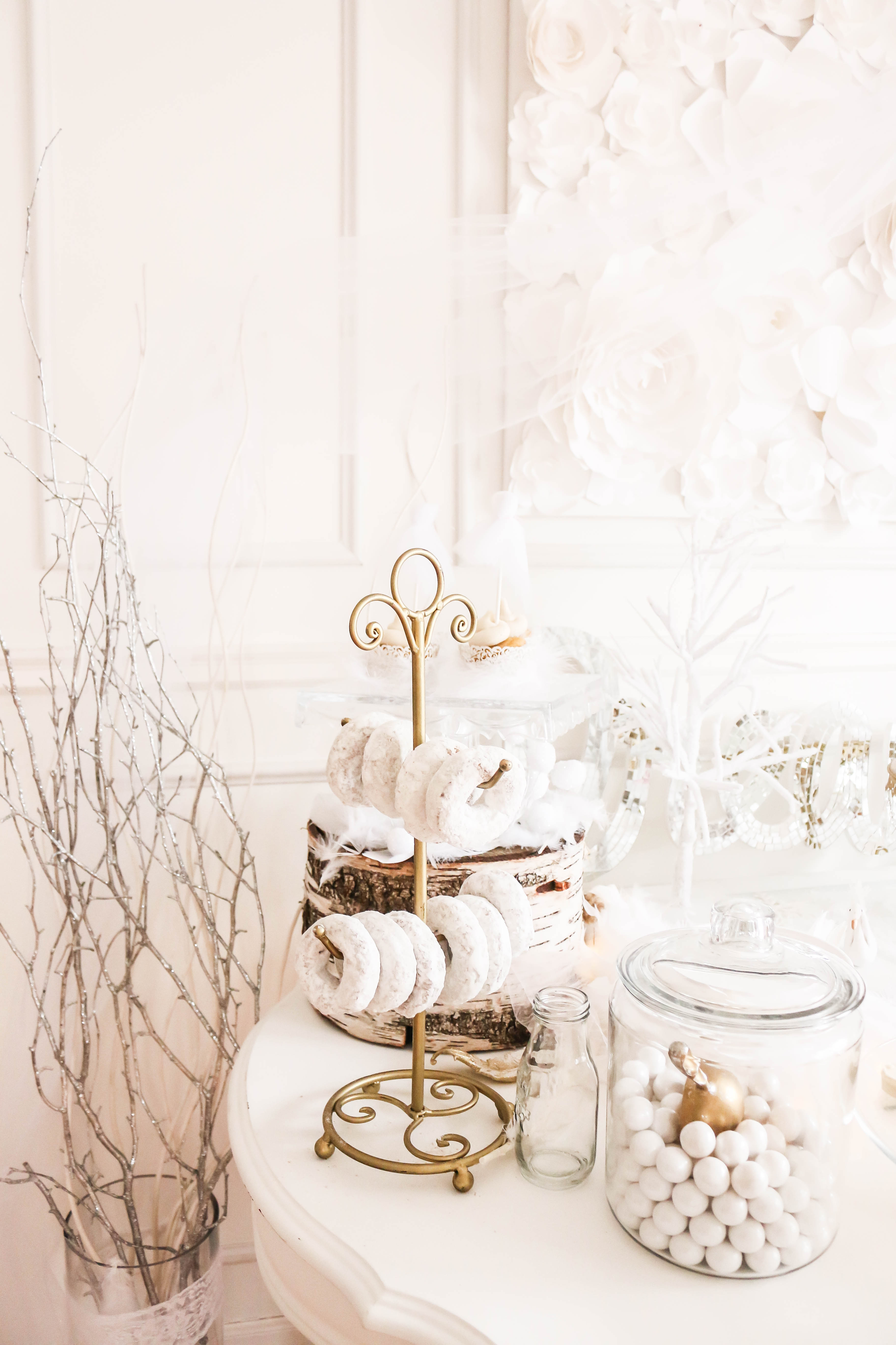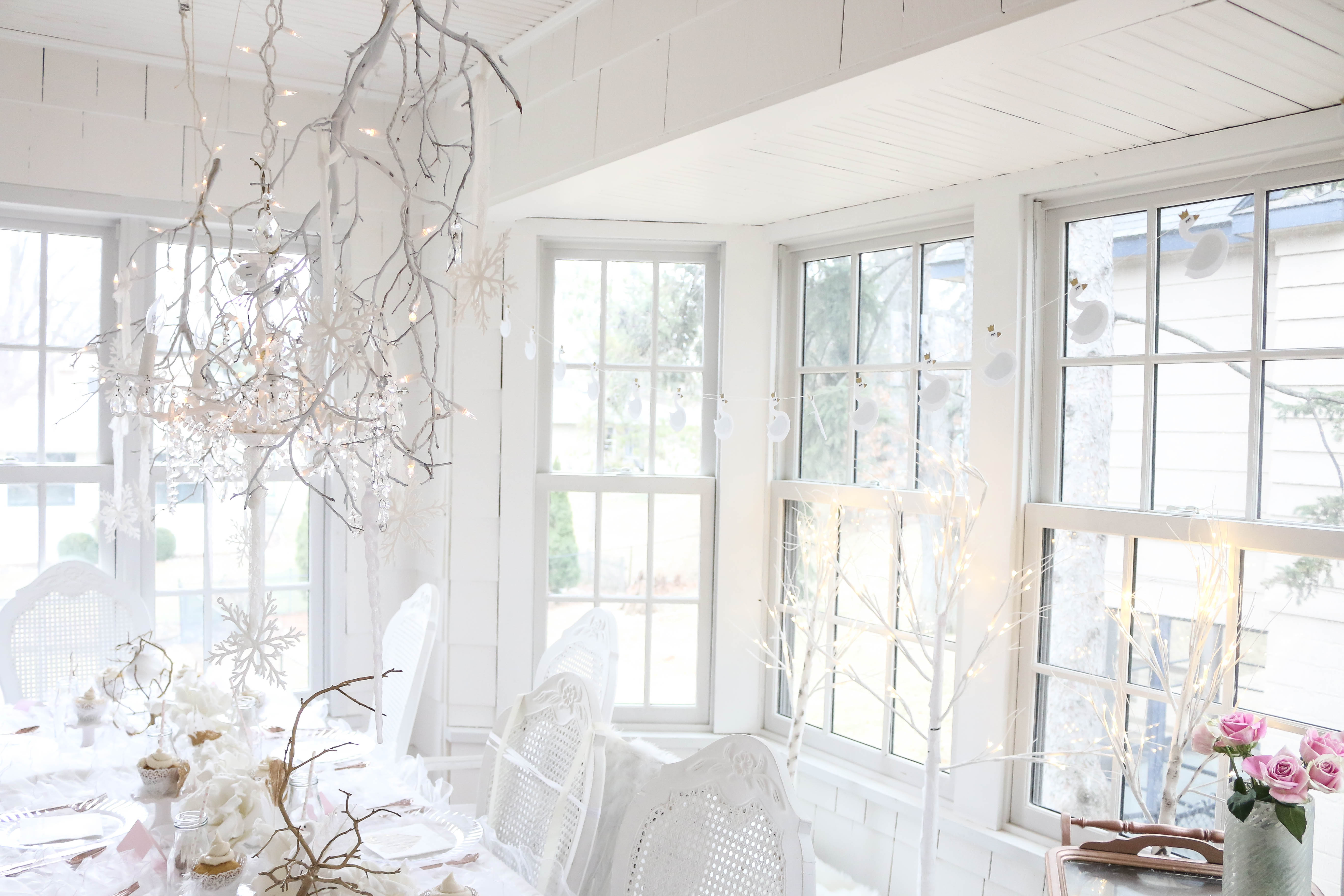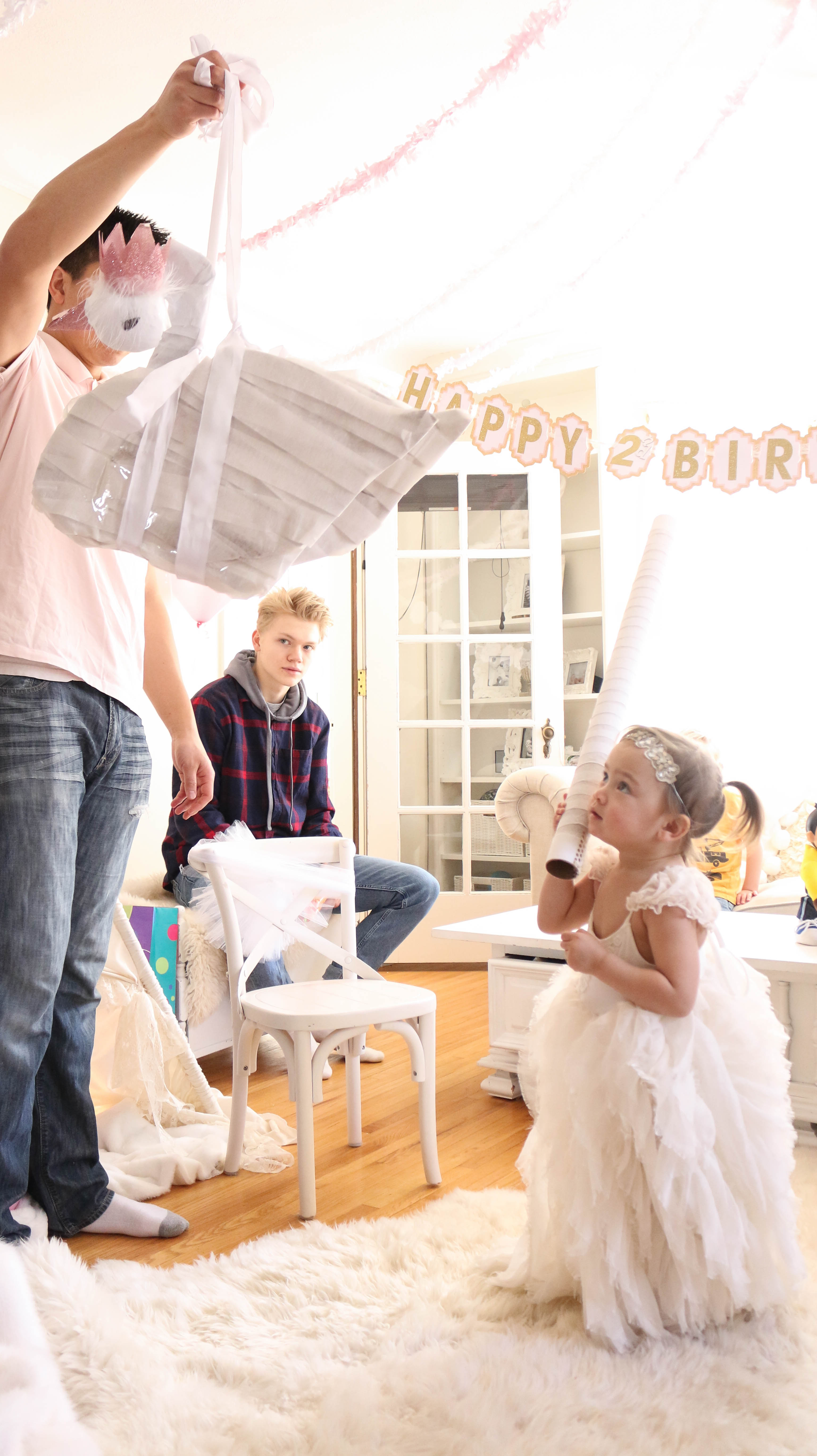 Bella had a swan lake party! It was a wintry party filled with feathered swans, white cookies, cupcakes, donuts and candy, swan ice sculptures, swan pinata and a white hot cocoa bar. The girls got to make feathered headbands with sequin ribbon and the boys had black swan masks! We turned our 3 season into a swan wintry wonderland for the little ones to enjoy their food. All the kids were asking if I made a pinata again this year, and I'm so glad that I stayed up making one the night (or morning) before her party. My husband thought I was crazy constructing a swan at midnight!
