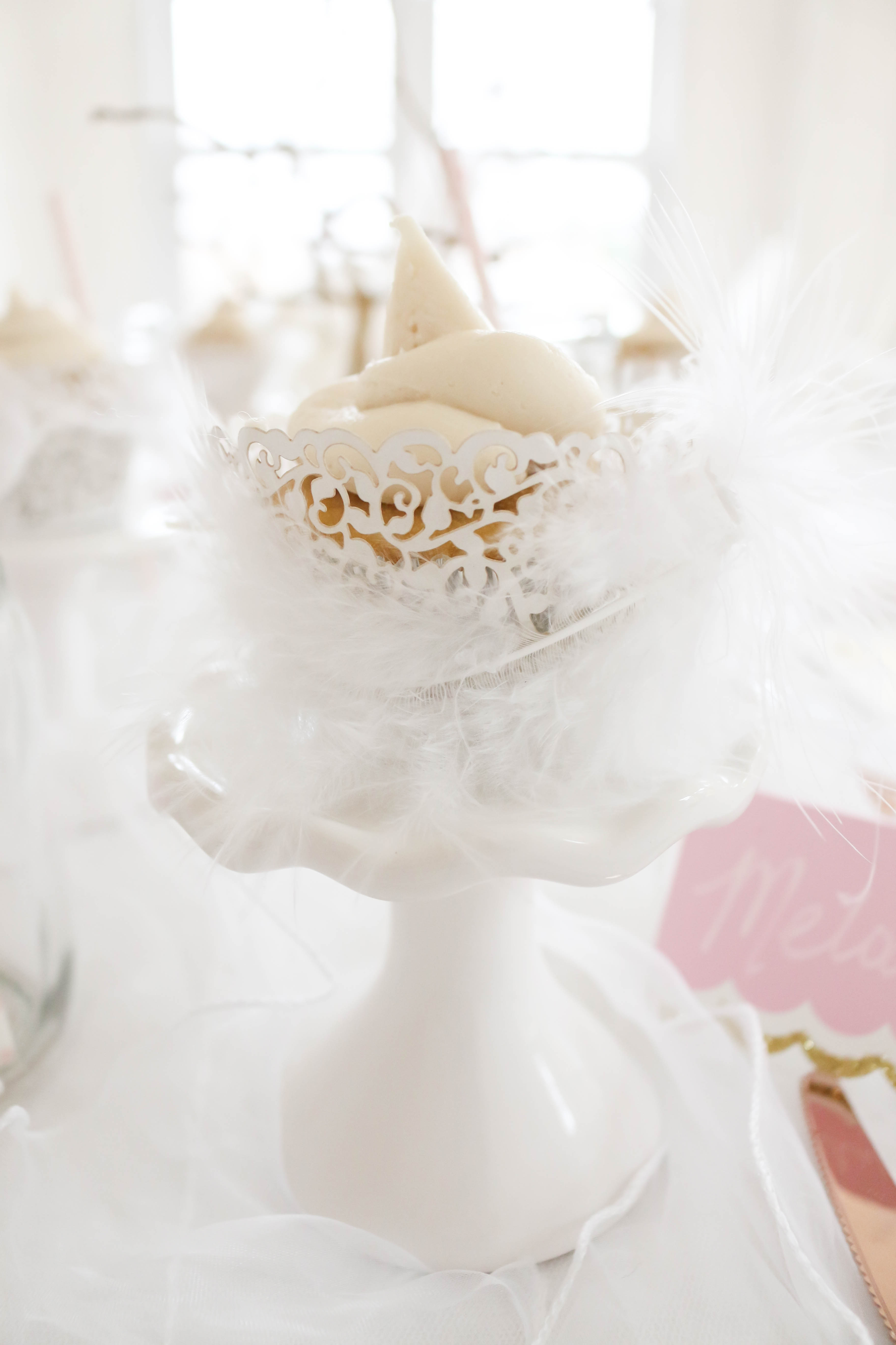 Lace Cupcake Holders (I hot glued feathers to the outside)