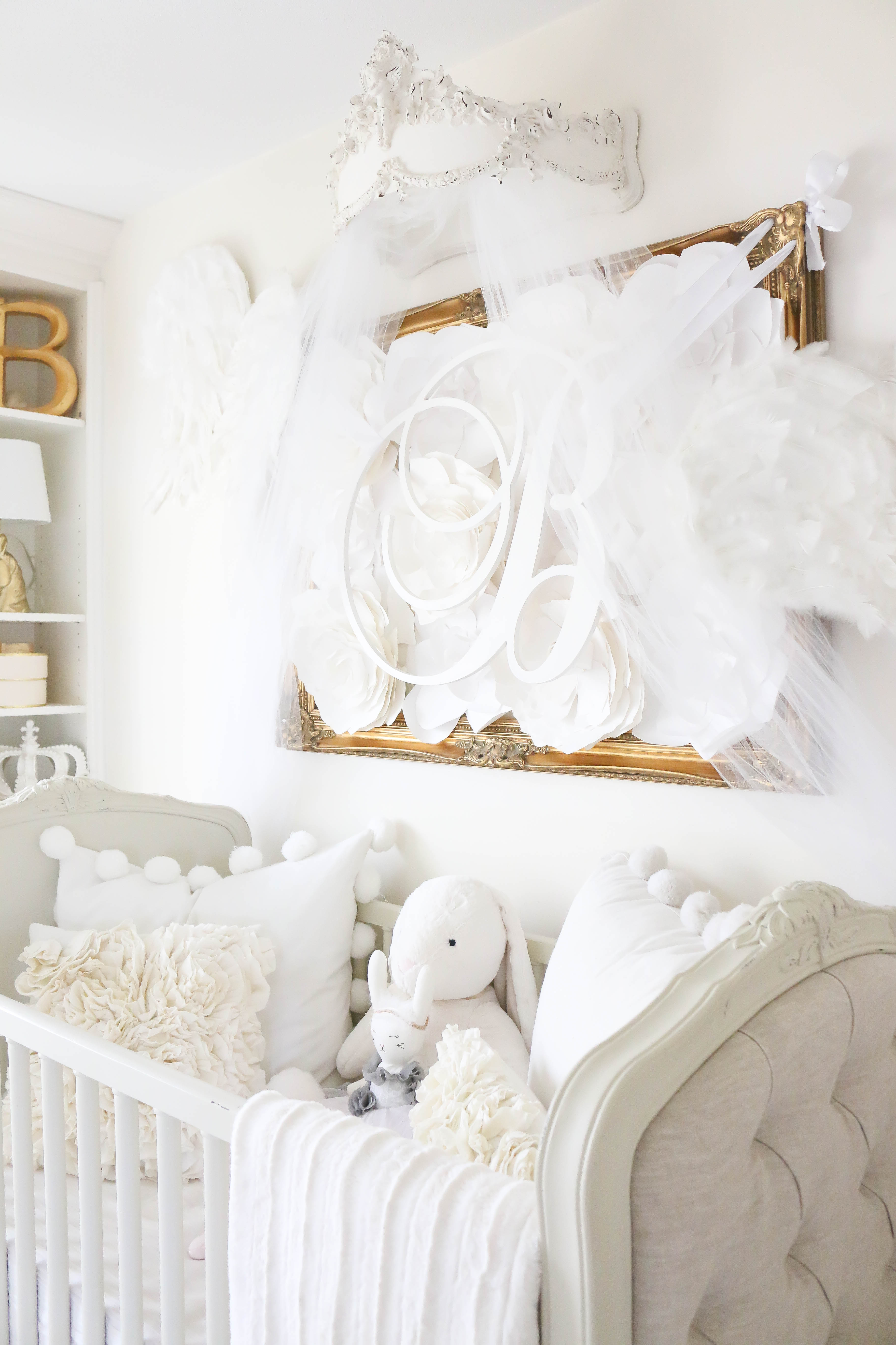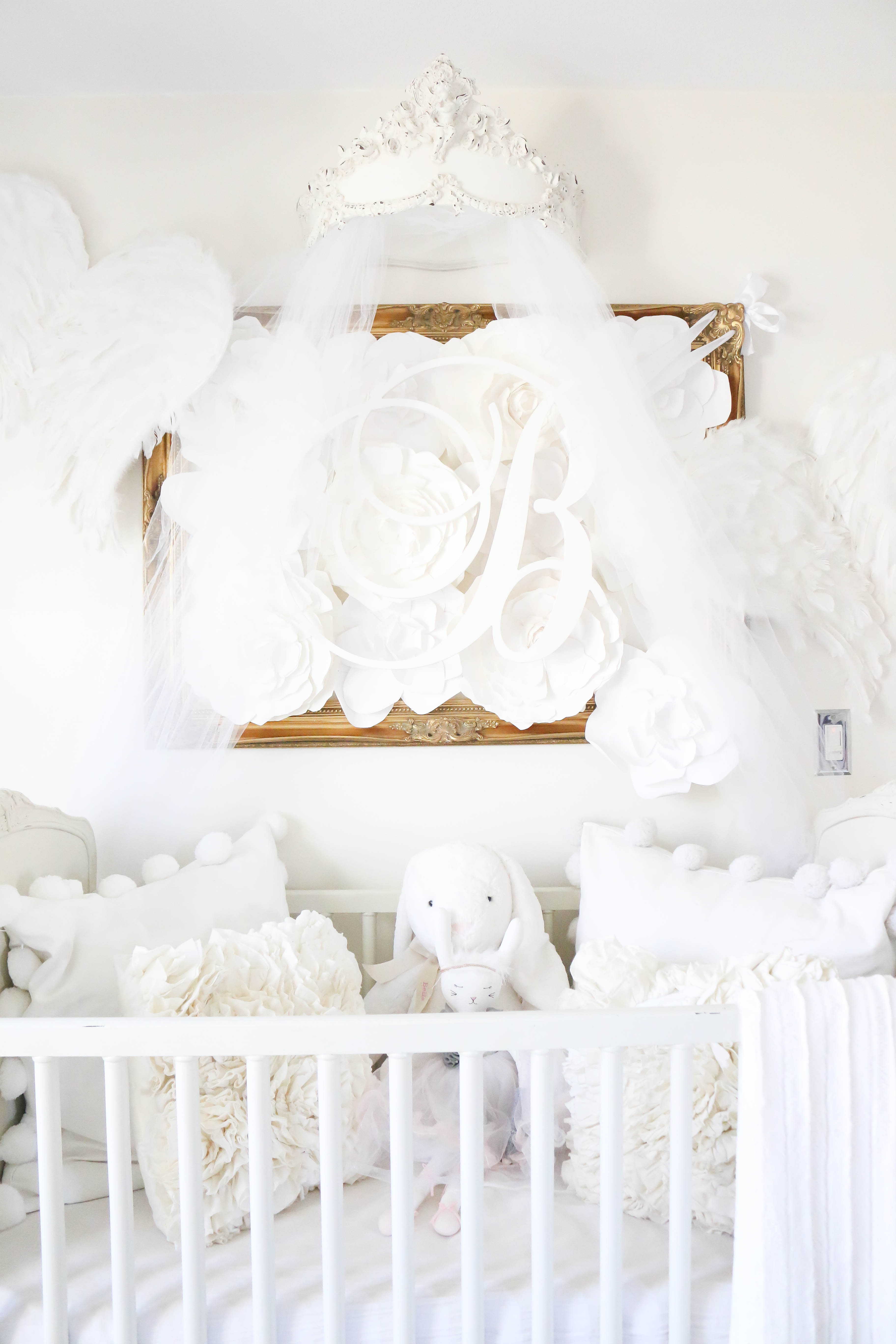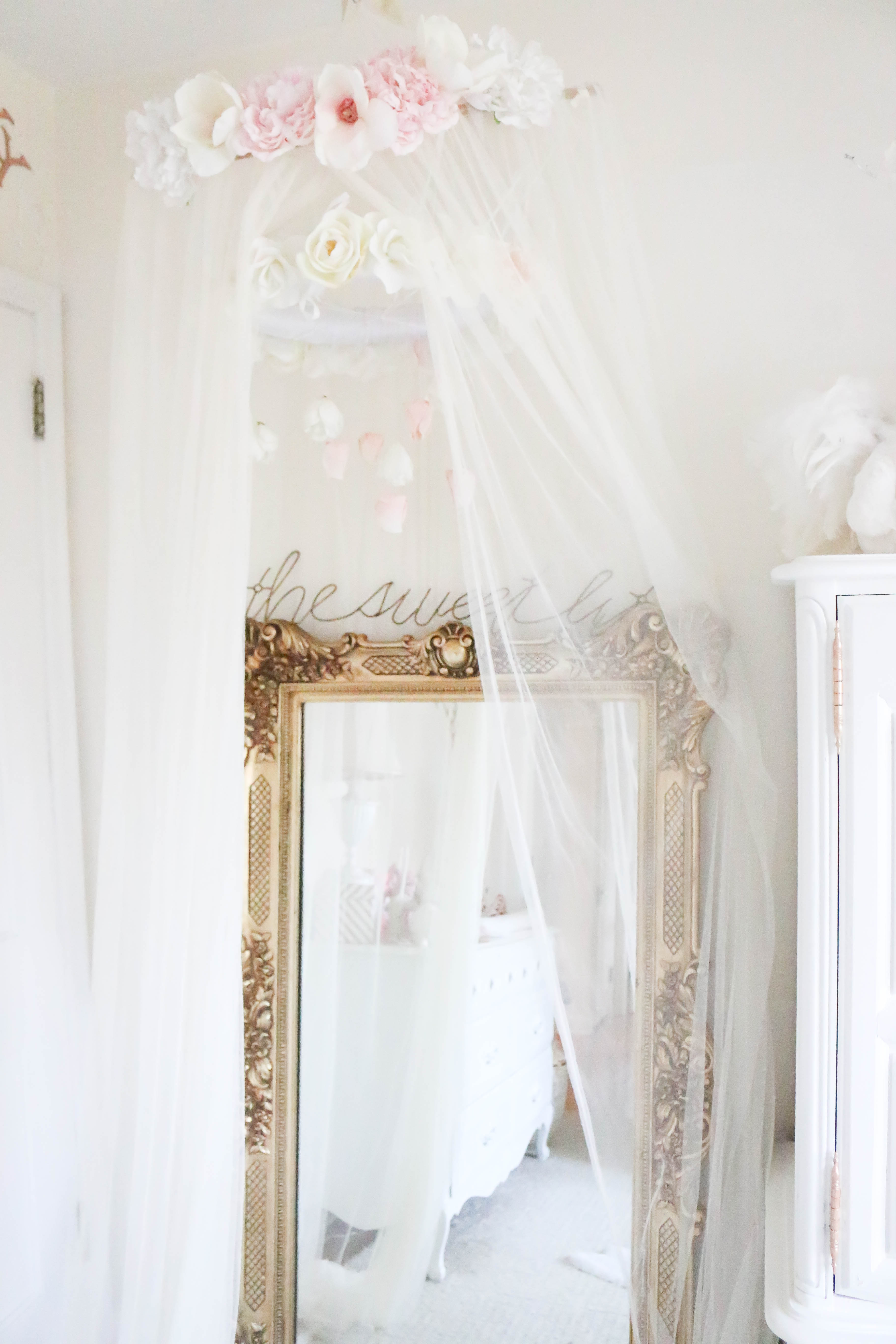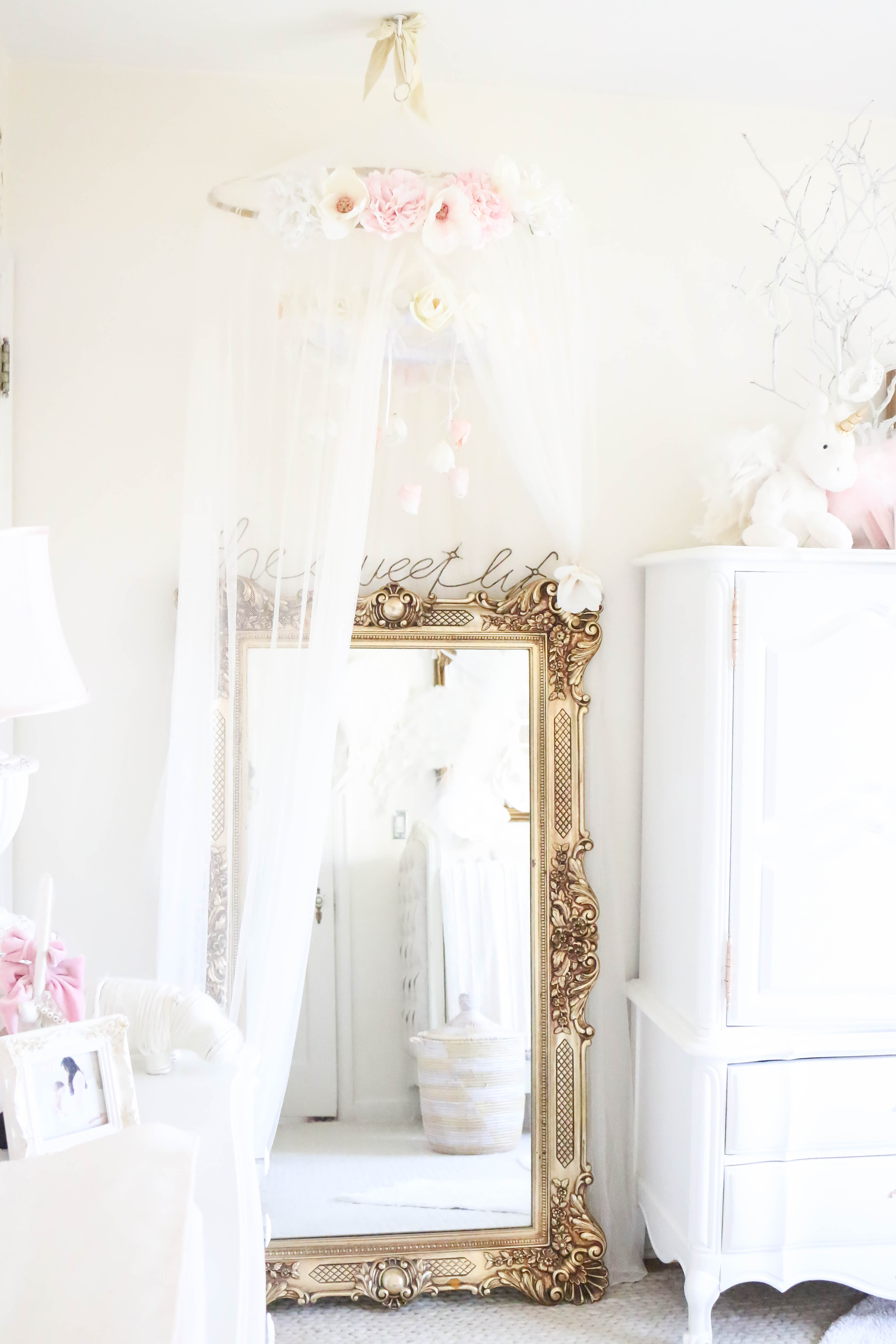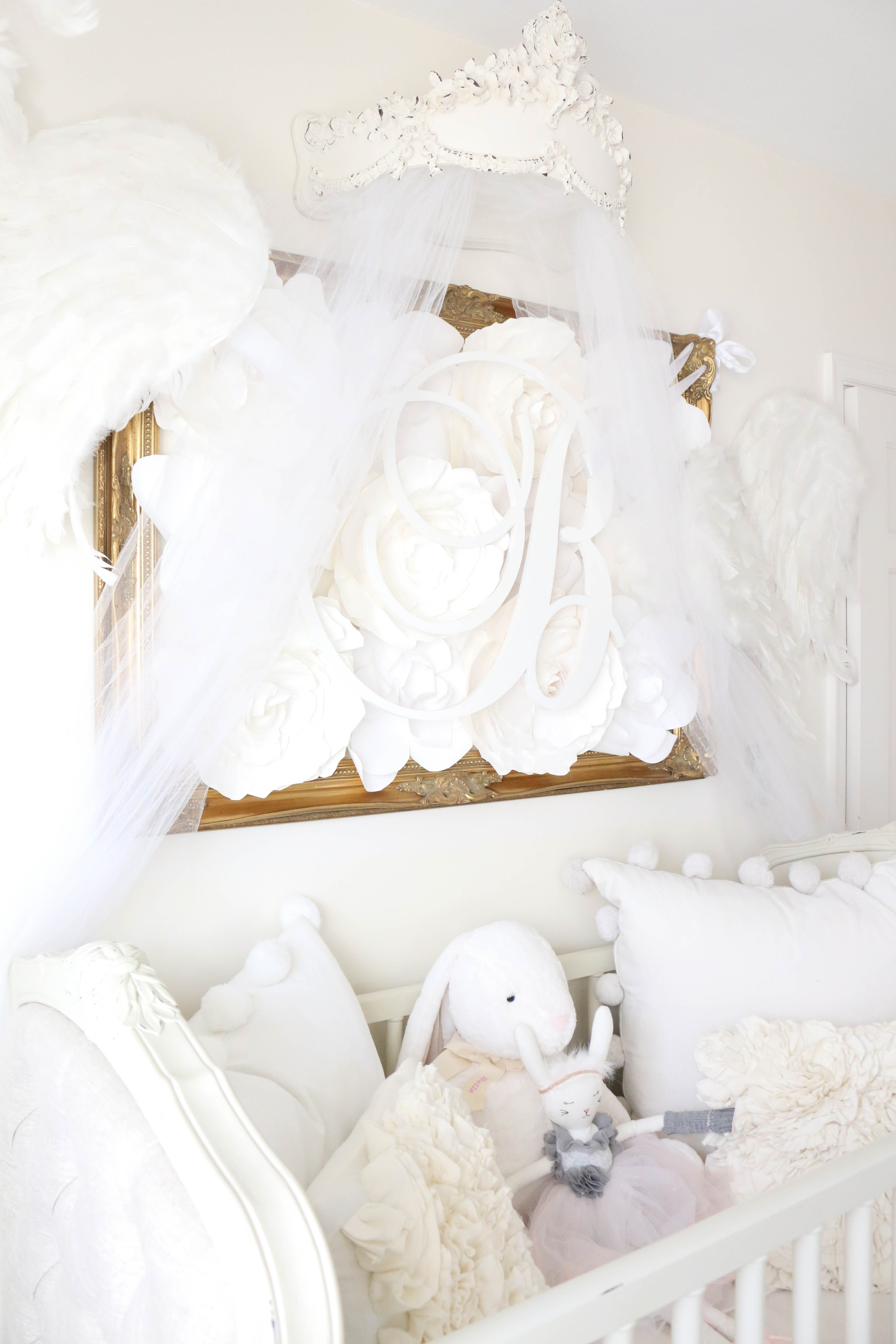 Hi everyone!! So I've been wanting to change a few things in Bella's dreamland nursery ever since I came across this vintage crown cornice that I found at a cute vintage shop! I finally gained up the nerve to change her room just a bit and so happy that I did! I moved the canopy that was over her bed and draped it over her large gold mirror. I then hung the cornice over her crib and put some paper flowers behind her letter 'B'.