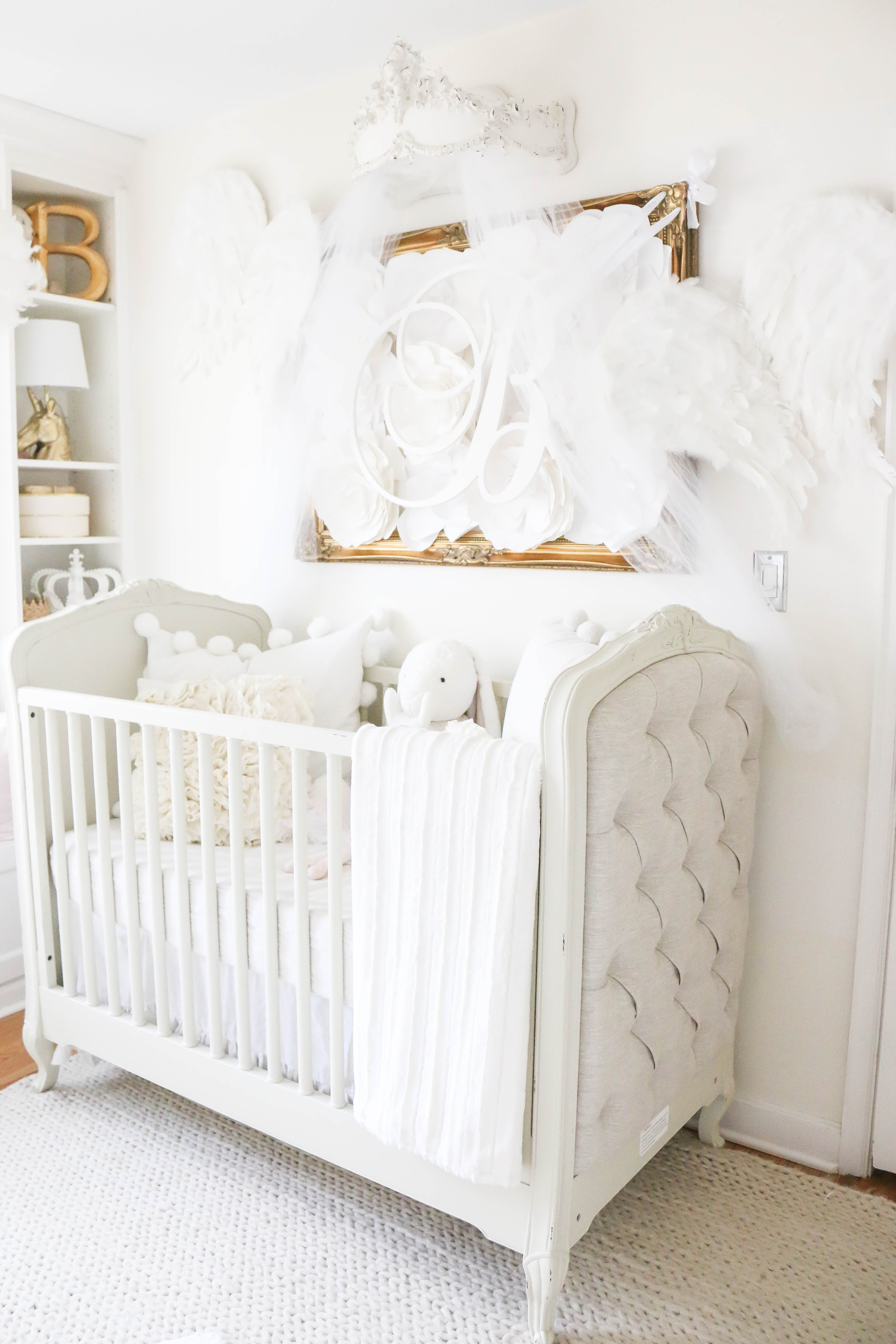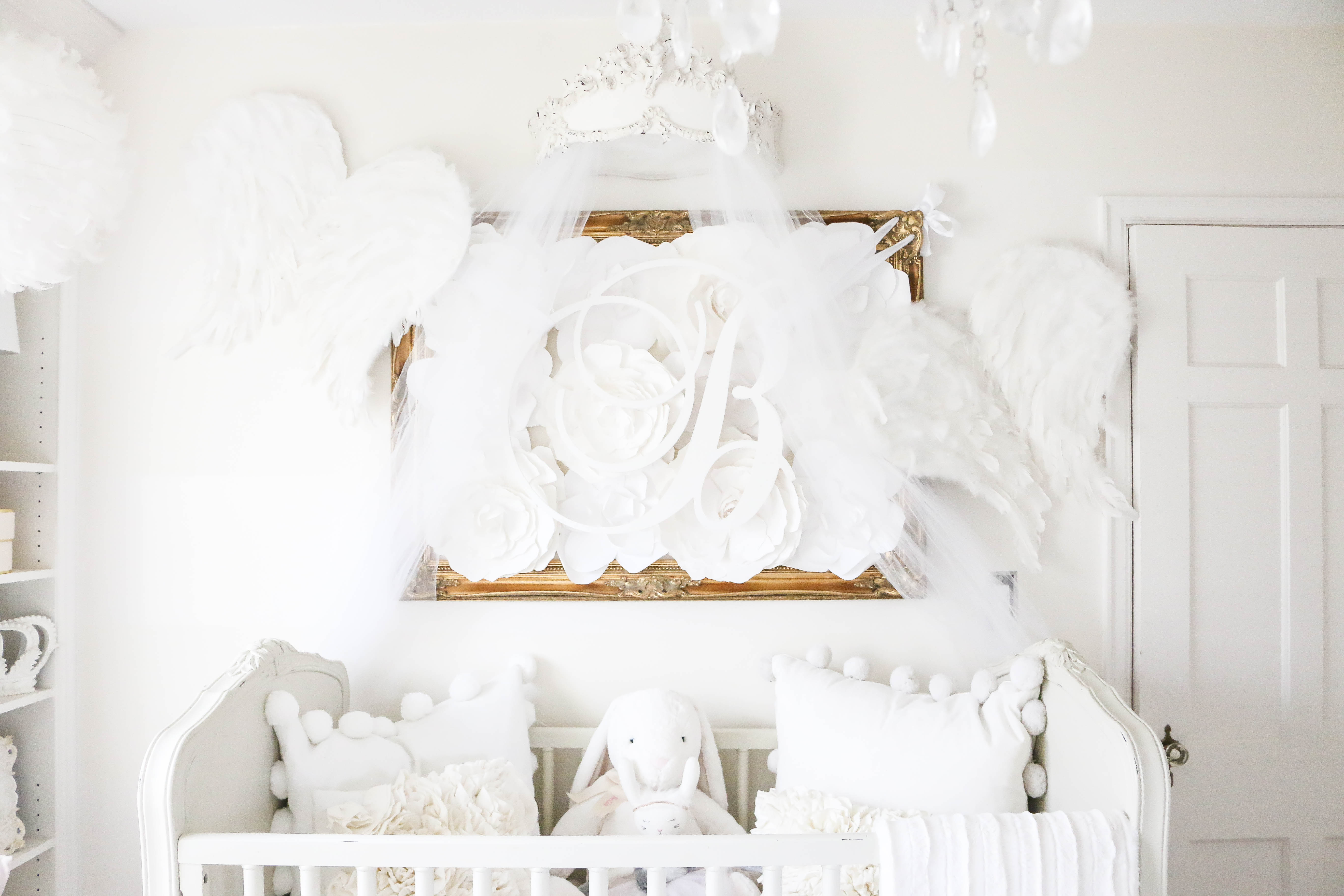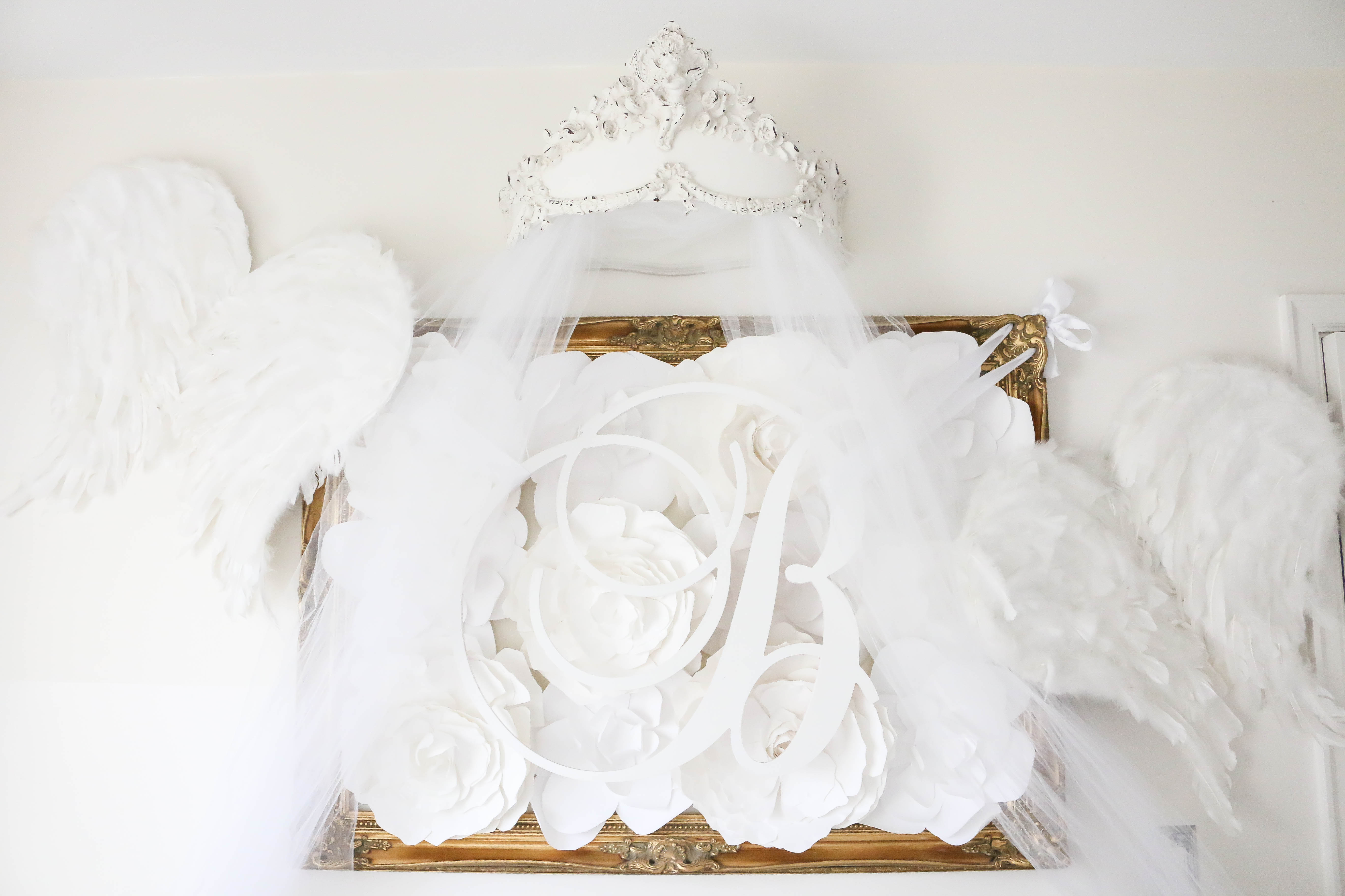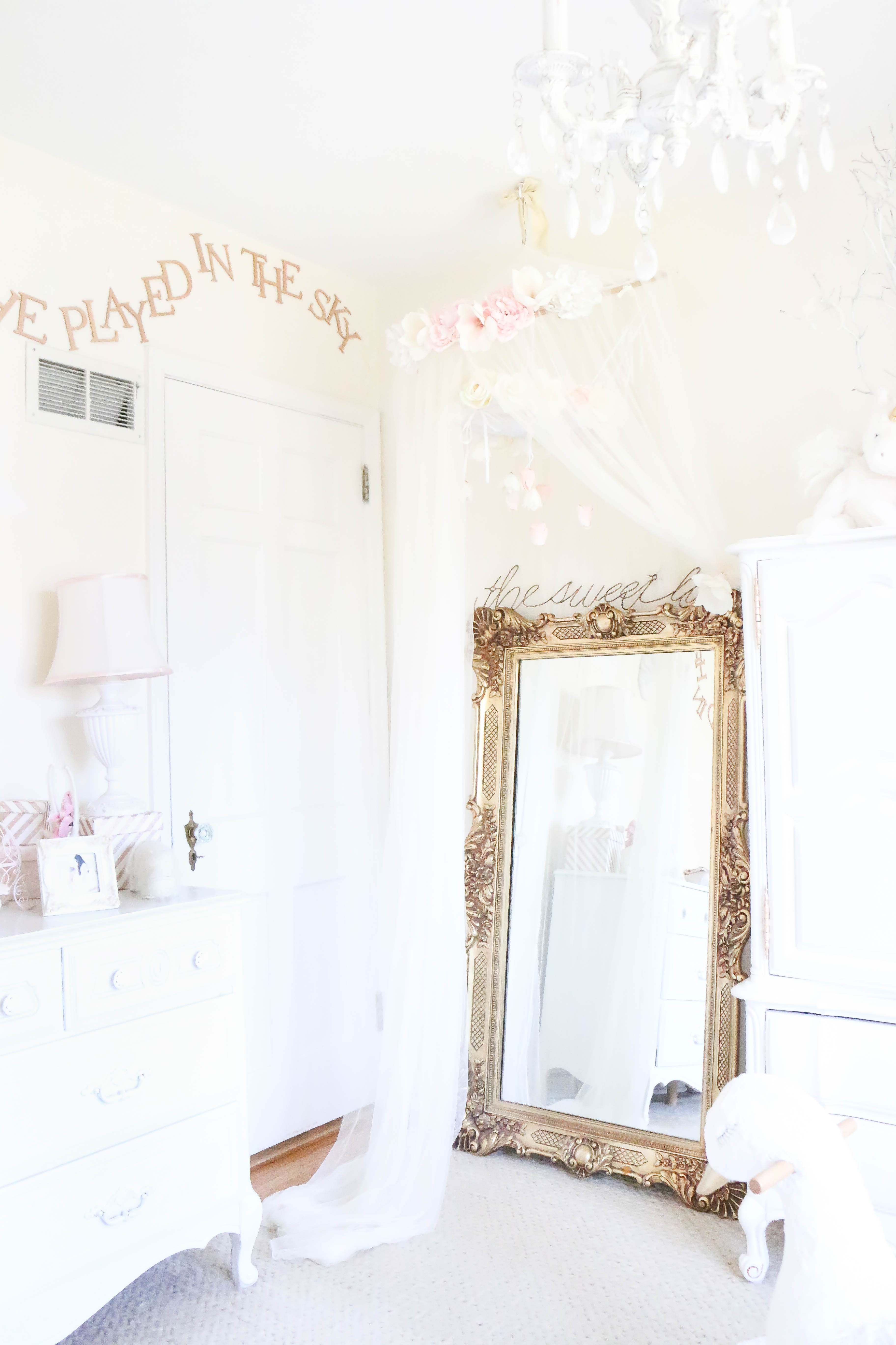 Hi everyone!! So I've been wanting to change a few things in Bella's dreamland nursery ever since I came across this vintage crown cornice that I found at a cute vintage shop! I finally gained up the nerve to change her room just a bit and so happy that I did! I moved the canopy that was over her bed and draped it over her large gold mirror. I then hung the cornice over her crib and put some paper flowers behind her letter 'B'.