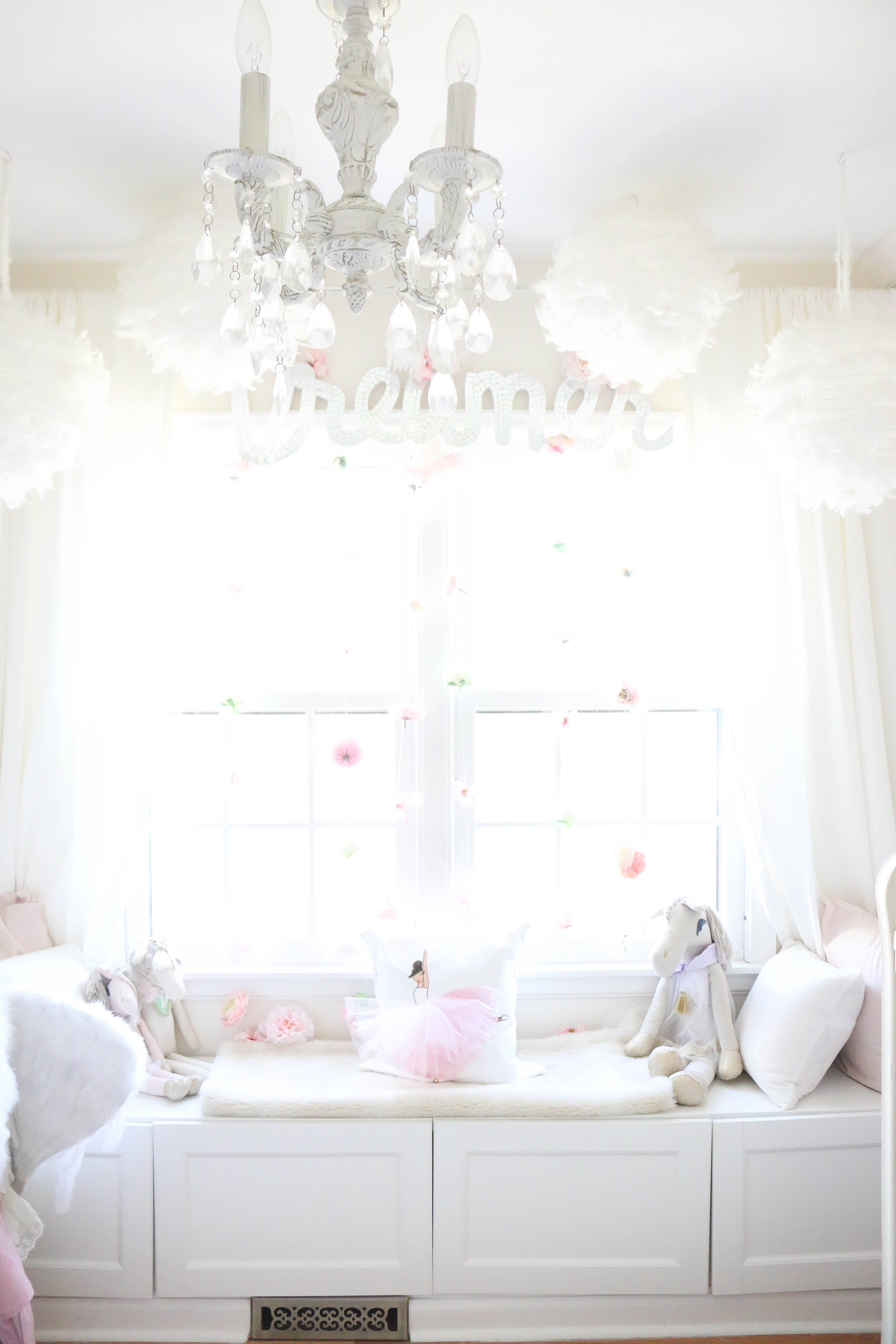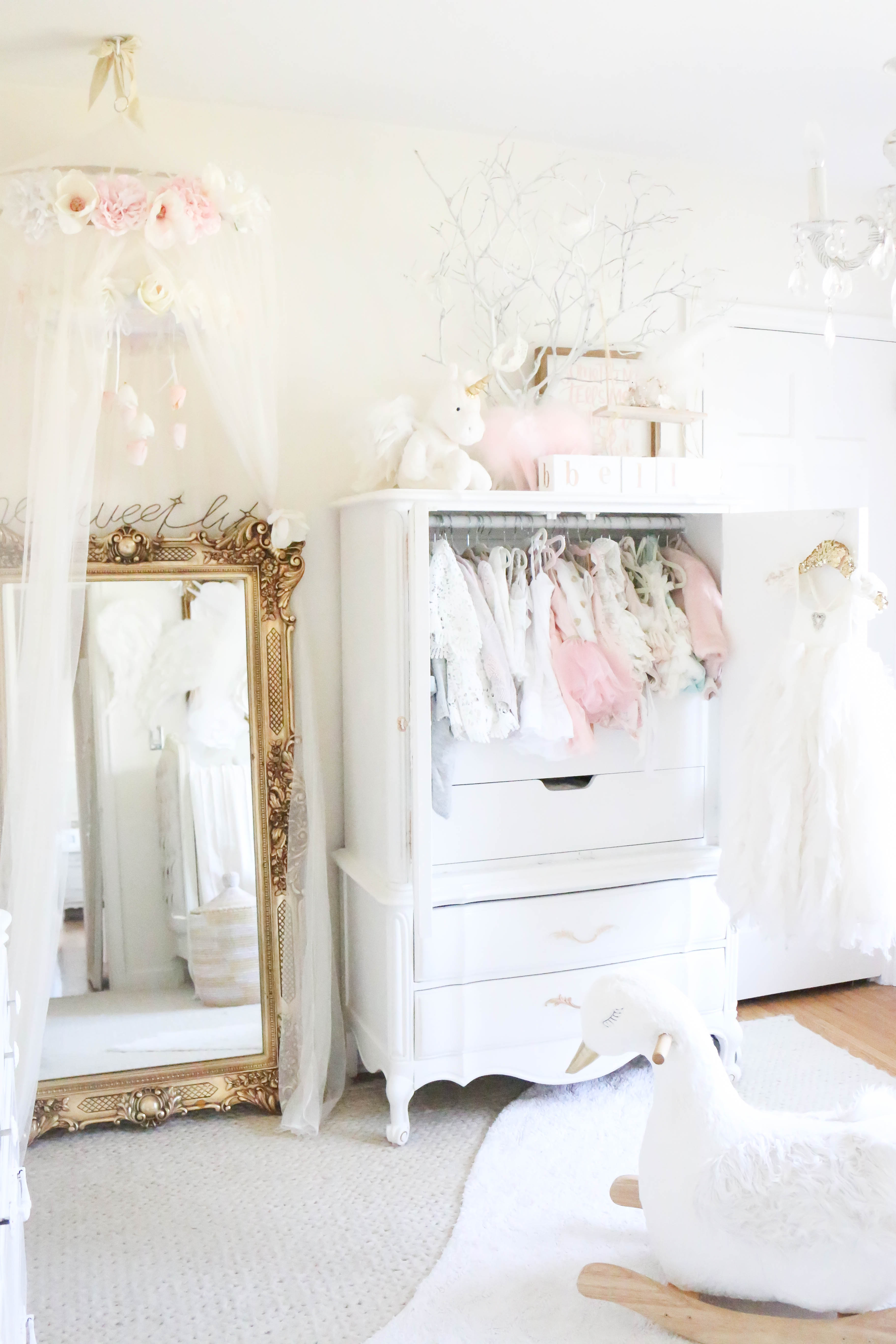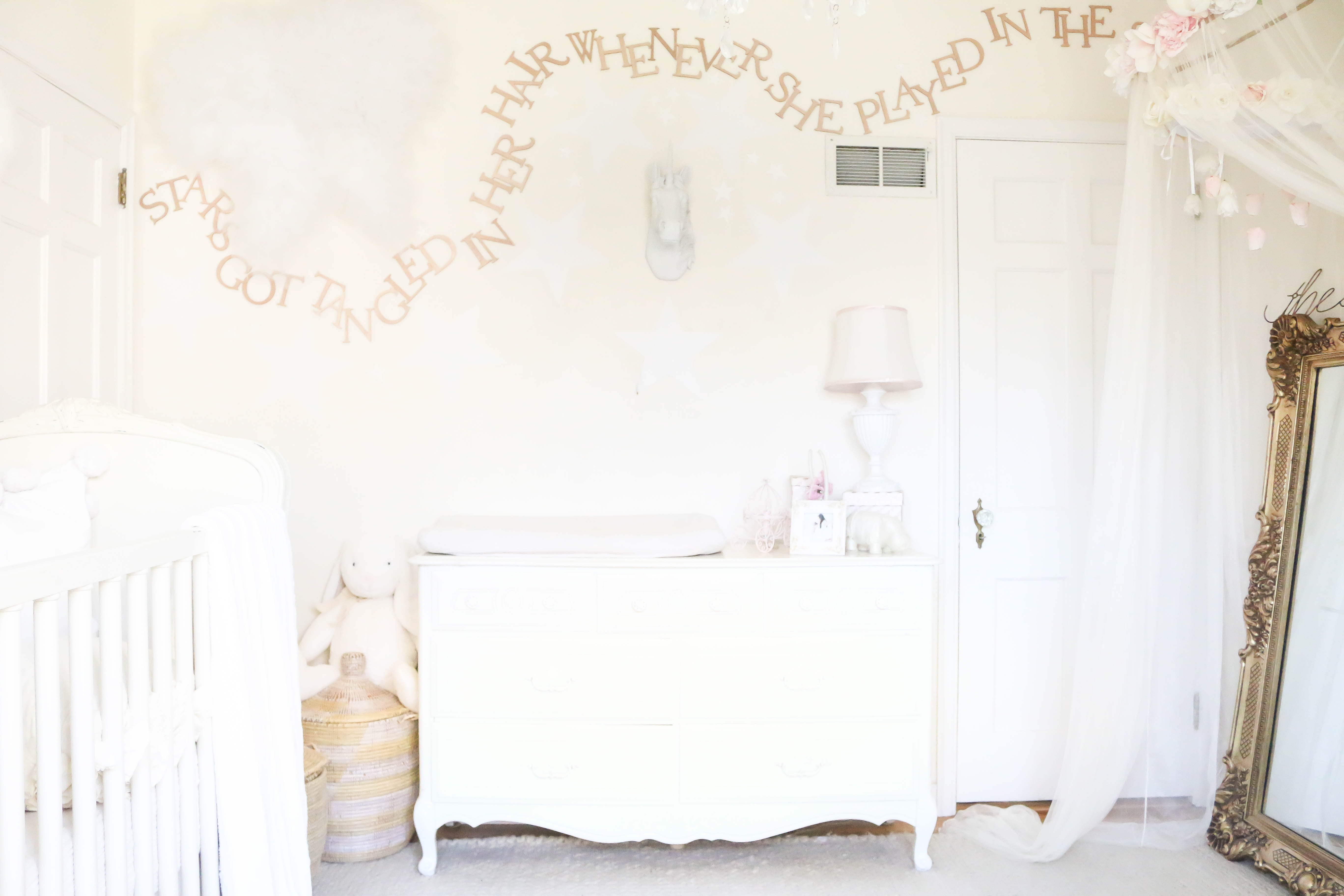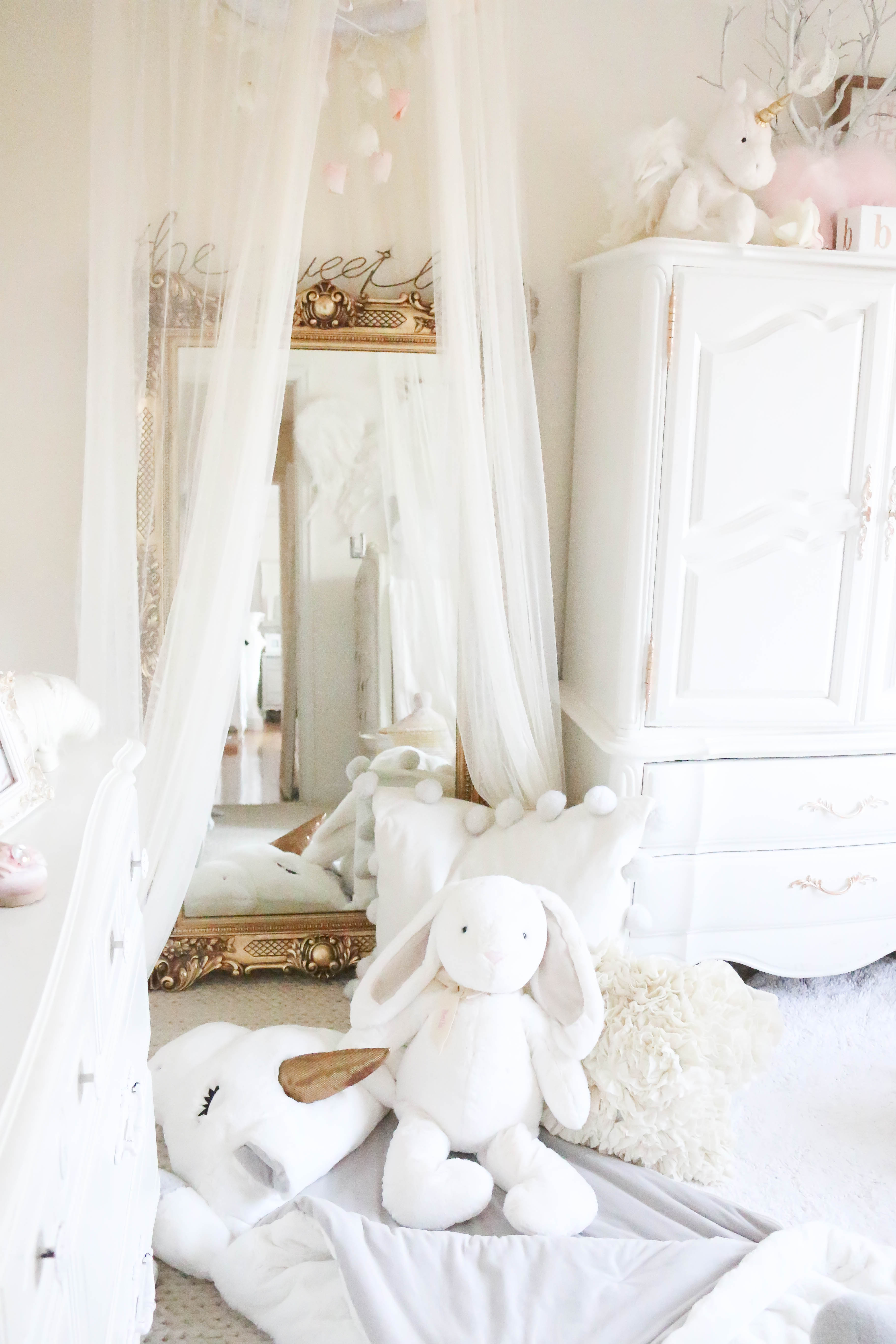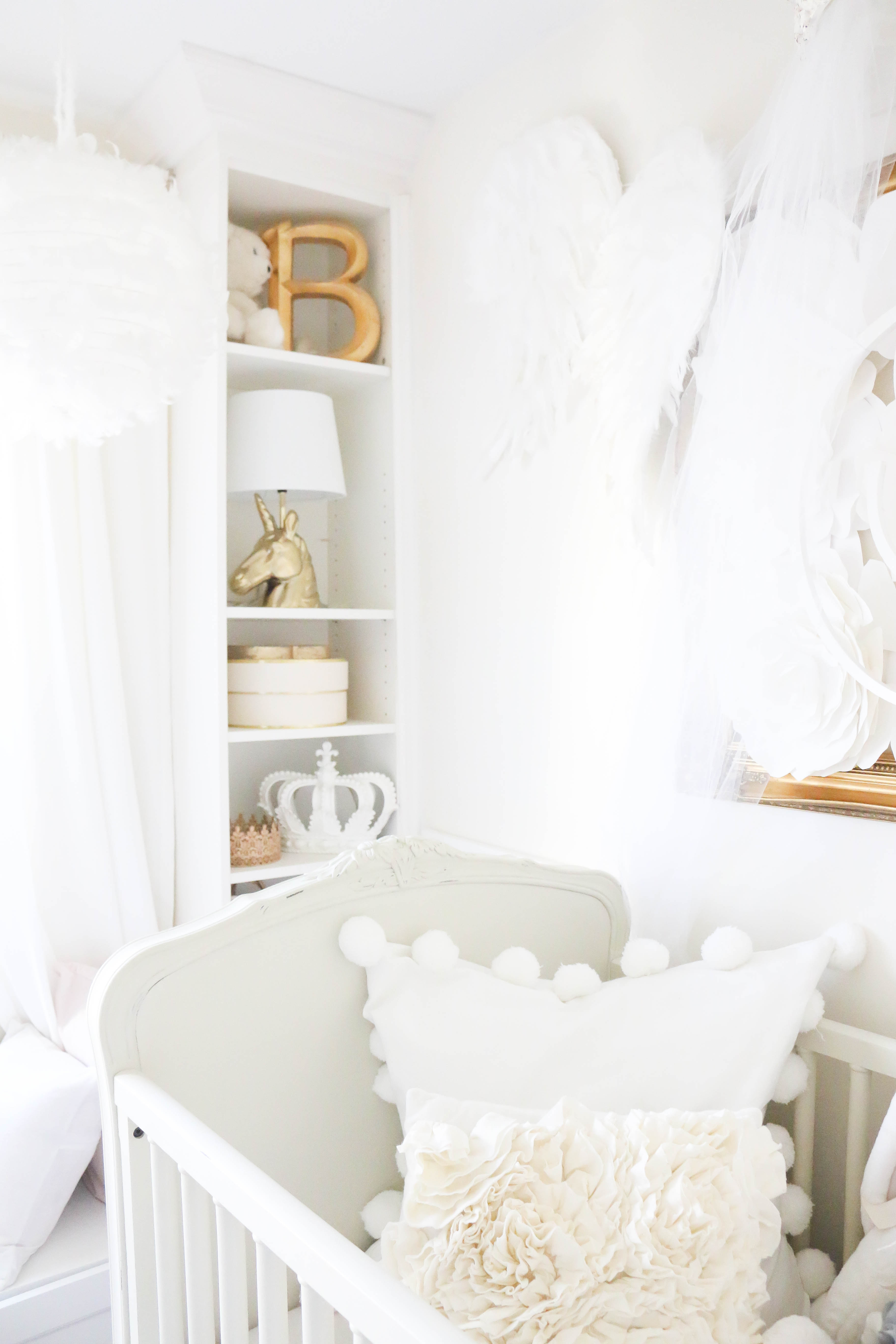 Hi everyone!! So I've been wanting to change a few things in Bella's dreamland nursery ever since I came across this vintage crown cornice that I found at a cute vintage shop! I finally gained up the nerve to change her room just a bit and so happy that I did! I moved the canopy that was over her bed and draped it over her large gold mirror. I then hung the cornice over her crib and put some paper flowers behind her letter 'B'.