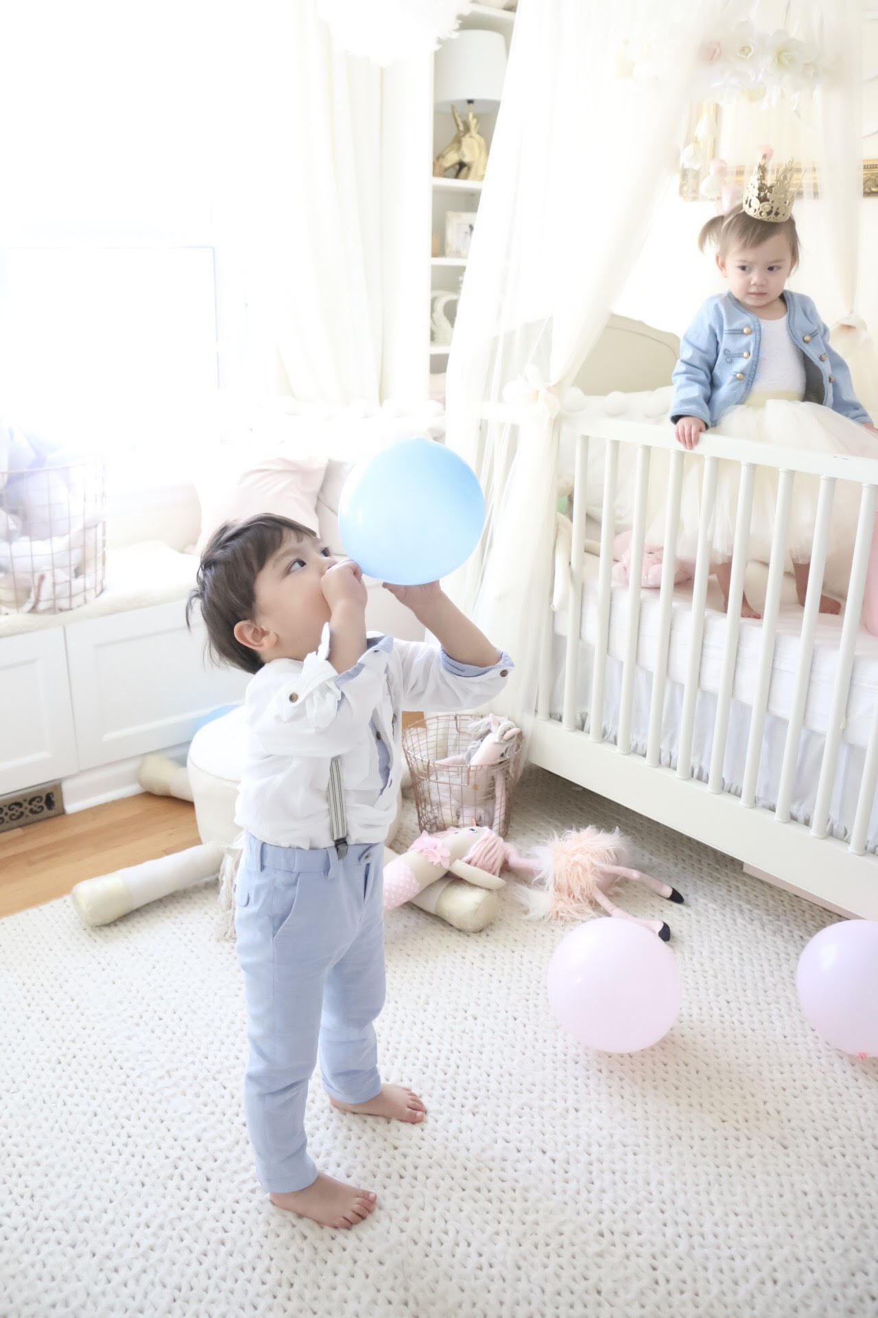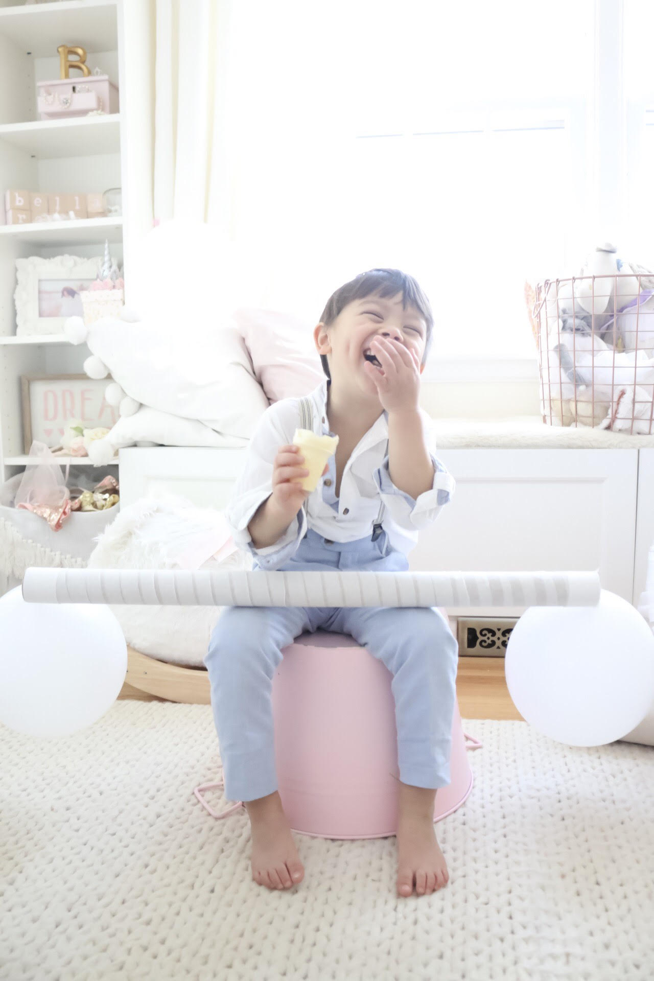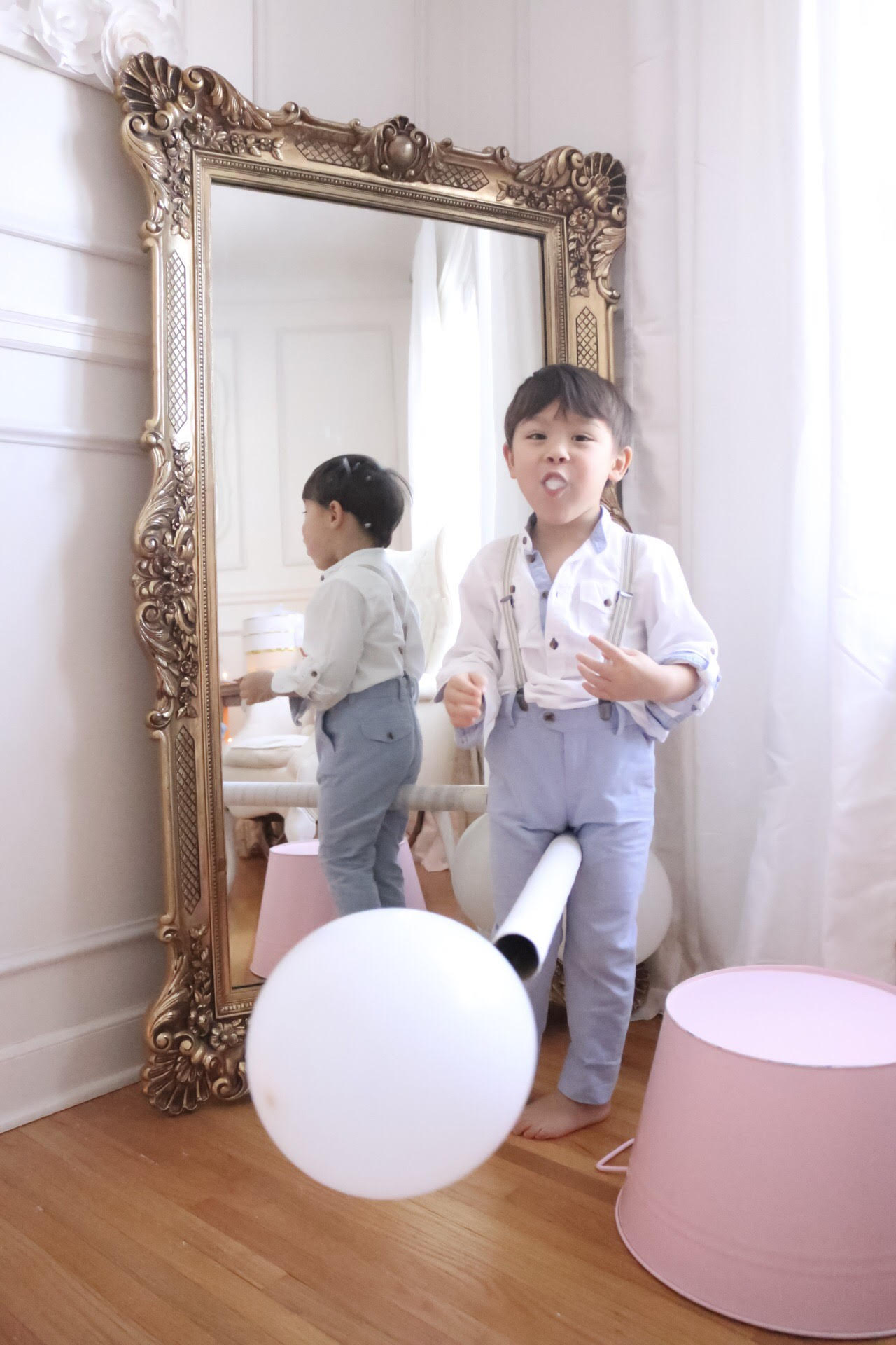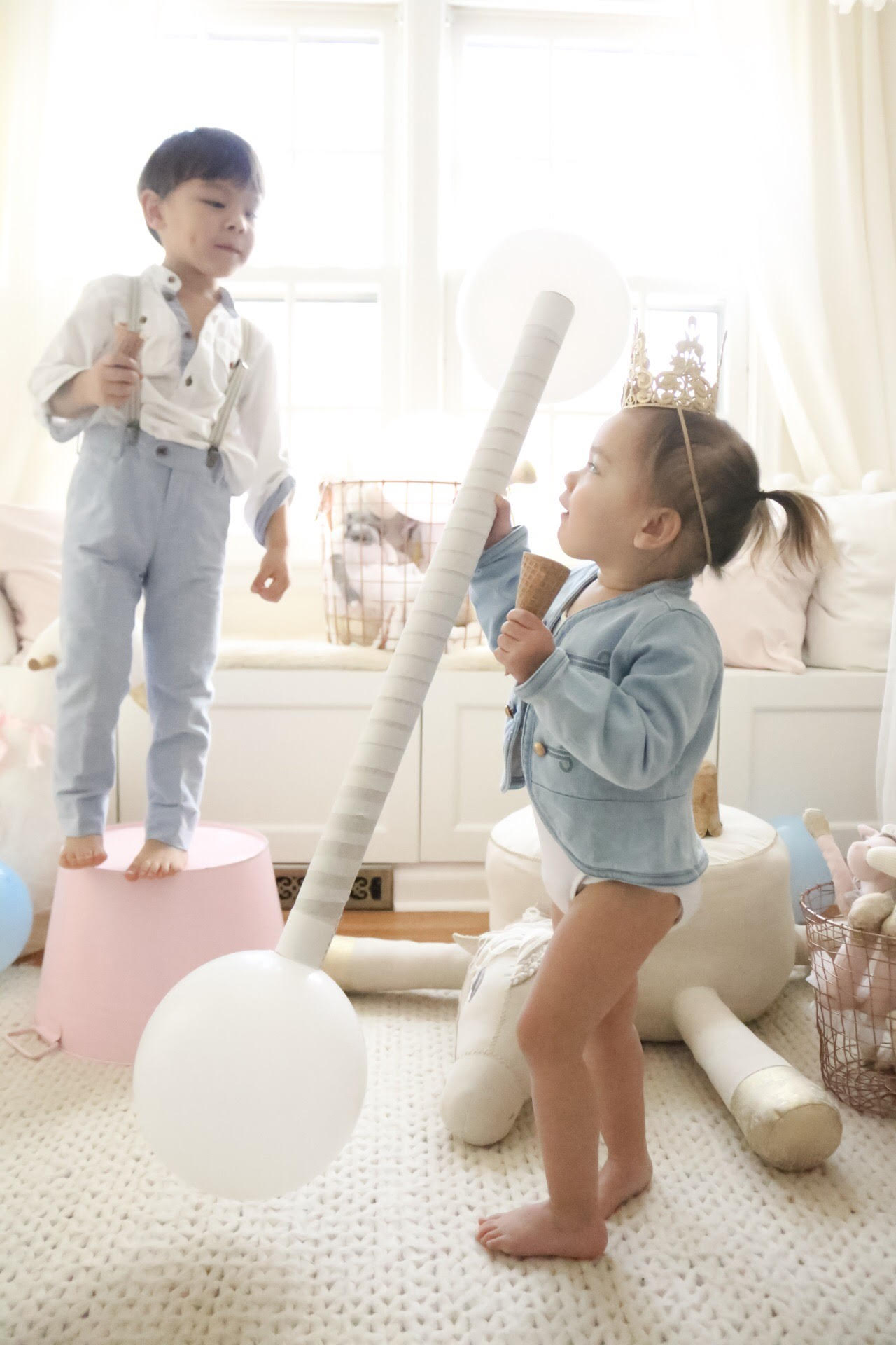 After a long holiday, we decided to start off the new year by having a circus party. We collected some of their animals and put them into wired baskets. I made a barbell out of a cardboard tube from wrapping paper and covered it in white streamer paper. Then I connected two balloons with a ribbon. We turned on circus music, dance, played with balloons and animals and ate too much sugar.