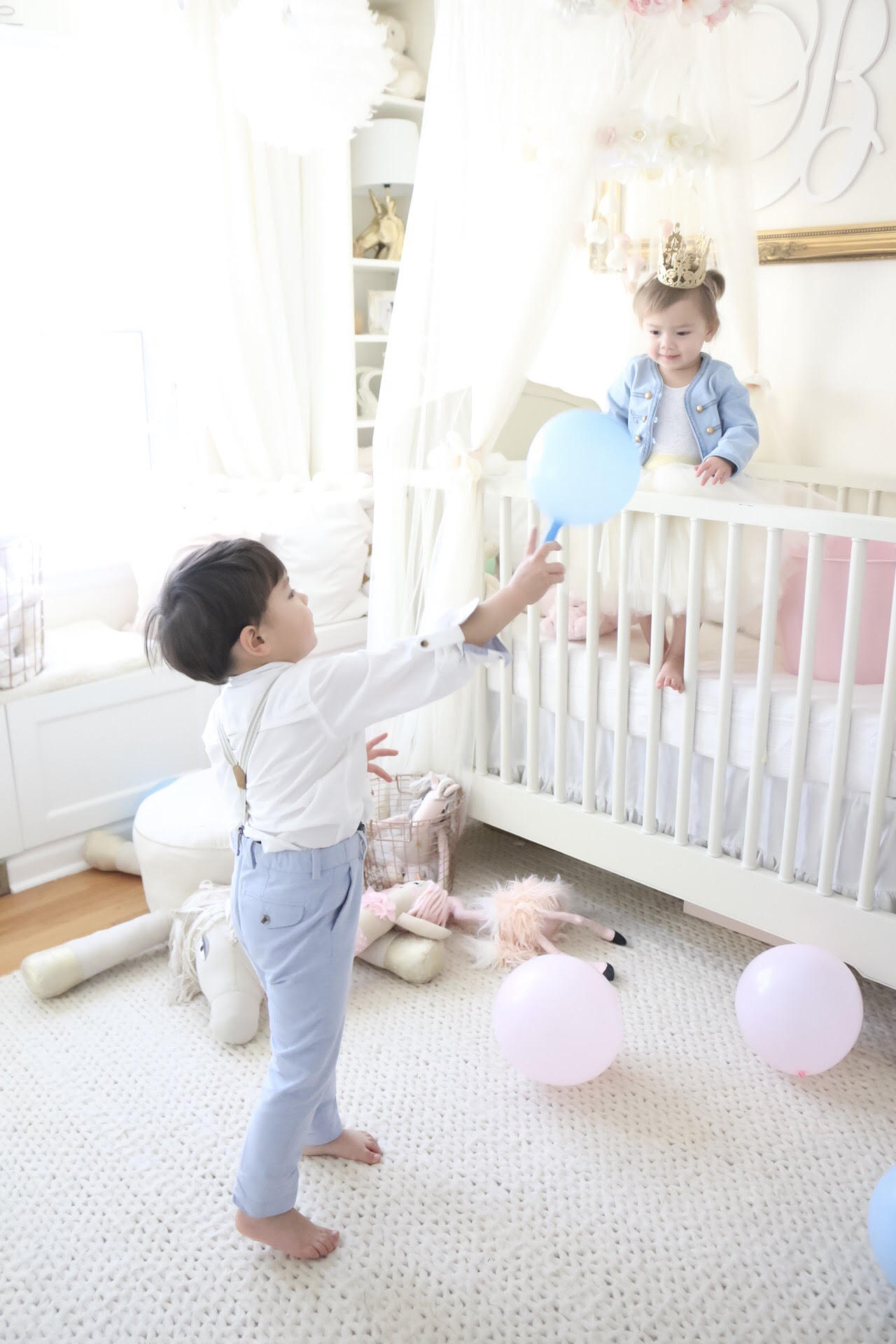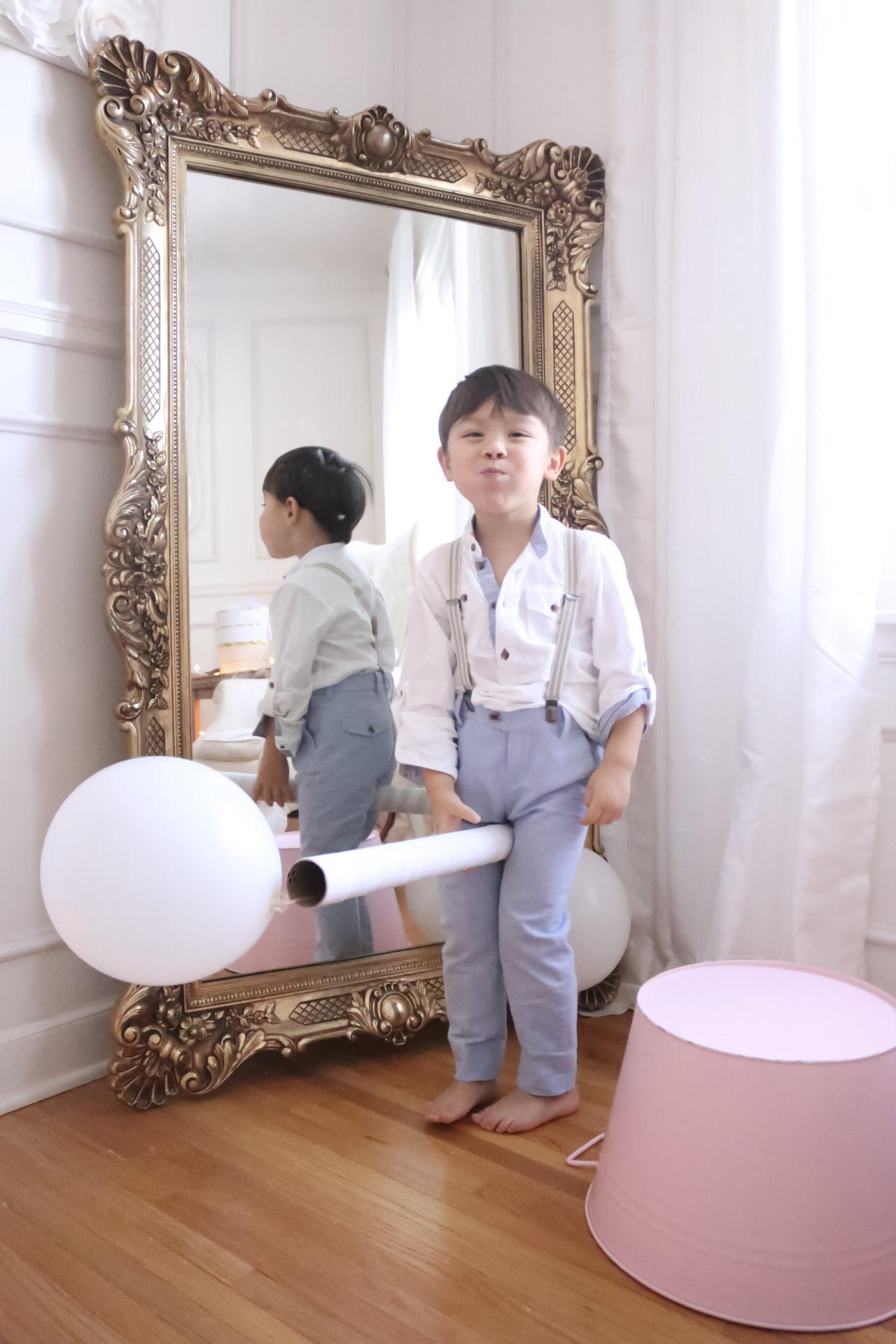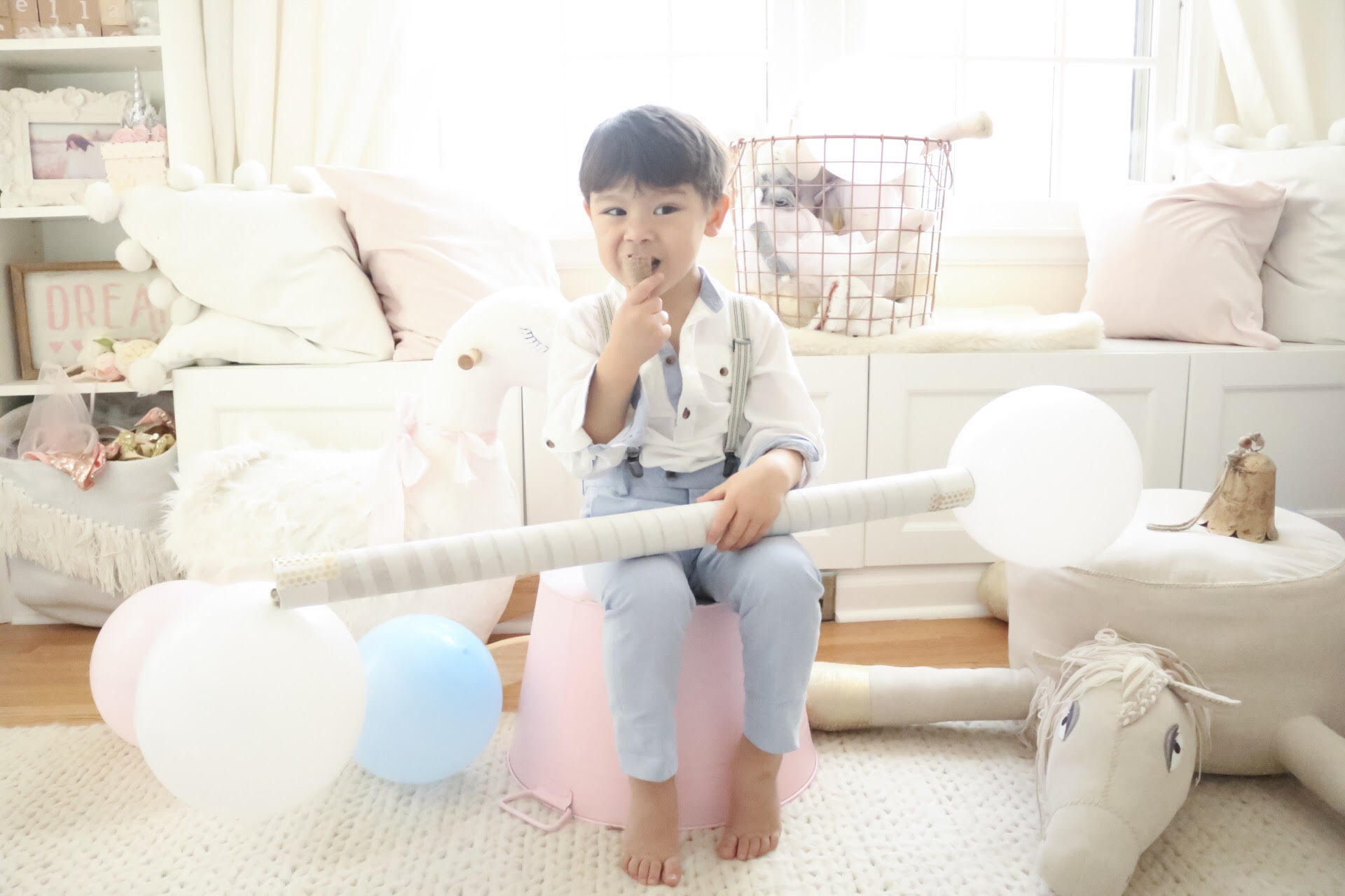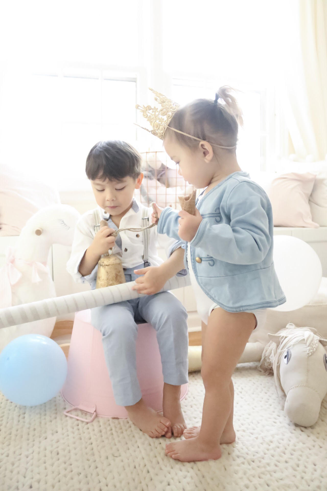 After a long holiday, we decided to start off the new year by having a circus party. We collected some of their animals and put them into wired baskets. I made a barbell out of a cardboard tube from wrapping paper and covered it in white streamer paper. Then I connected two balloons with a ribbon. We turned on circus music, dance, played with balloons and animals and ate too much sugar.