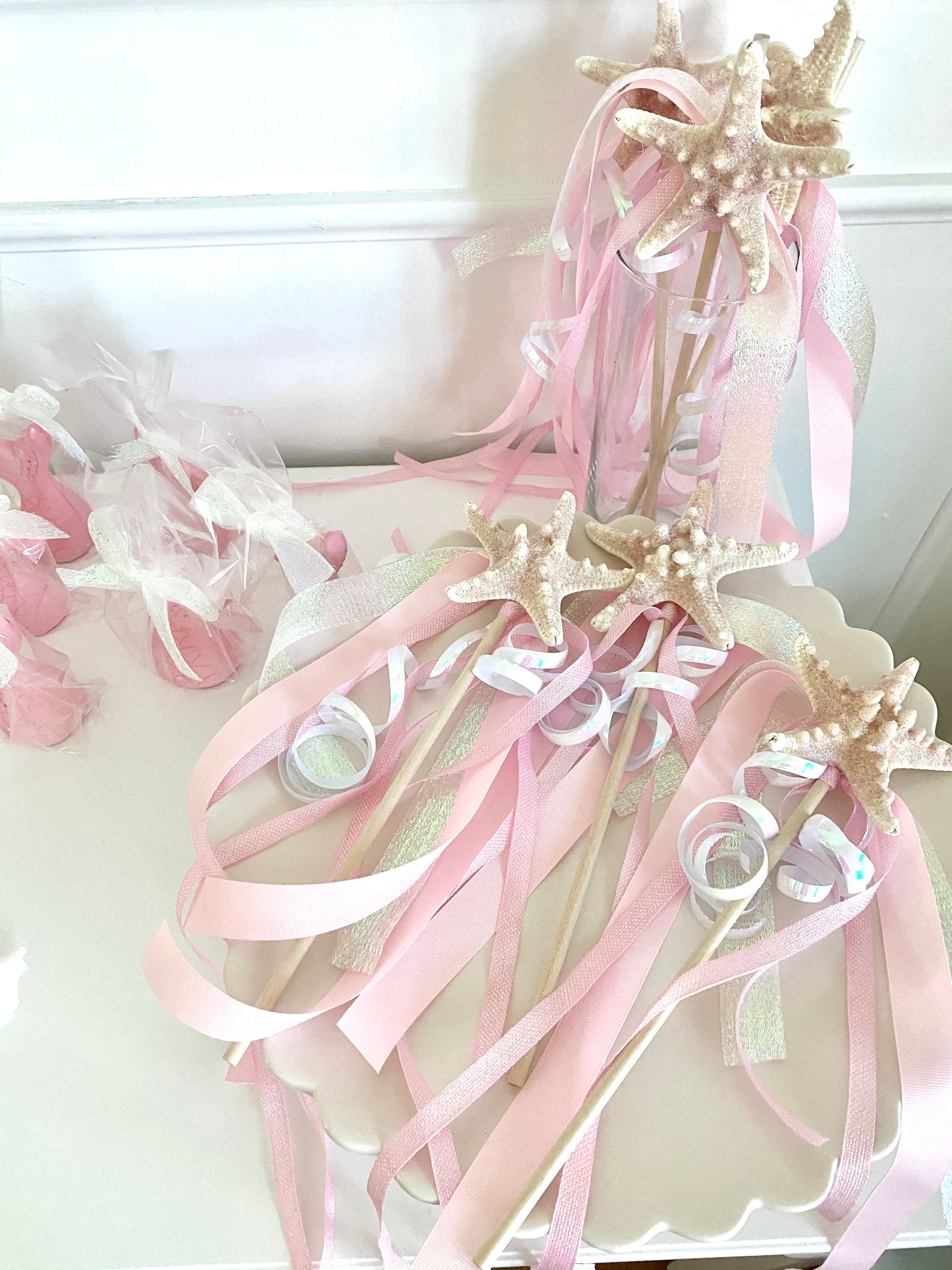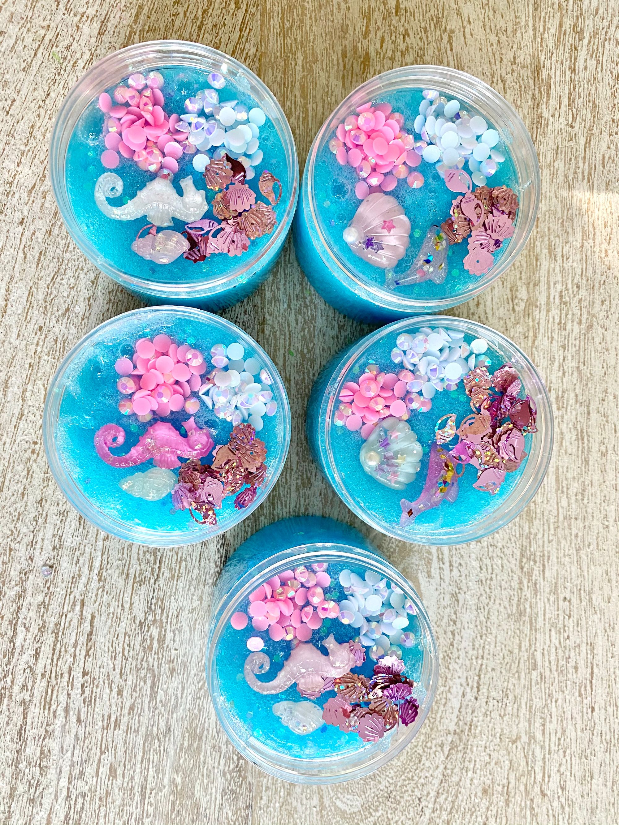 Each girl had her own mermaid wand, crown and mermaid slime. In the mermaid tail giftbags on the dessert table they got mermaid tail chalk, mermaid tattoos and some candy!