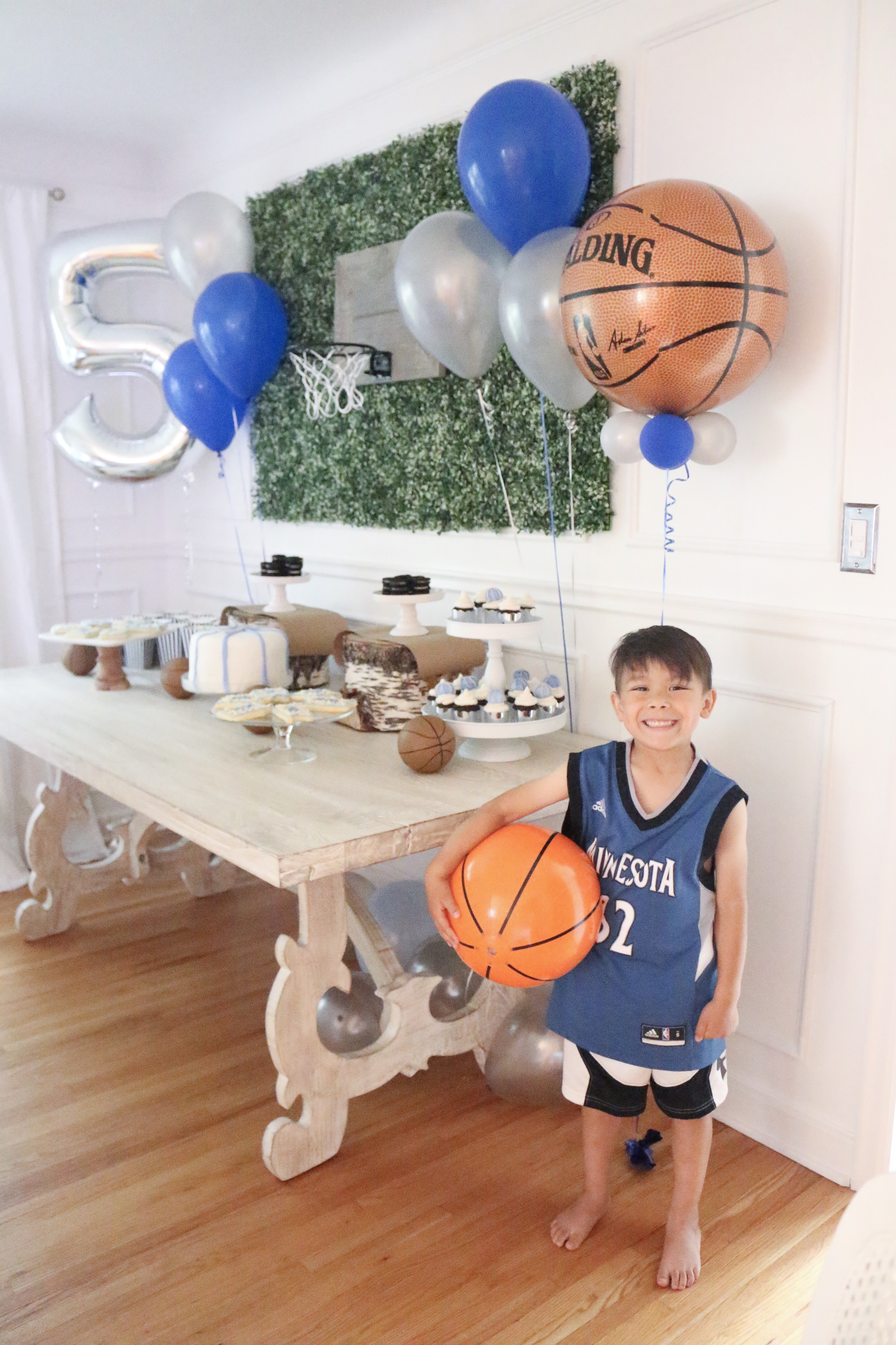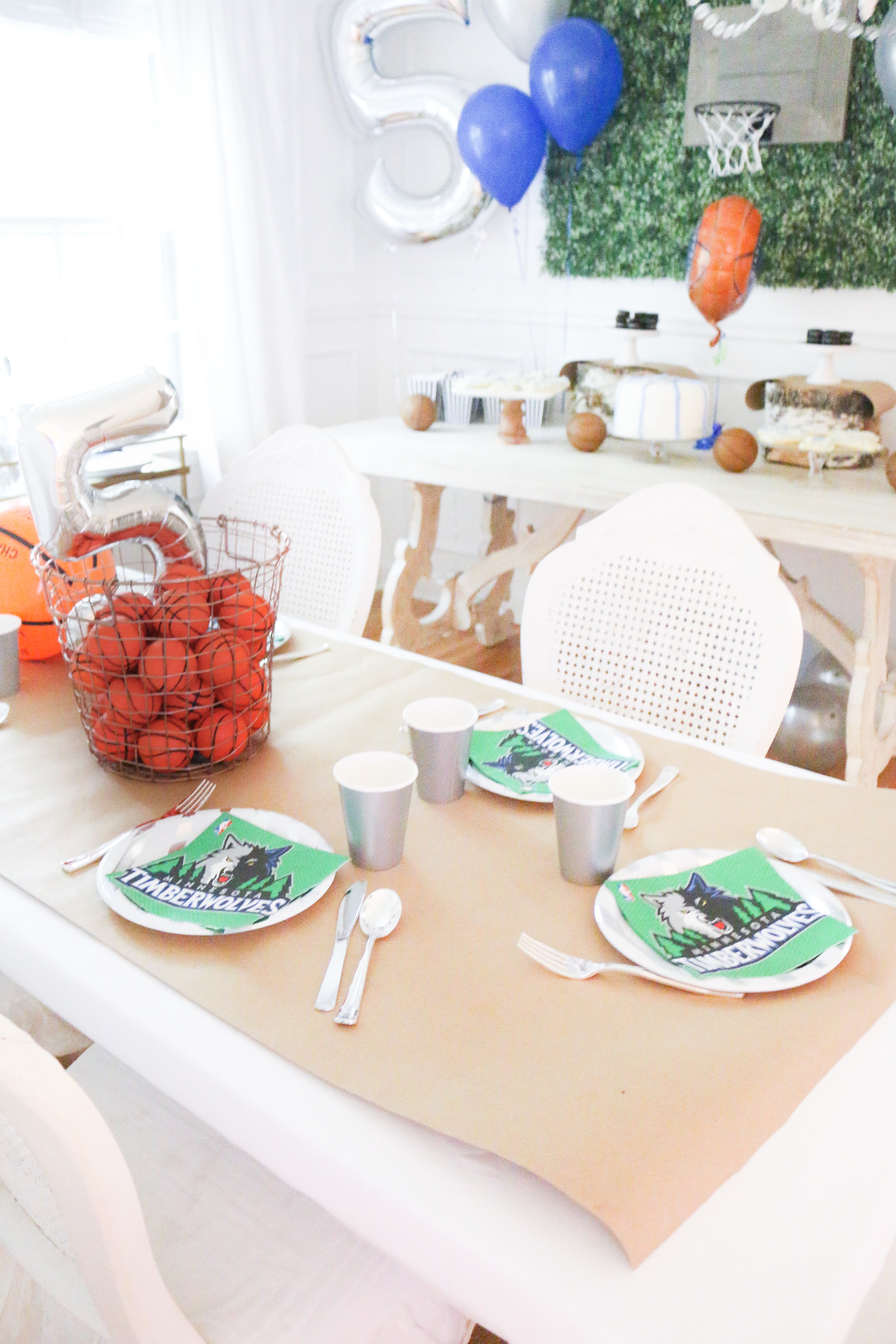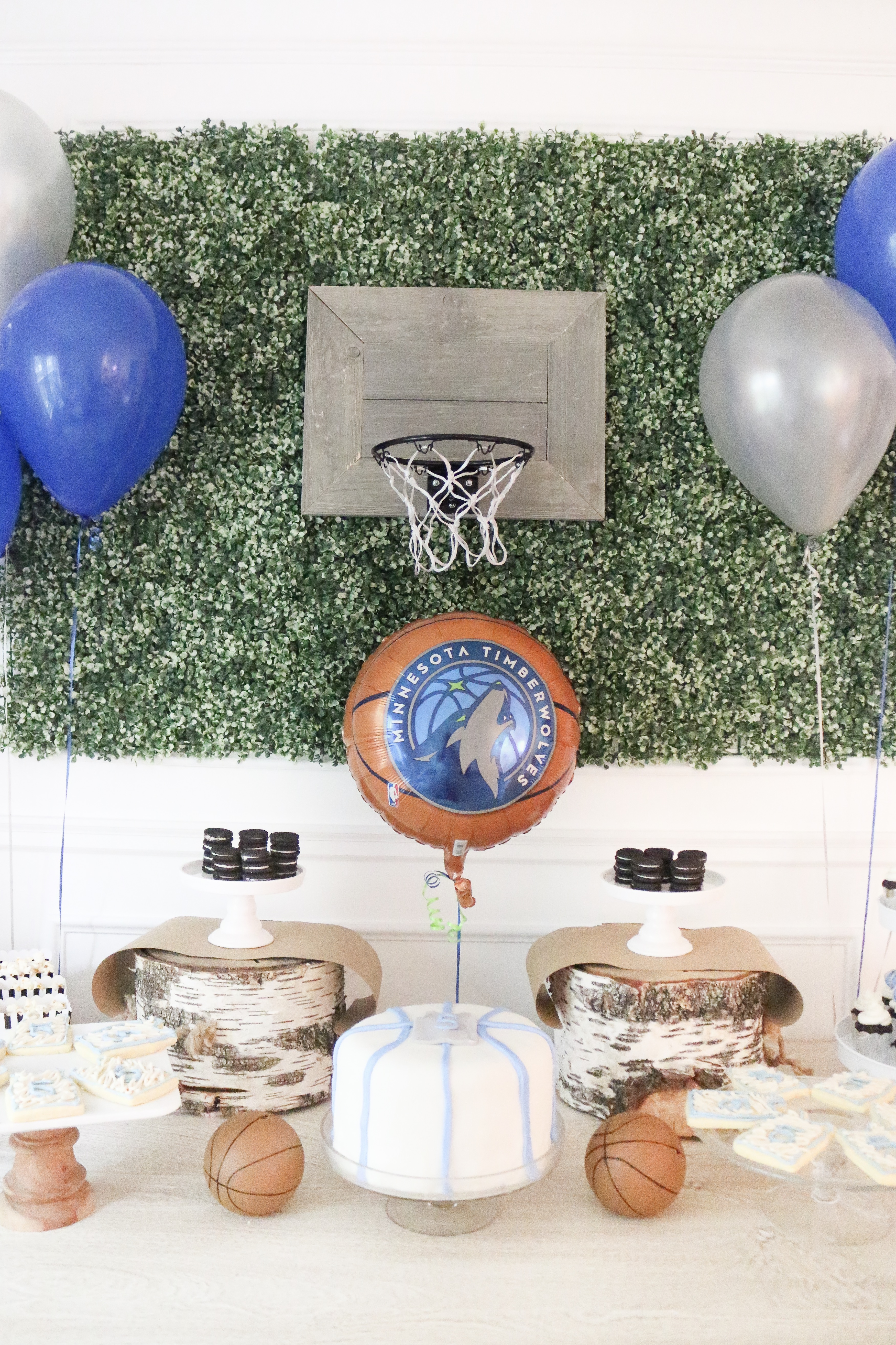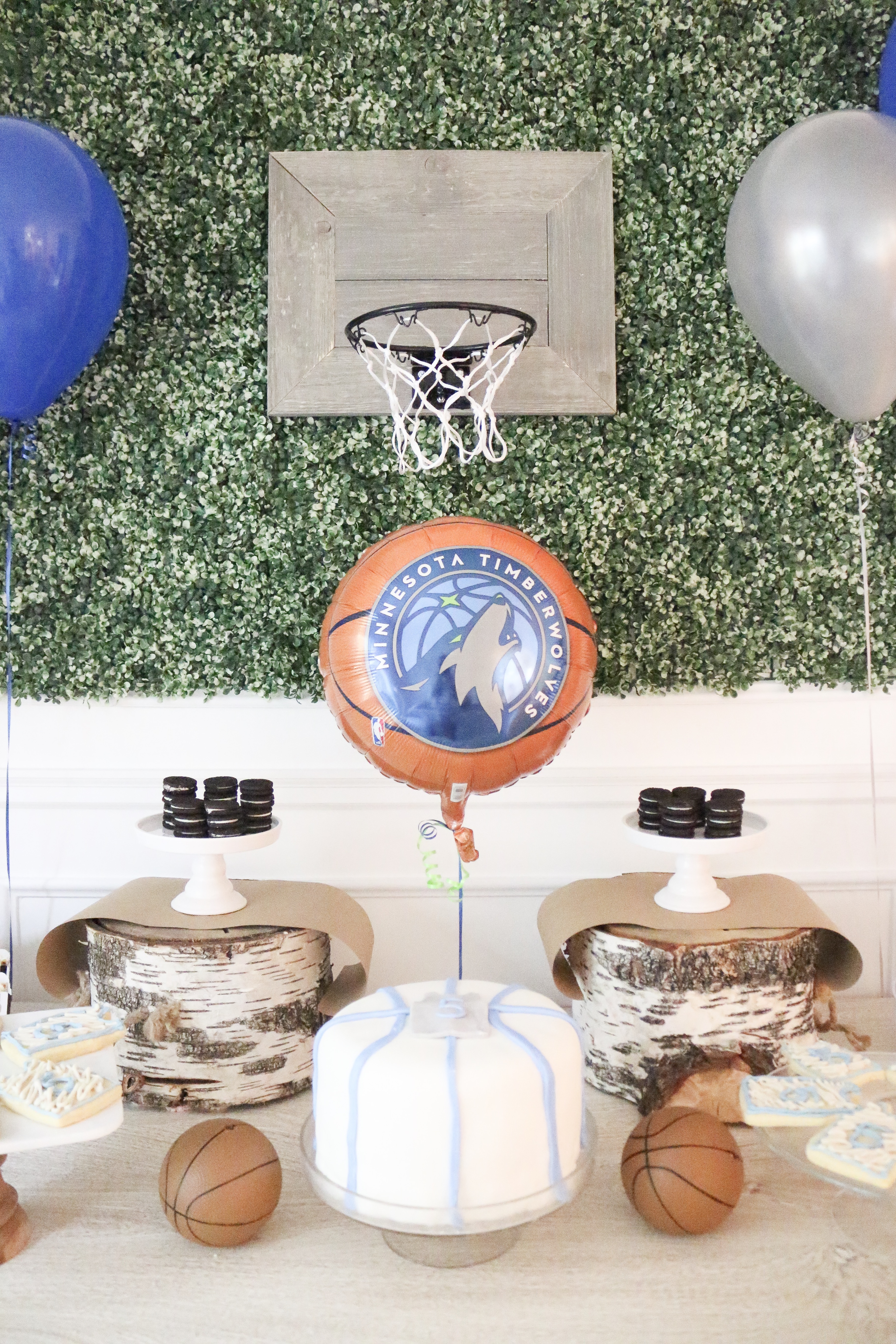 I'm finally posting photos from Camden's 5th birthday! He chose to have his favorite team and sport be the theme! Timberwolves Basketball! My favorite thing from his party was this rustic basketball hoop! It was used for his party and it's now hanging in his room!