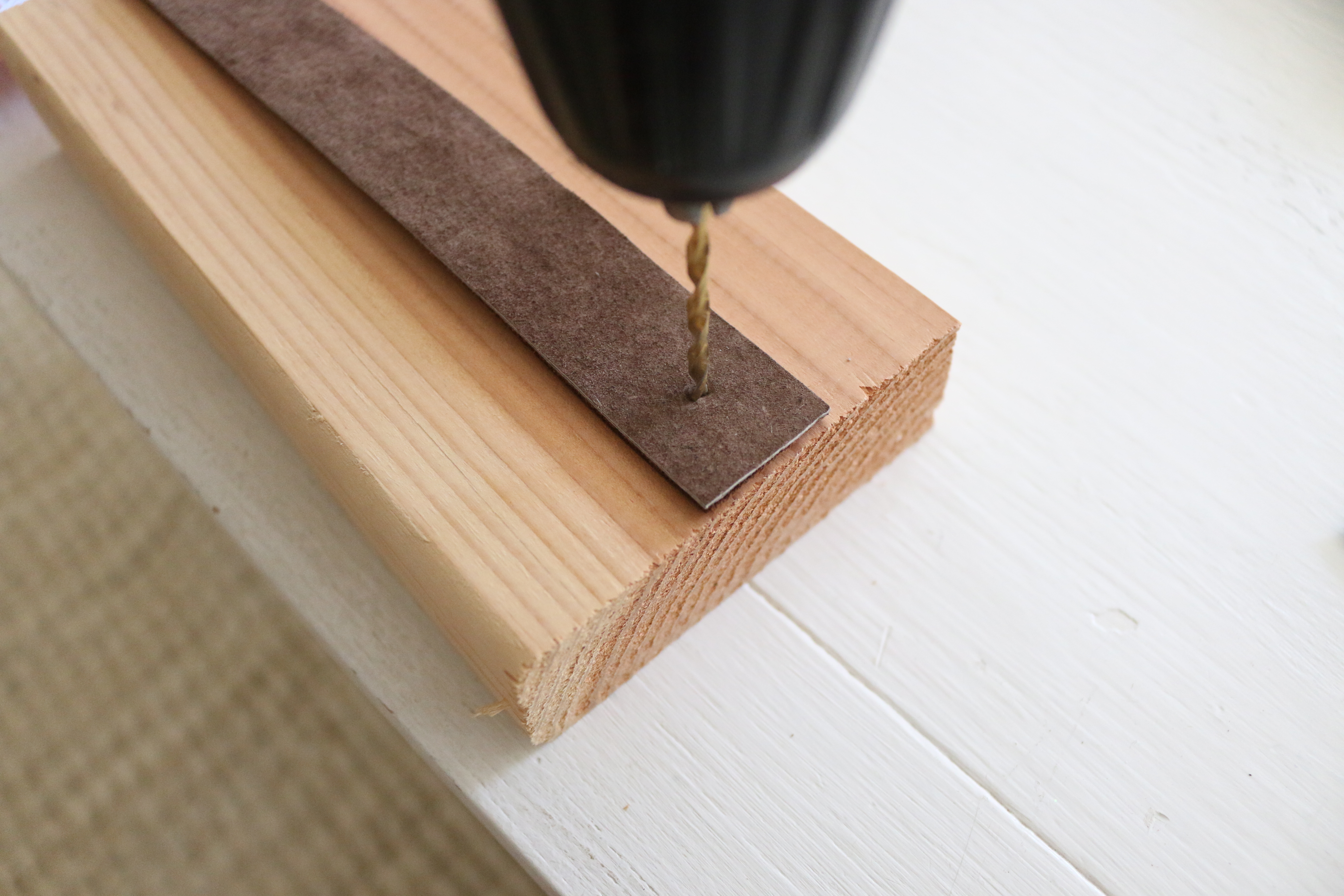-To drill the holes, I found a piece of wood in our garage to back the leather straps. I measured 3/4" in on each side, marked it and then drilled the holes. Repeat for each strap.