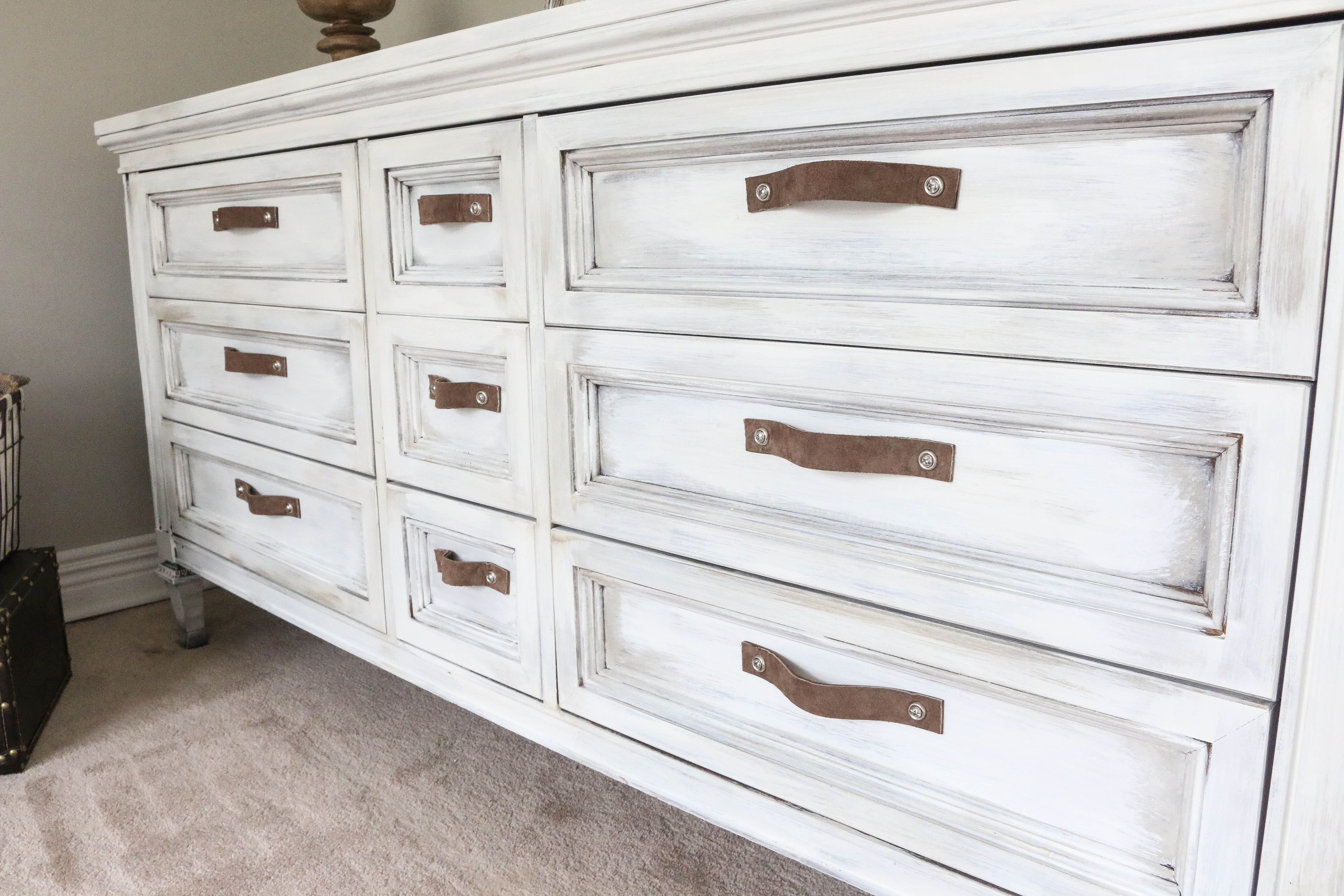 Now on to the pulls. I really wanted leather pulls but I wanted them in an exact color and I wasn't able to find what I was looking for. So I decided to do a little added dIY. After a few attempts at buying leather straps online and returning them because it wasn't the right color, I finally found the color I was looking for. However, when I received the leather, it was too thin. Luckily, I couldn't return one of the leather straps that I purchased prior so I gorilla glued two together and it worked perfectly.