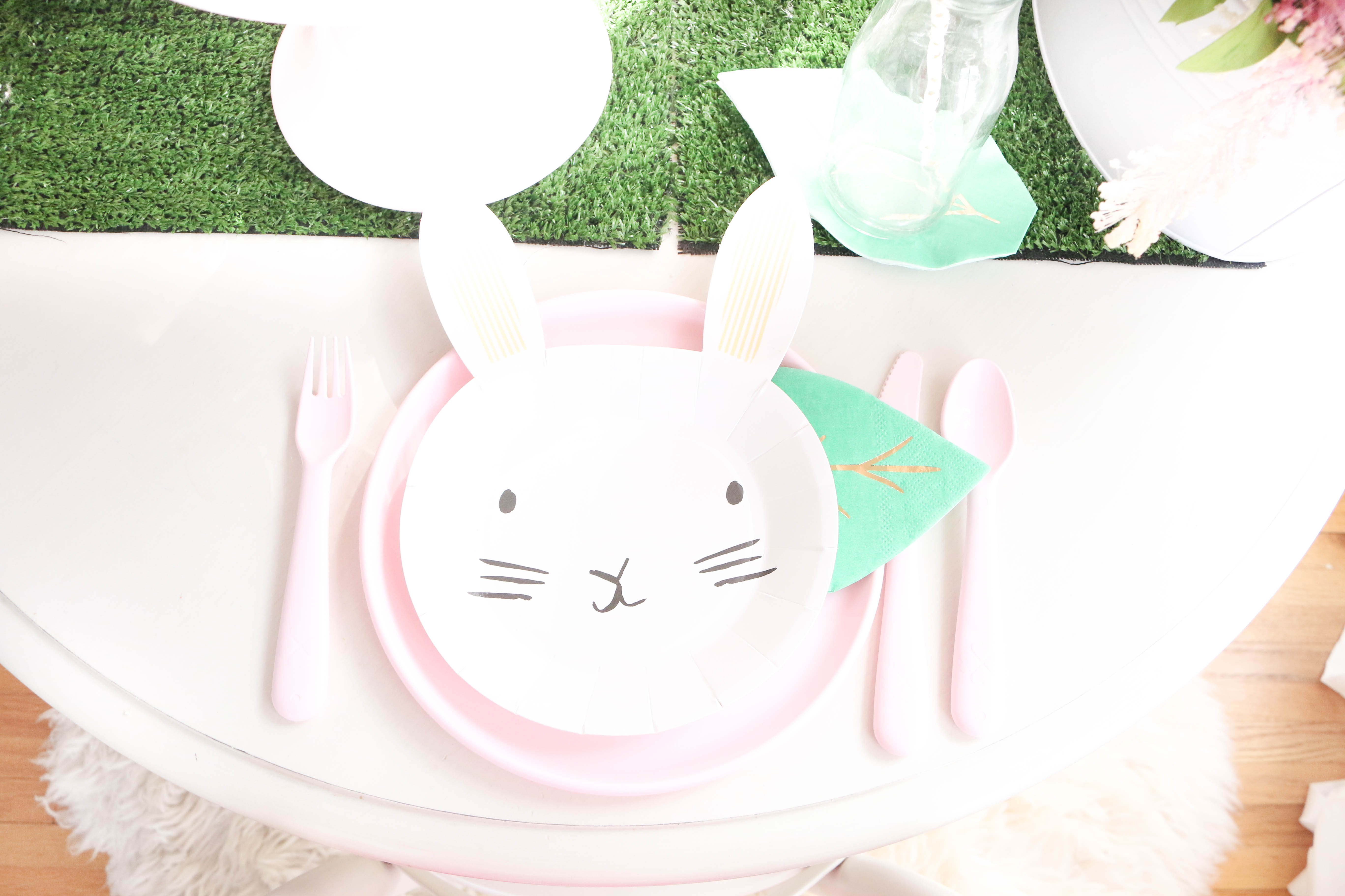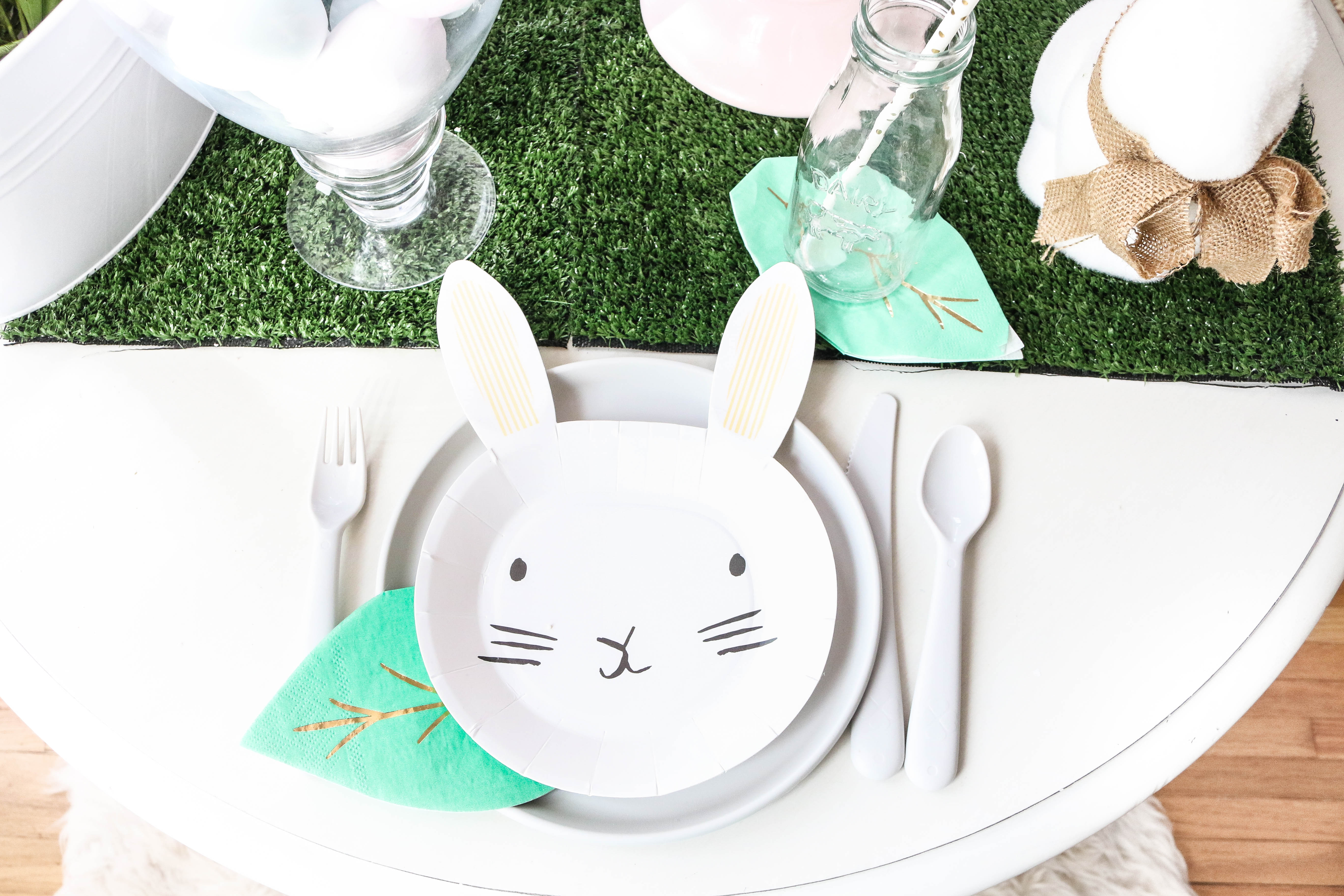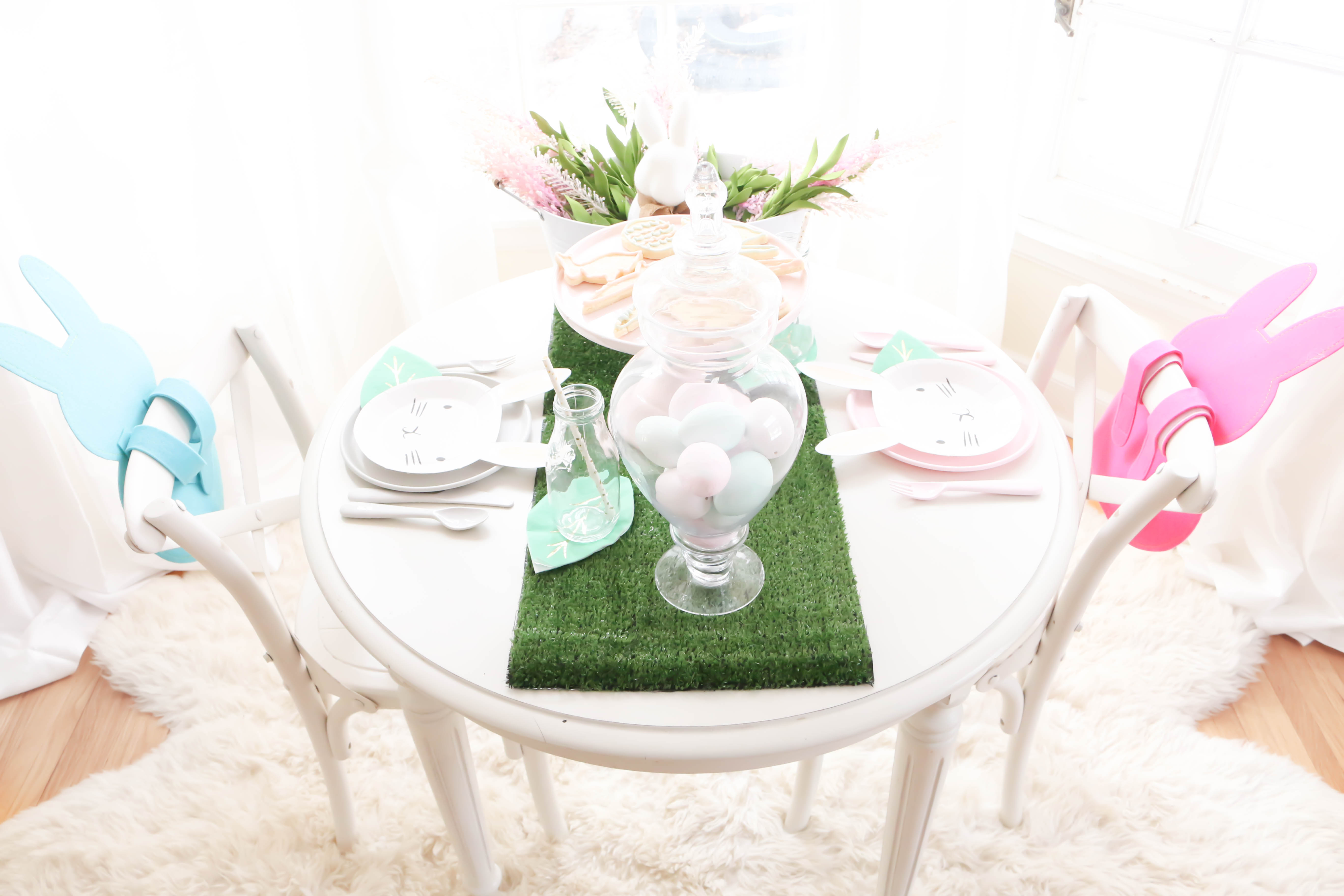 Similar Table | Similar Chairs | Similar Bunny Chairbacker | Bunny Plates | Leaf Napkins | Cardboard Chandelier | Glass milk jars | Similar Rug | Similar Apothocary Jar | Plastic Utensils | Plastic Plates | Grass Table Runner