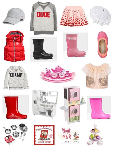 Play Kitchen / Washer and Dryer / Pastry Tower / Tea Set / Pots and Pans / Pink Heart Skirt / Boys Vest / Boys Champ Sweatshirt / Baseball Cap / Dude Sweatshirt / Parasol Umbrella / Red Hunter Boots / Black Hunter Boots / Curious George Valentine's Day Book / Plant a Kiss Book / More items below: