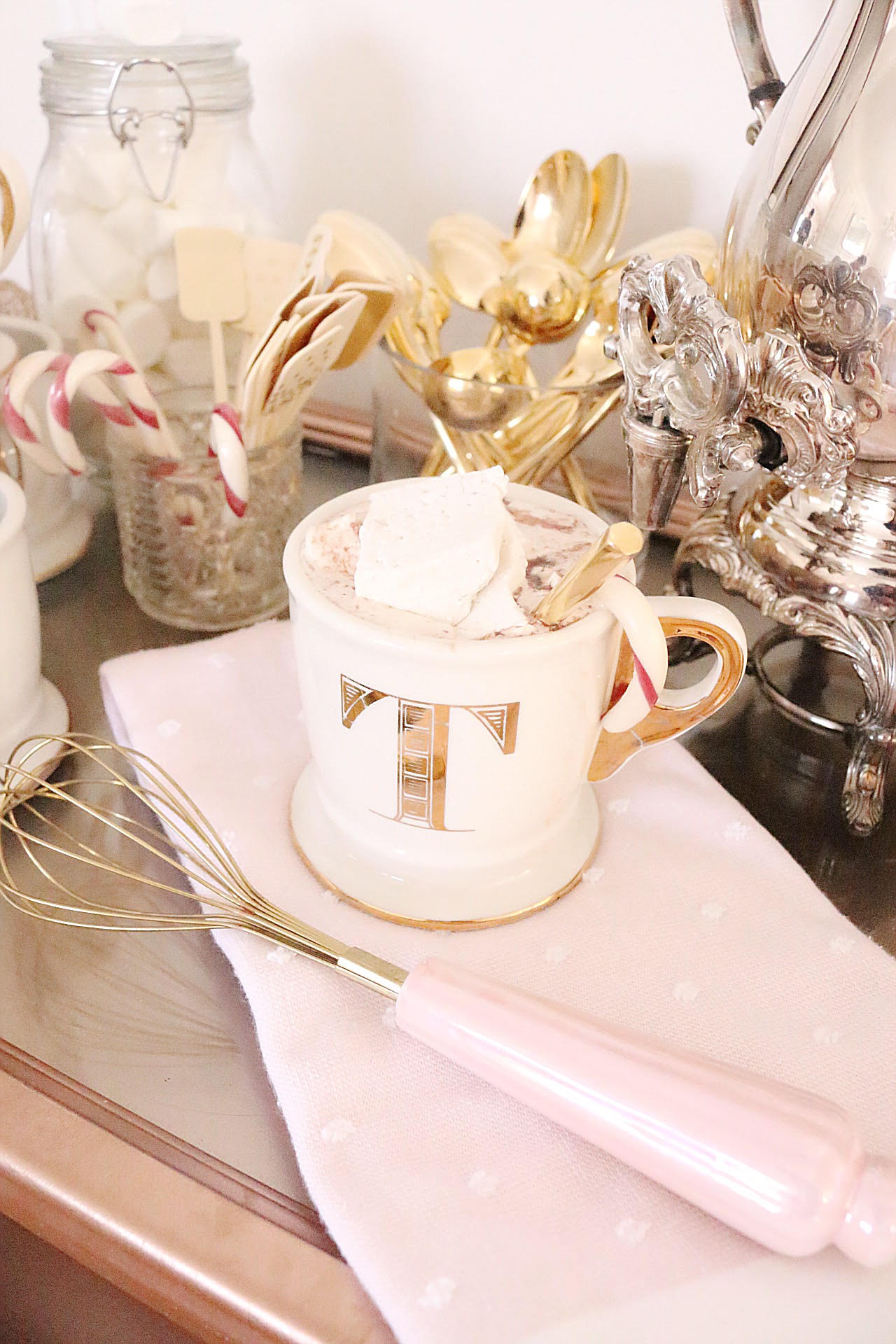 Divide hot chocolate among mugs. Top with homemade marshmallows (recipe below), a candy cane and dust with cocoa powder.