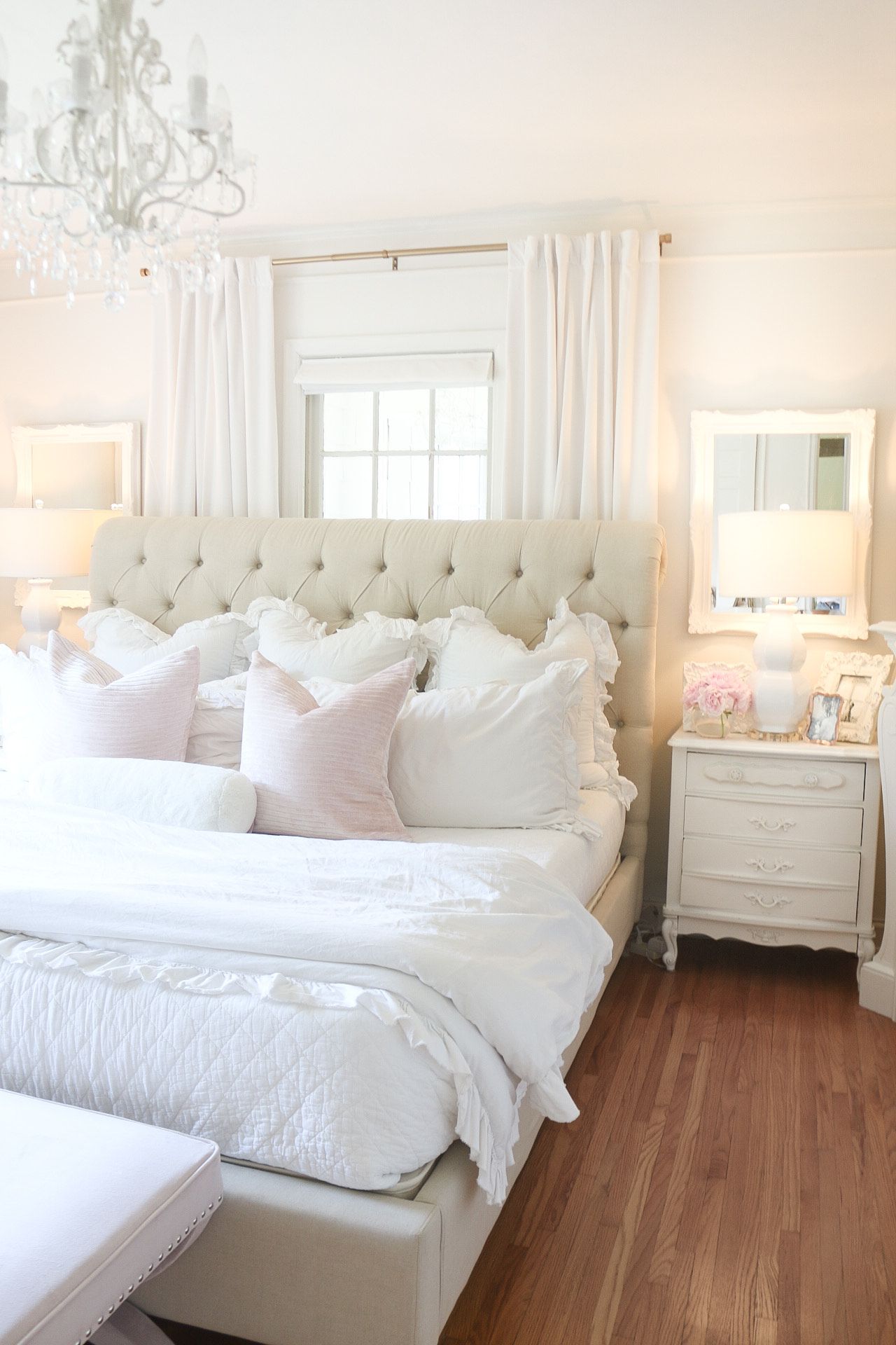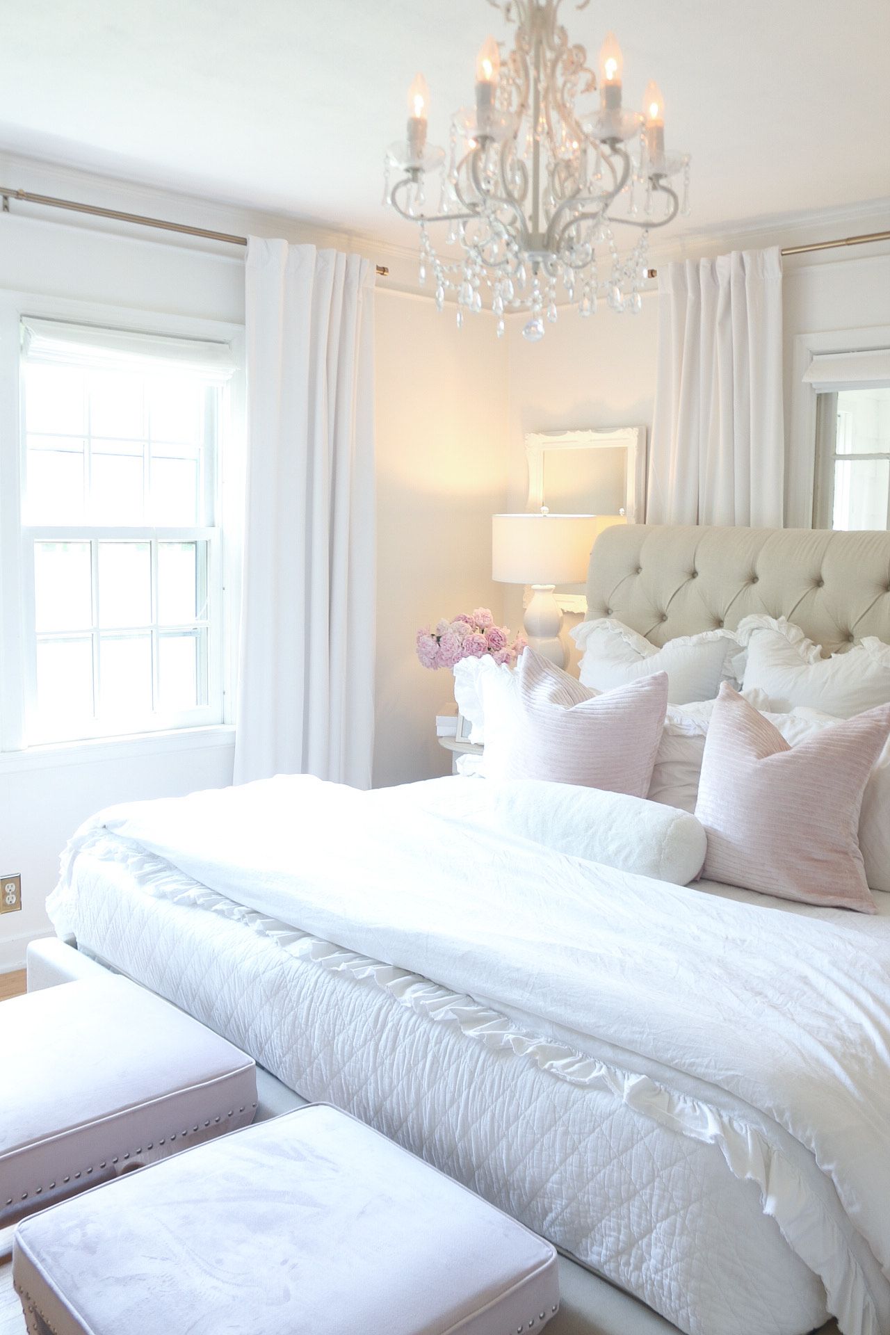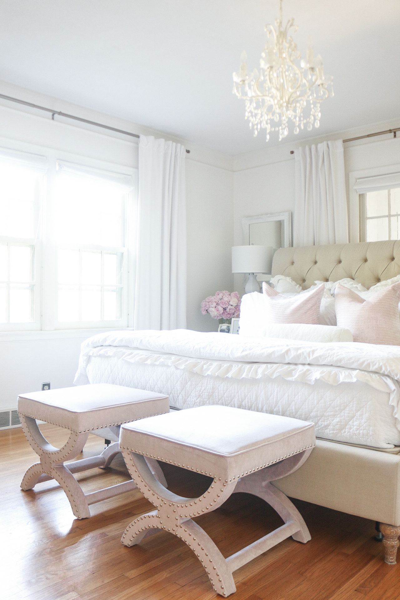 Today, I'm sharing our master bedroom refresh with Safavieh! I partnered with them to add a few things to our room. Summer is the perfect time to change things up a bit! I chose some beautiful white lamps and a couple of pink ottomans with studded detail.