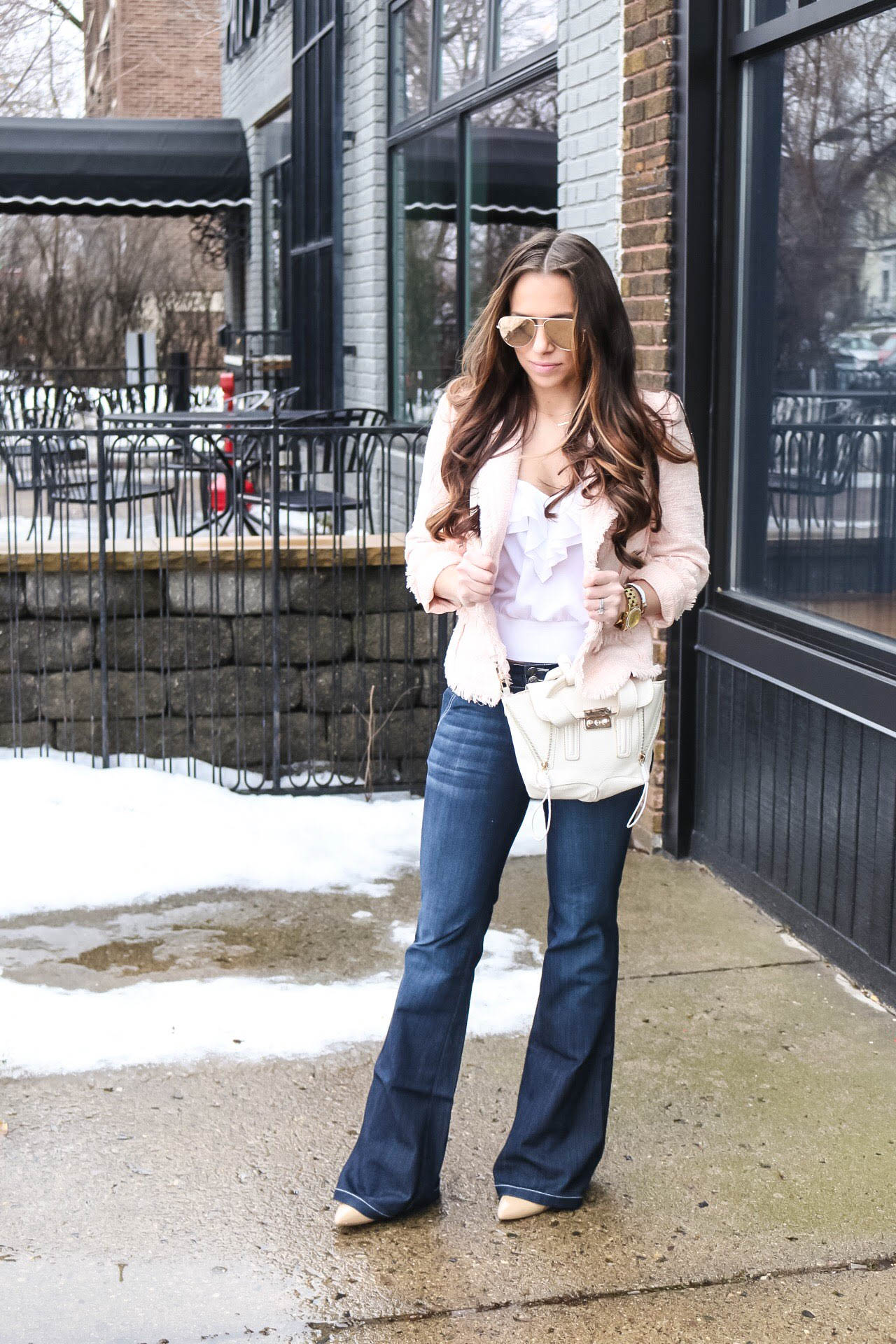 Similar Jacket / Similar Jacket / Similar Top / Similar Jeans / Similar Jeans / Similar Heels / Similar Handbag / Similar Handbag / Sunglasses / Watch / Bracelet