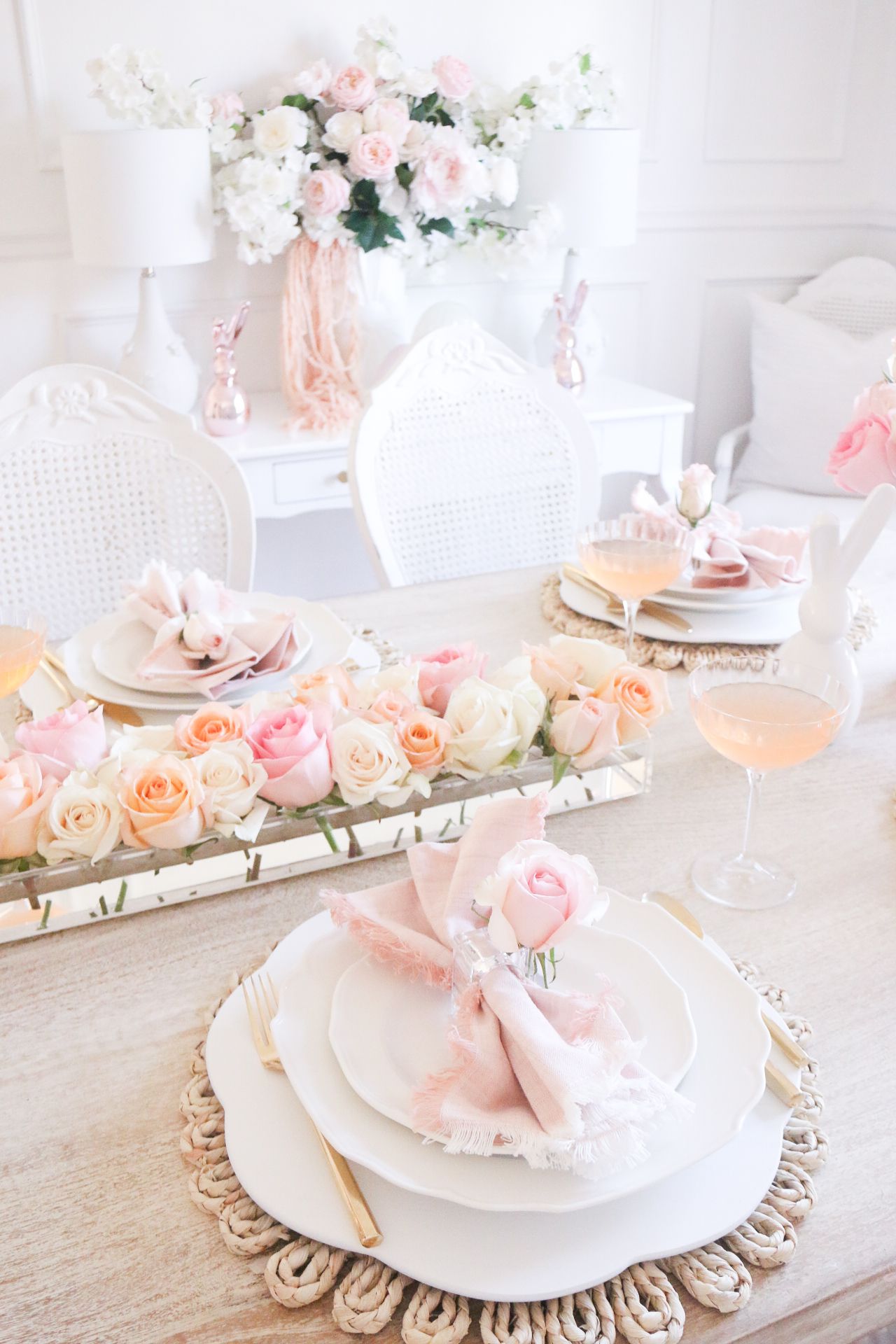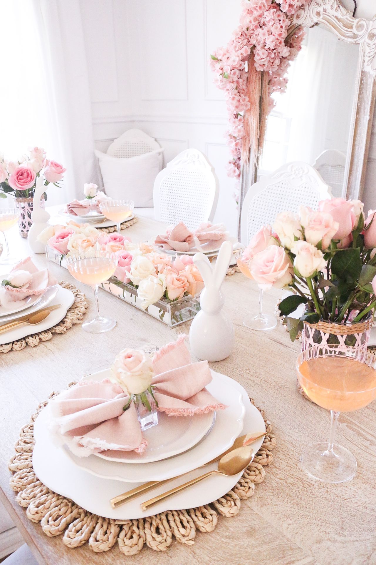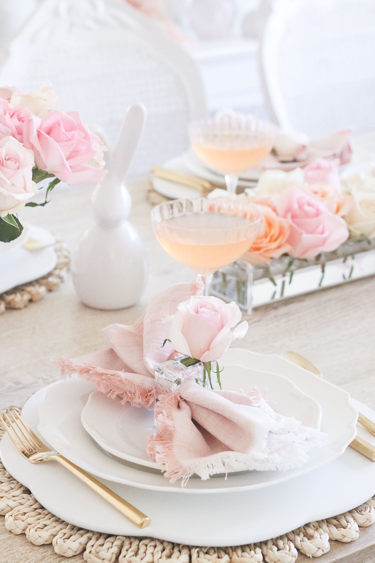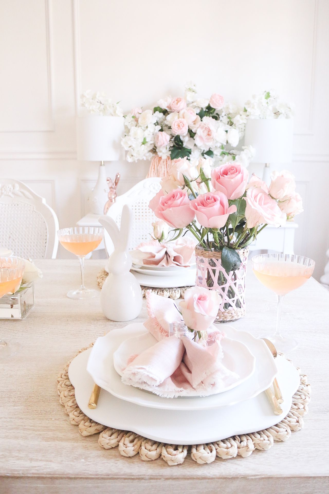 I can't believe that Easter is right around the corner! Today, I'm sharing an Easter tablescape full of fresh and faux flowers! There's currently snow on the ground here but it feels like spring inside! I love the mix of natural materials with acrylic vases and napkin rings! They are so fun! Also, these faux florals are just so beautiful! The pink garden roses are so real looking!