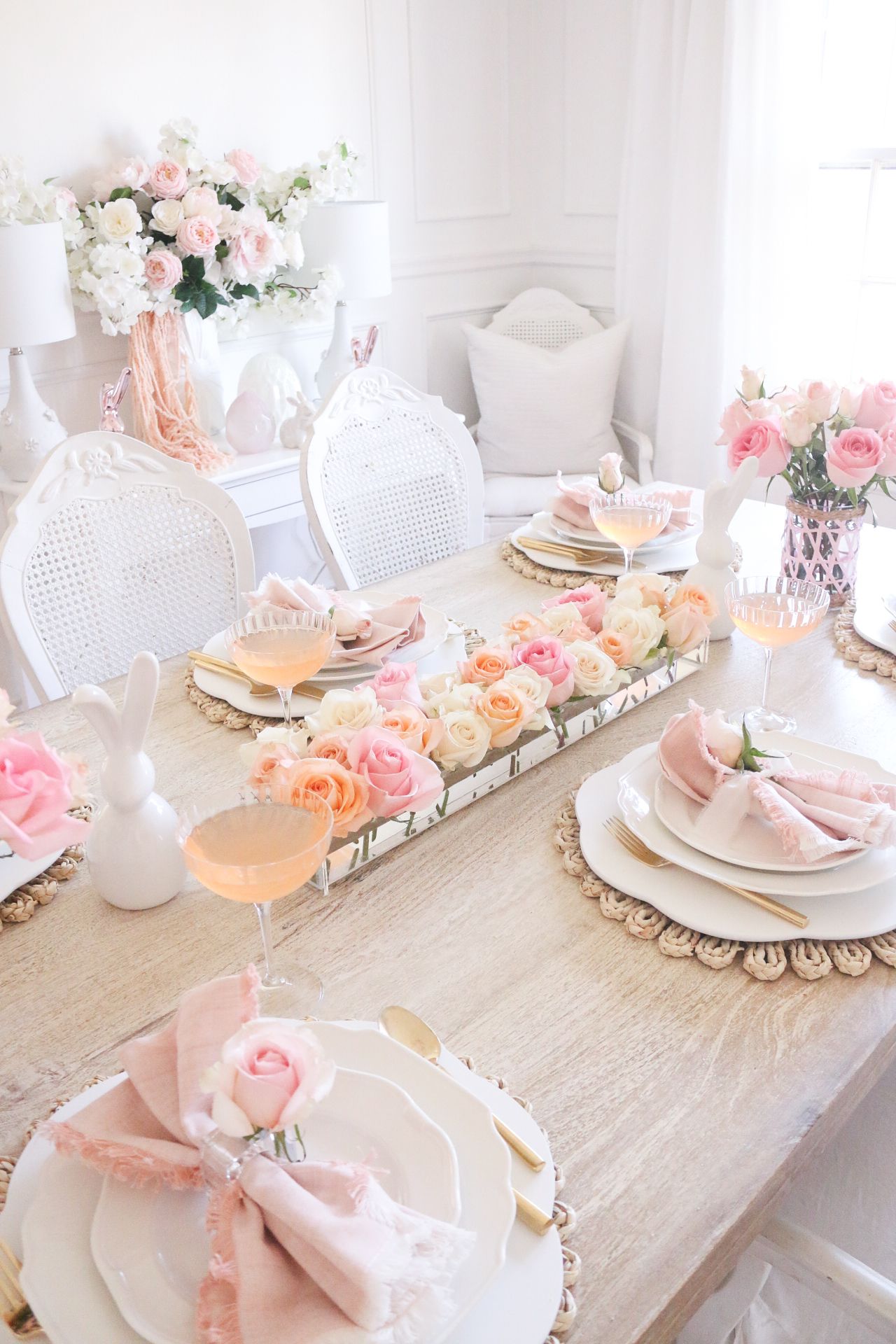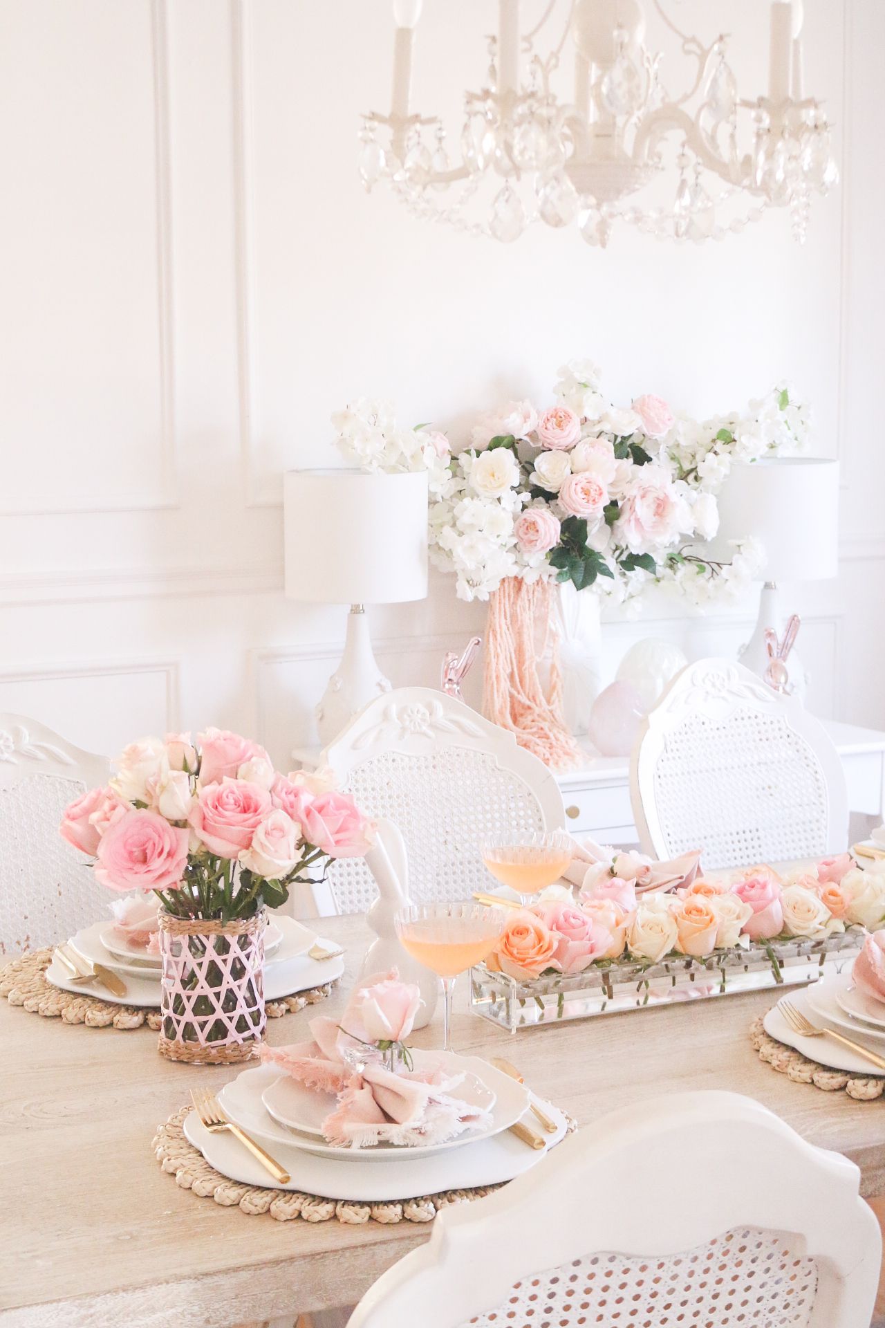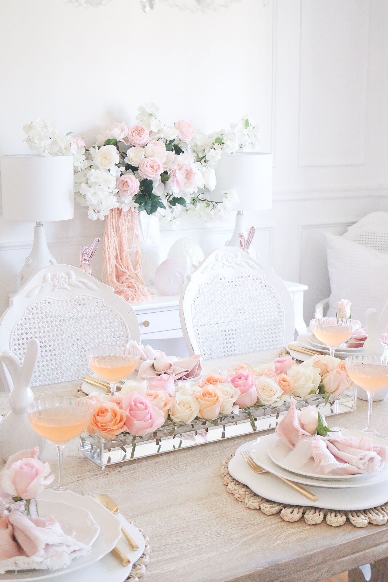 I can't believe that Easter is right around the corner! Today, I'm sharing an Easter tablescape full of fresh and faux flowers! There's currently snow on the ground here but it feels like spring inside! I love the mix of natural materials with acrylic vases and napkin rings! They are so fun! Also, these faux florals are just so beautiful! The pink garden roses are so real looking!