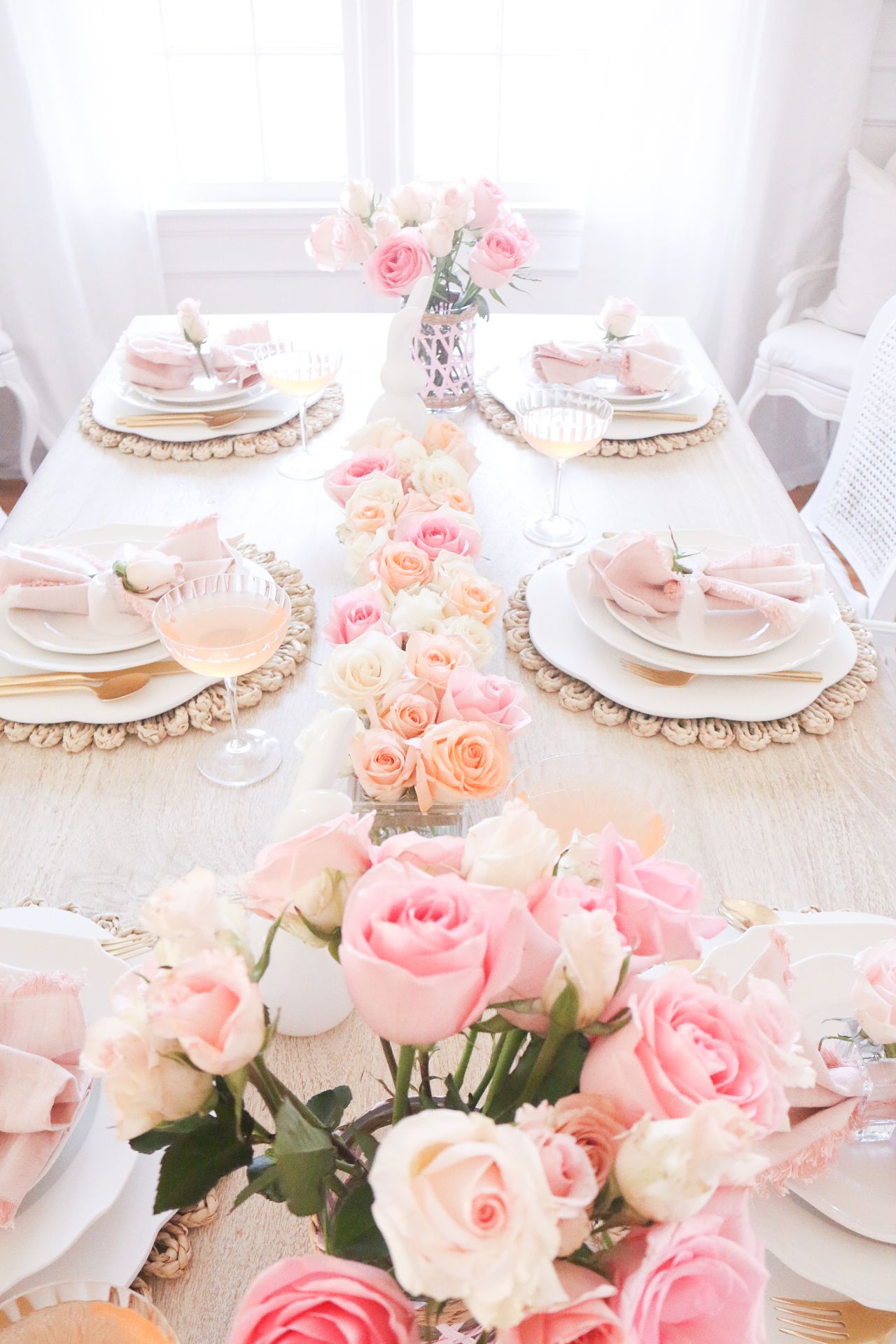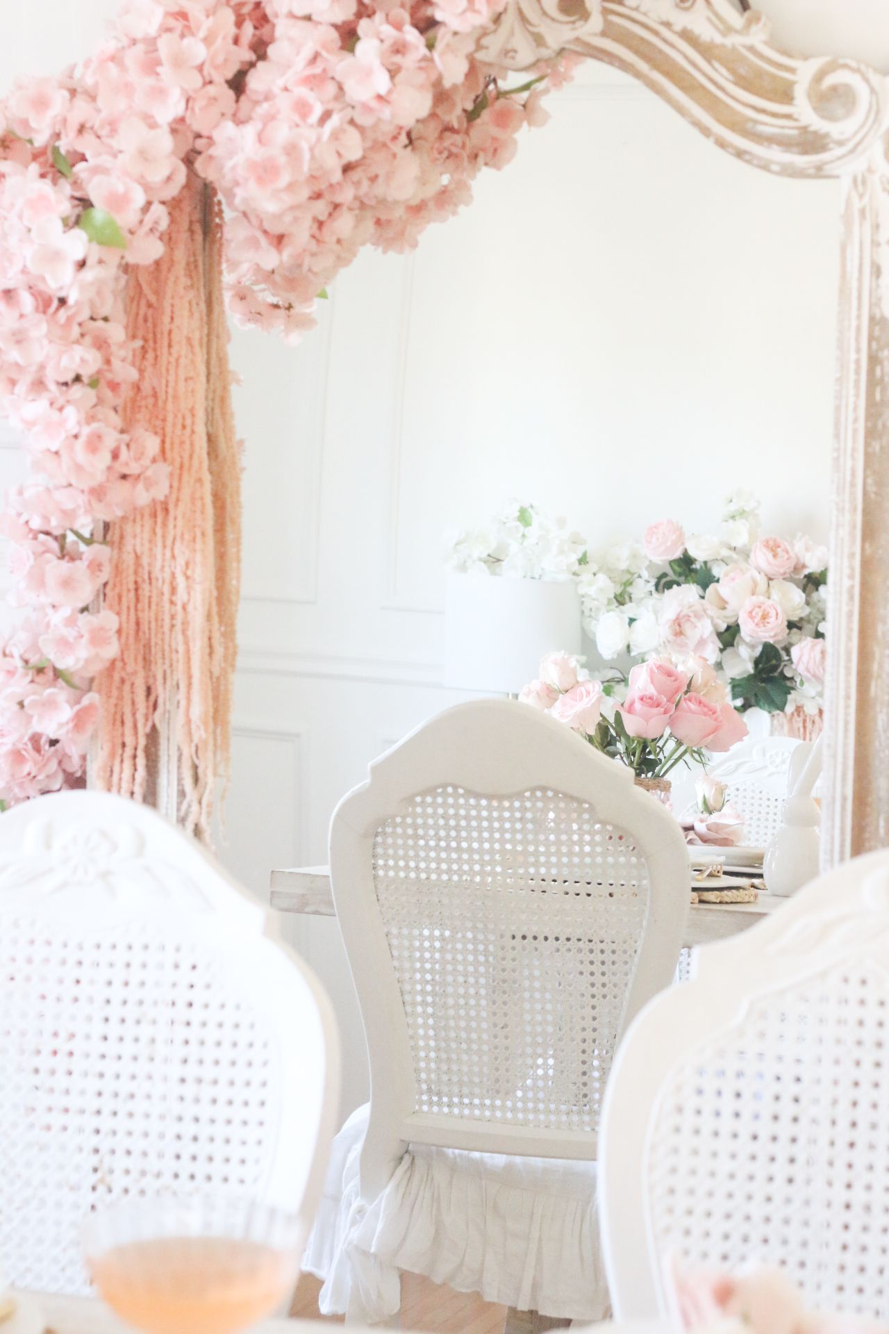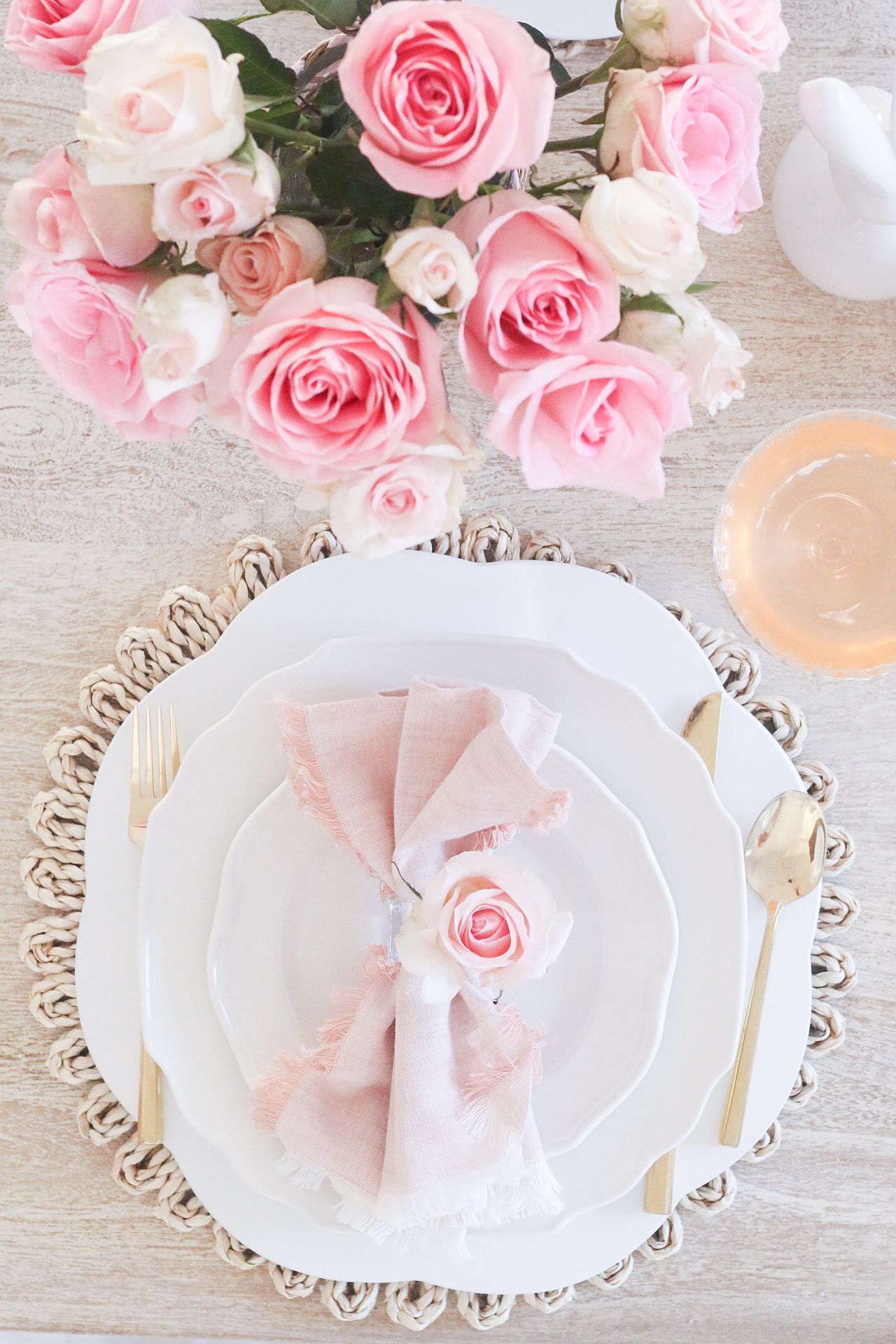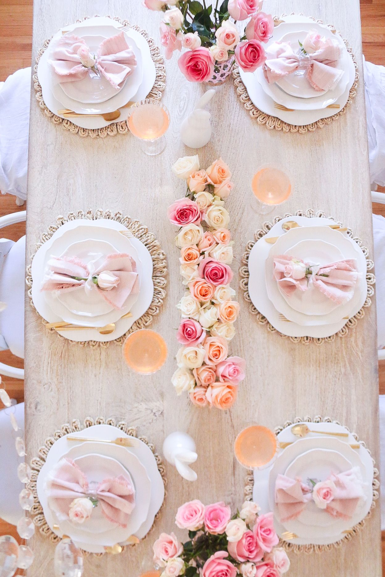 I can't believe that Easter is right around the corner! Today, I'm sharing an Easter tablescape full of fresh and faux flowers! There's currently snow on the ground here but it feels like spring inside! I love the mix of natural materials with acrylic vases and napkin rings! They are so fun! Also, these faux florals are just so beautiful! The pink garden roses are so real looking!