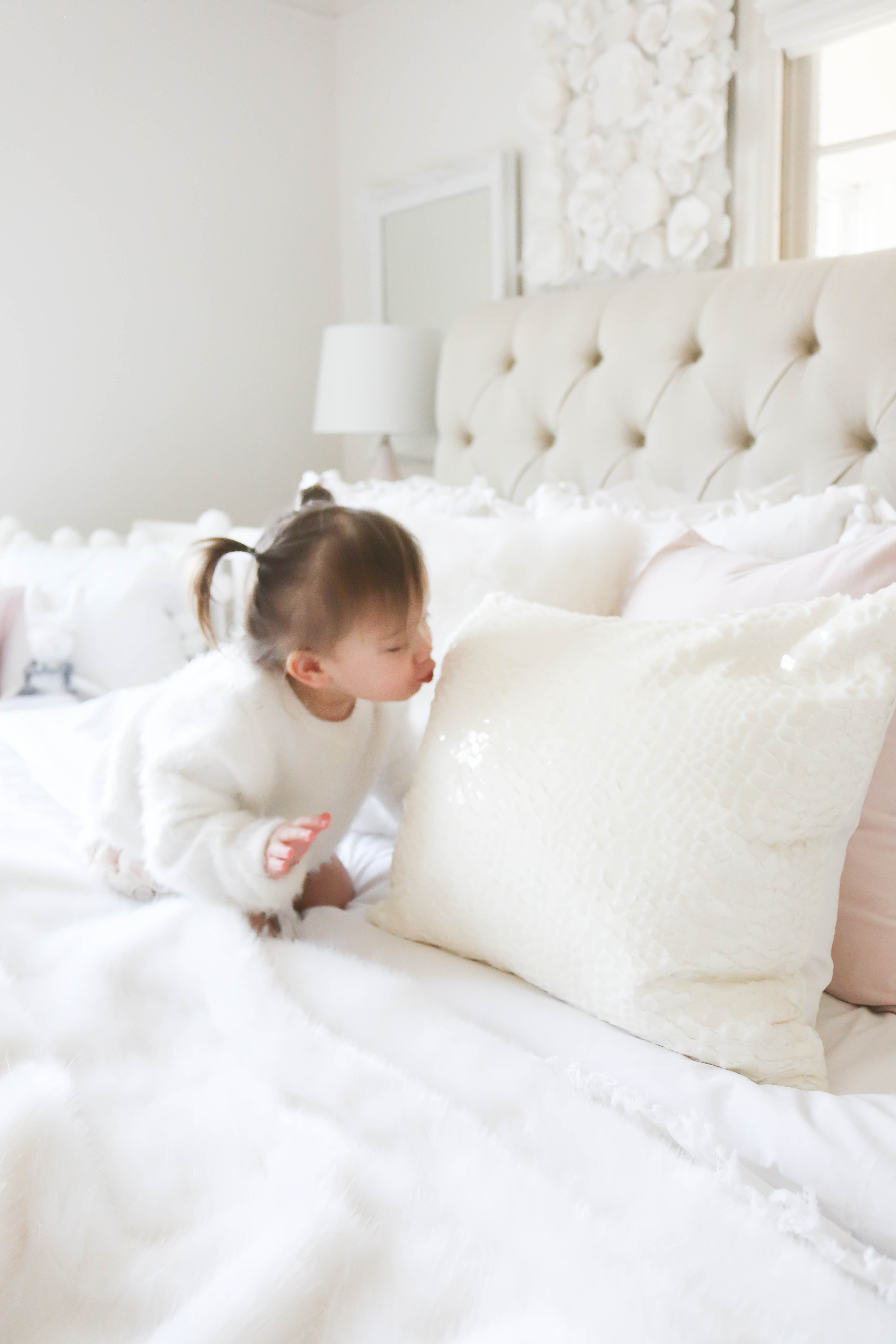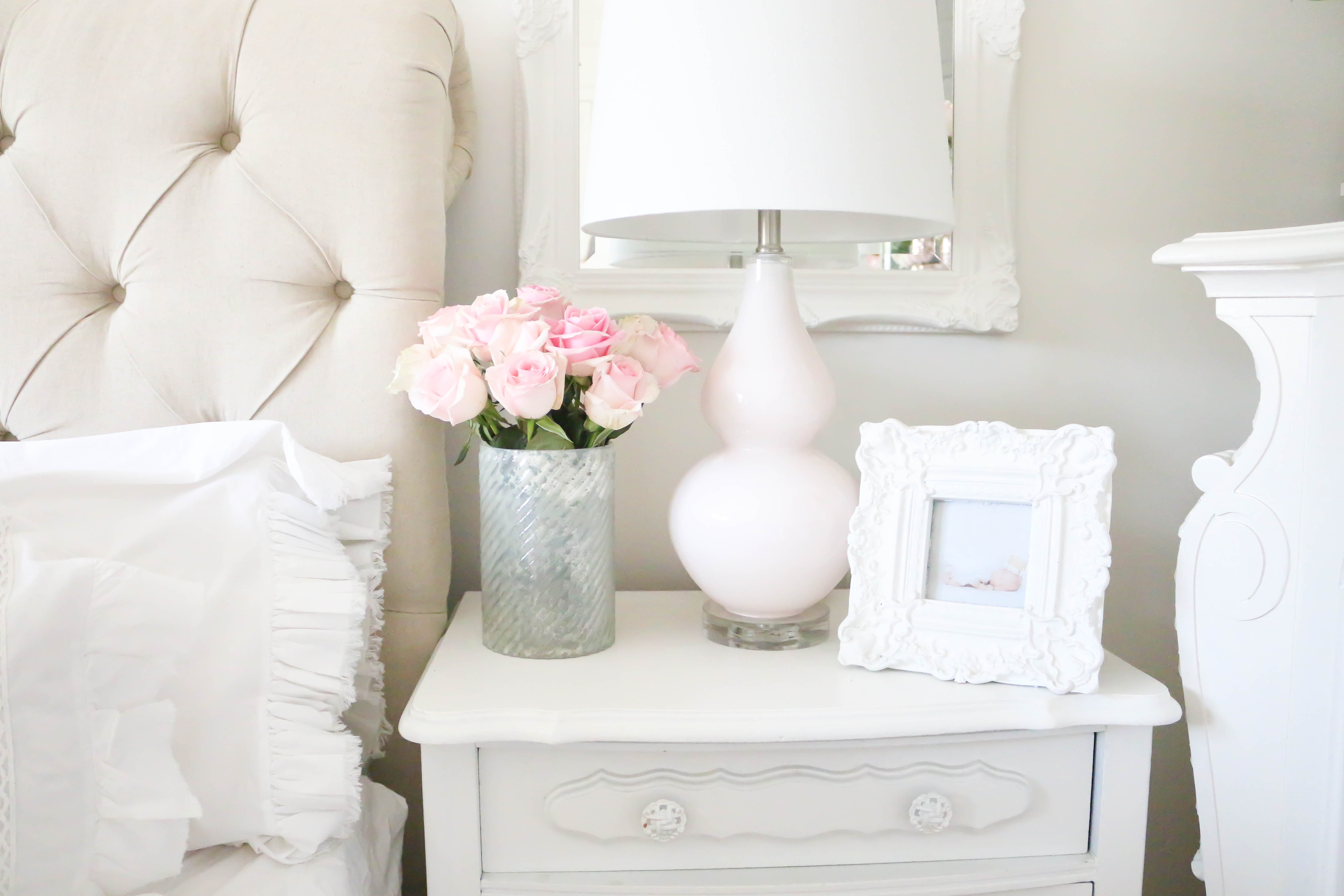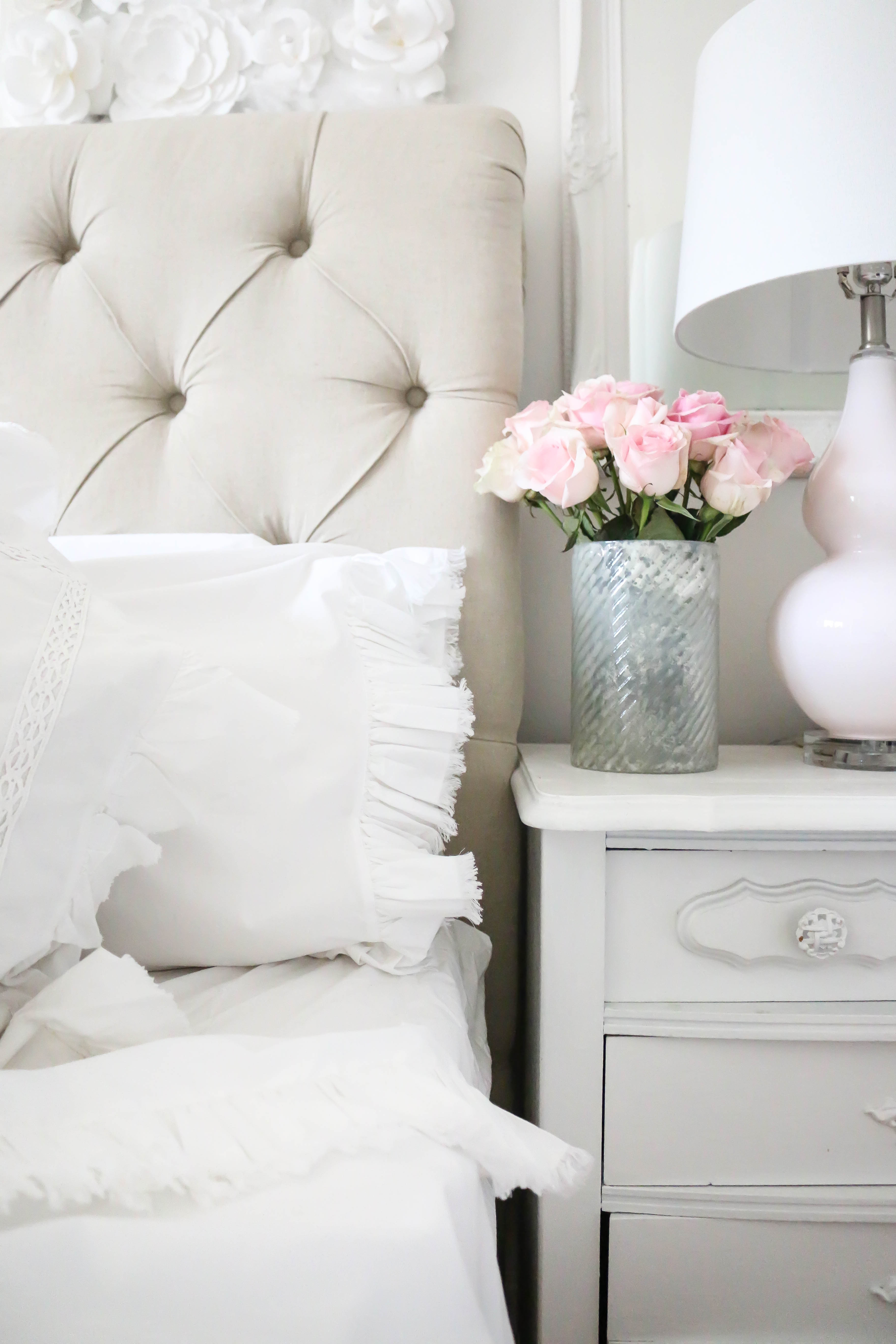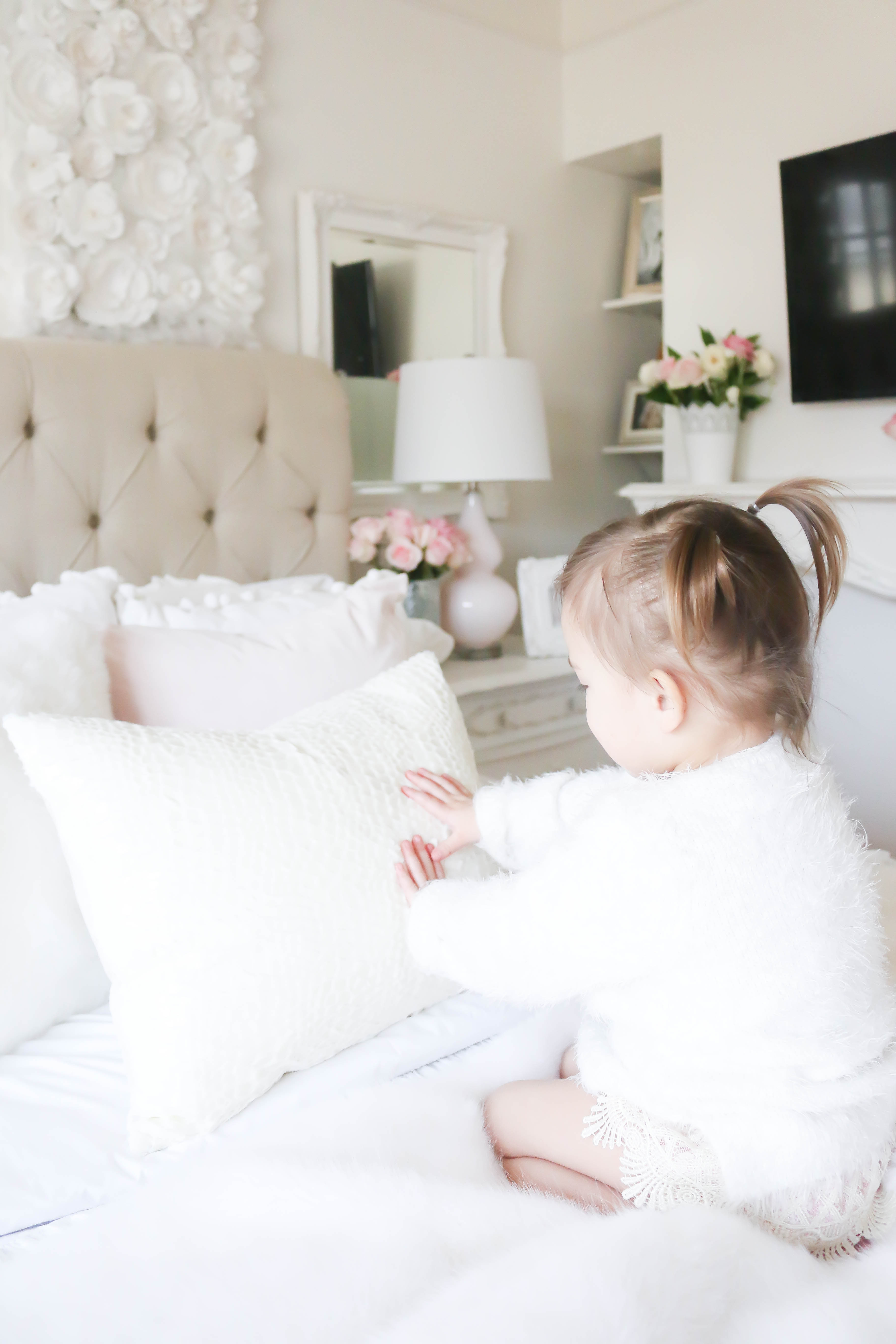First, I'd love to share our Master bedroom! I love getting new fresh bed linens for spring! The Annie Selke's Artisanal Collection has the most darling ruffle sheets here! They are so soft and comfy! Also, I love to add some new throw pillows to my bed! I found this amazing ivory gloss velvet throw pillow here! As you can see in the photos below, Bella LOVES it! I still keep my winter throws in the bedroom because we live in the frozen tundra and it can still get pretty chilly into the late spring. I also switched out our wood lamps for these beautiful pink glass lamps! They add a refreshing light touch. Lastly, adding fresh flower or plants to the room can instantly give the feeling of spring!
