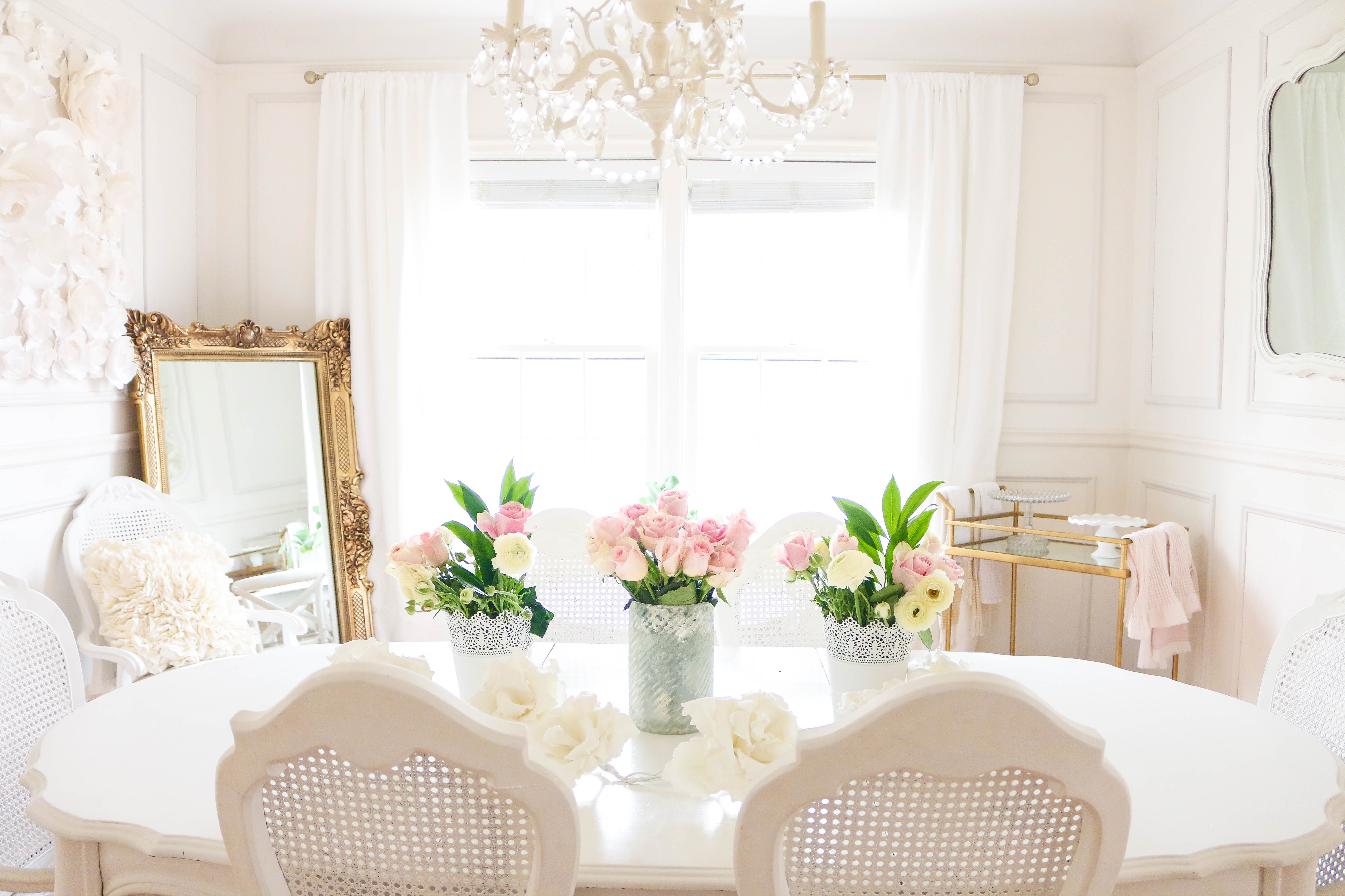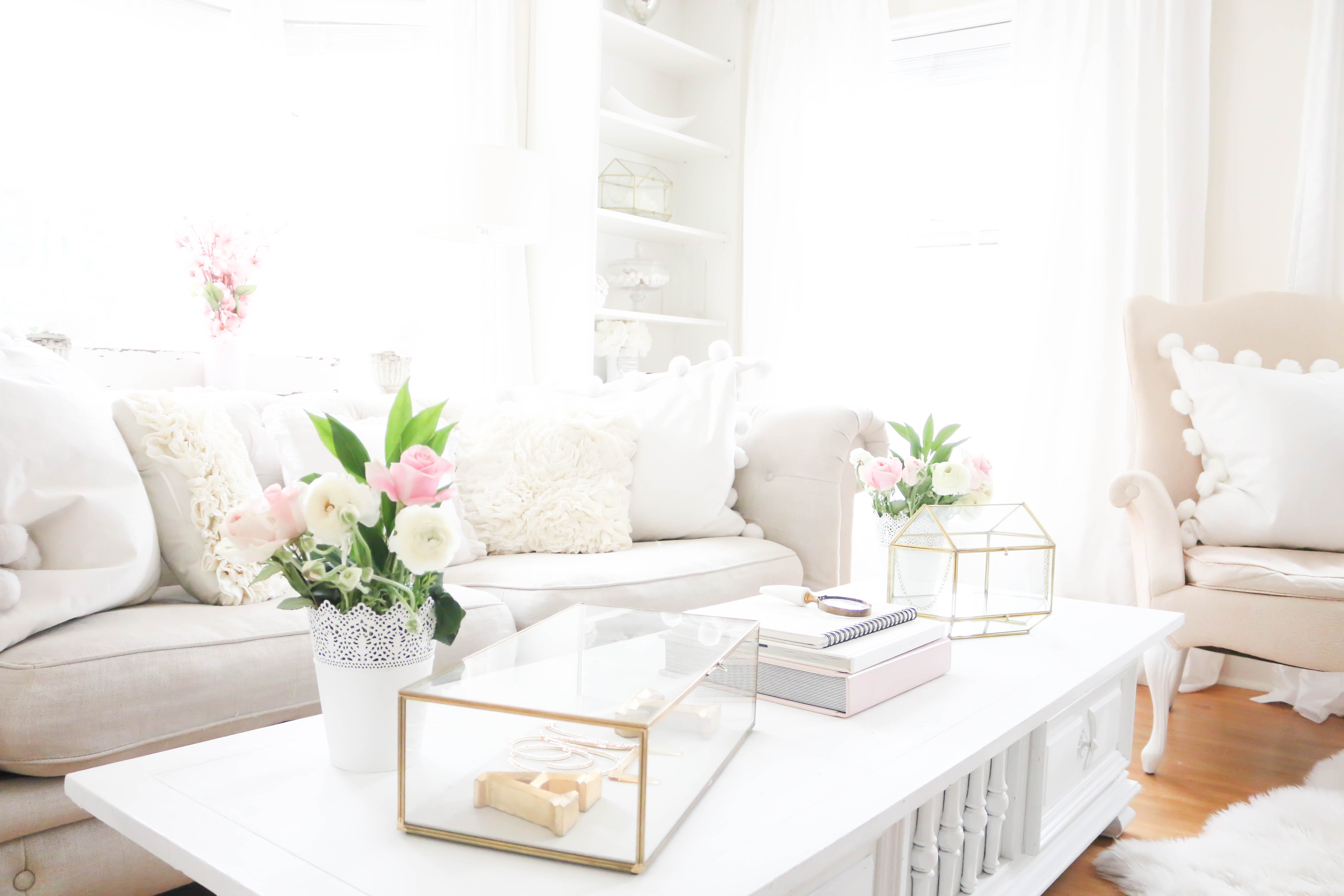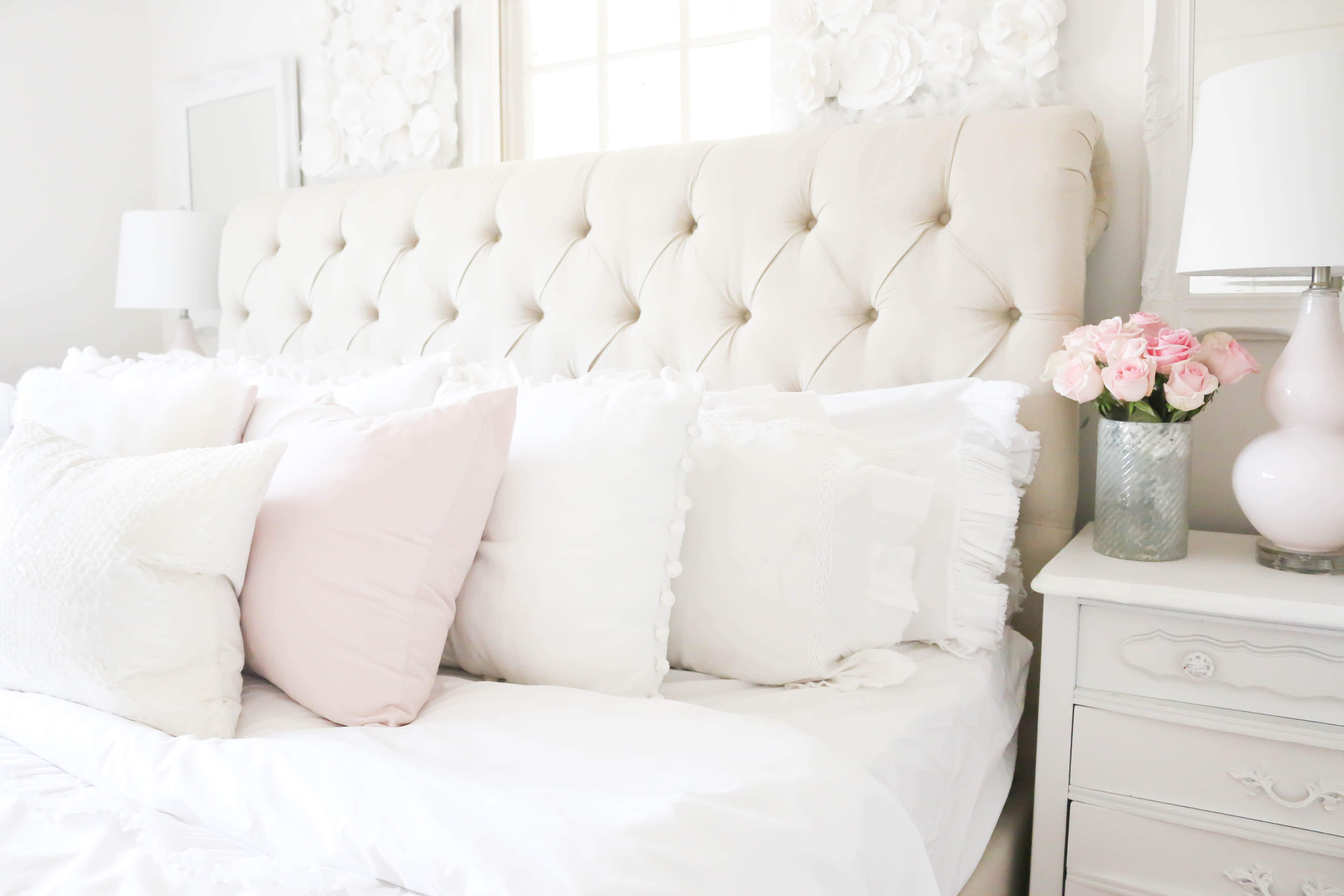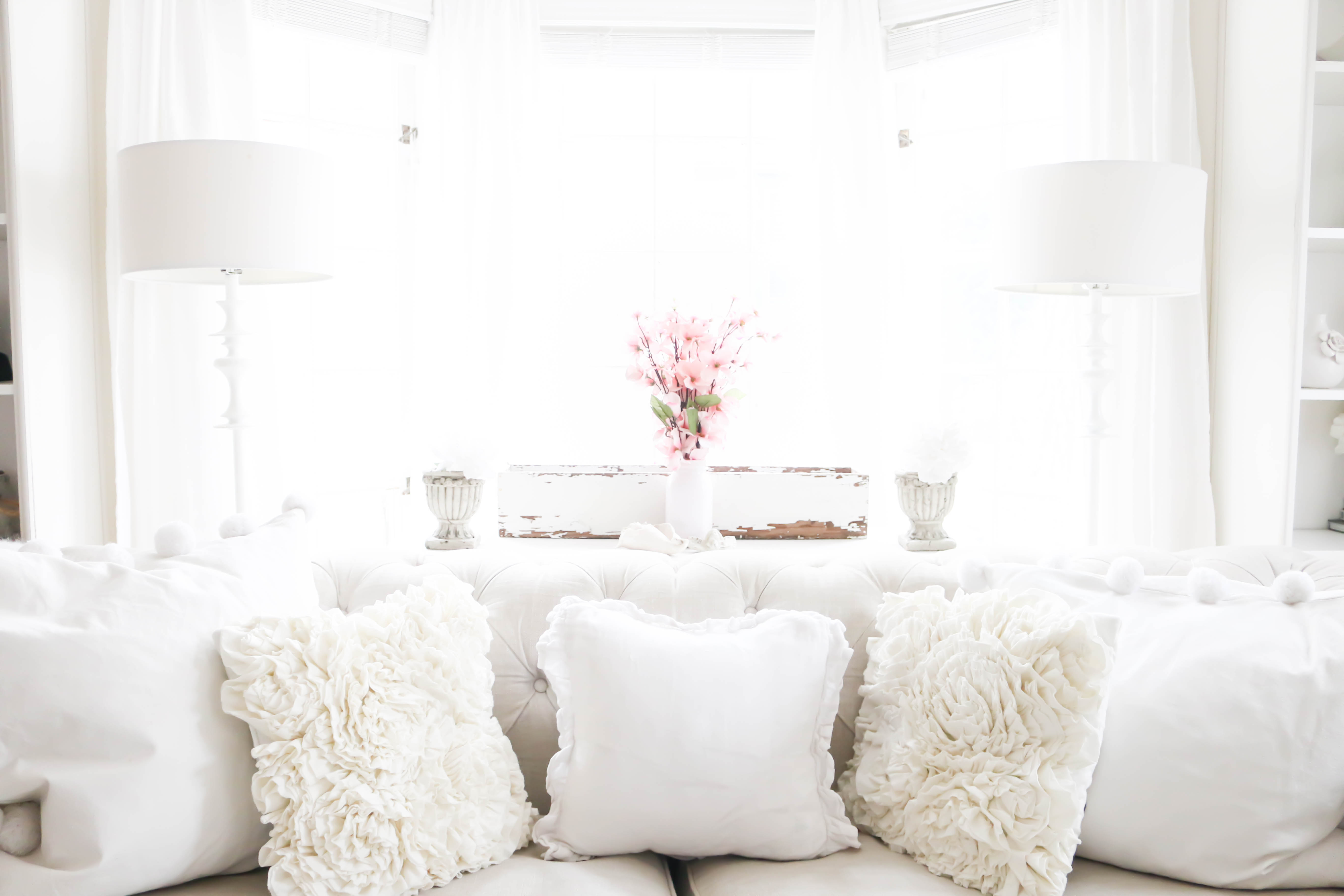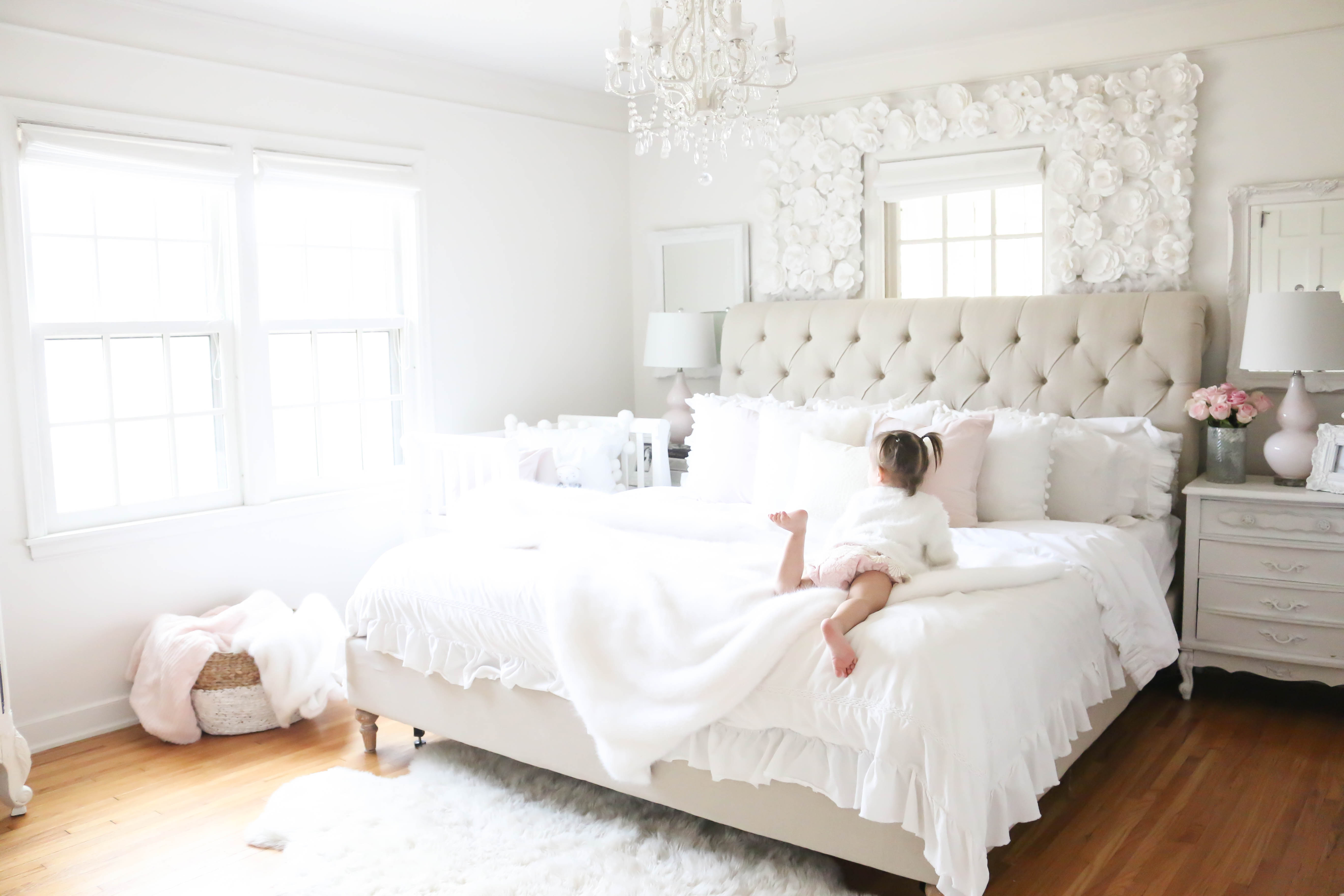 First, I'd love to share our Master bedroom! I love getting new fresh bed linens for spring! The Annie Selke's Artisanal Collection has the most darling ruffle sheets here! They are so soft and comfy! Also, I love to add some new throw pillows to my bed! I found this amazing ivory gloss velvet throw pillow here! As you can see in the photos below, Bella LOVES it! I still keep my winter throws in the bedroom because we live in the frozen tundra and it can still get pretty chilly into the late spring. I also switched out our wood lamps for these beautiful pink glass lamps! They add a refreshing light touch. Lastly, adding fresh flower or plants to the room can instantly give the feeling of spring!