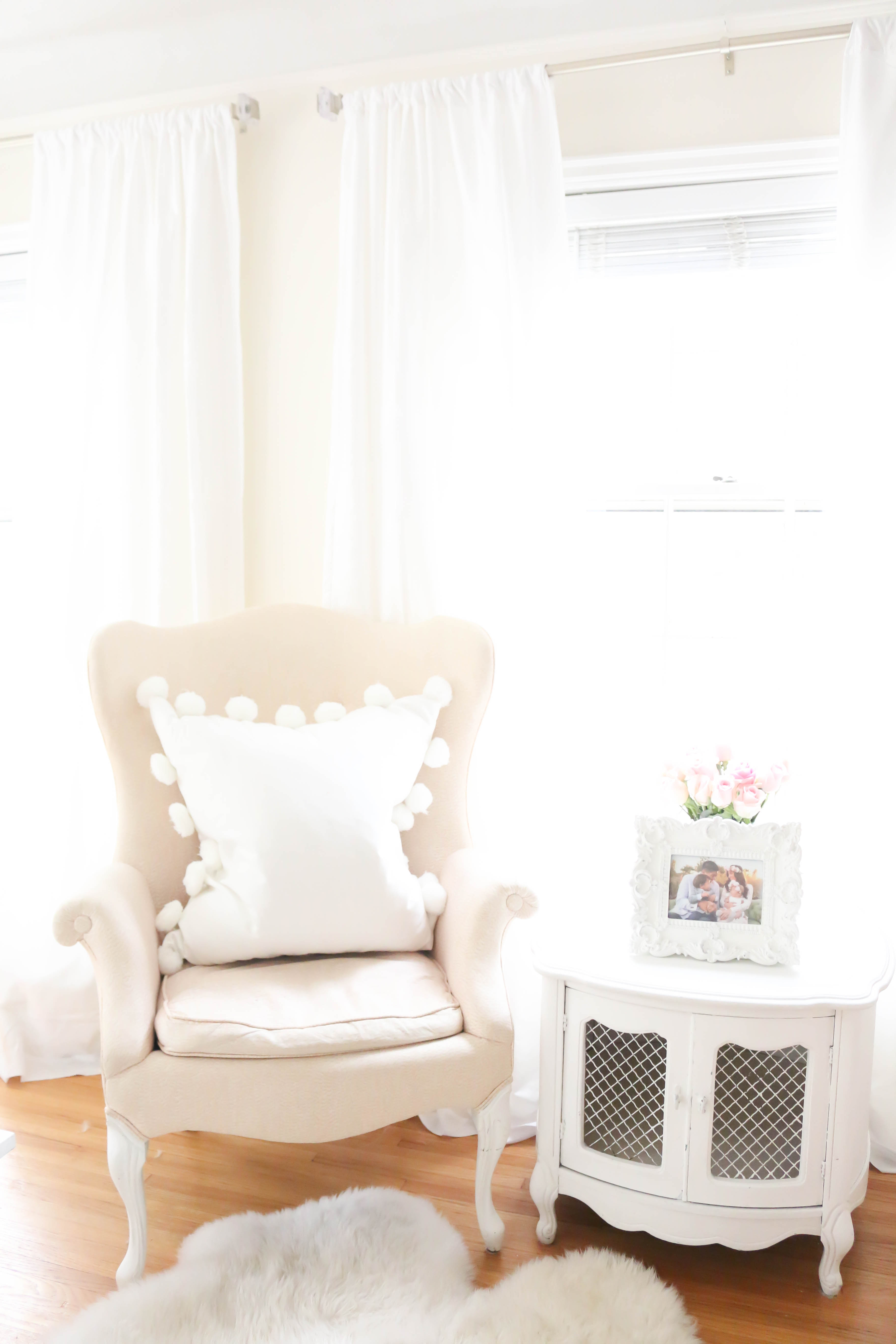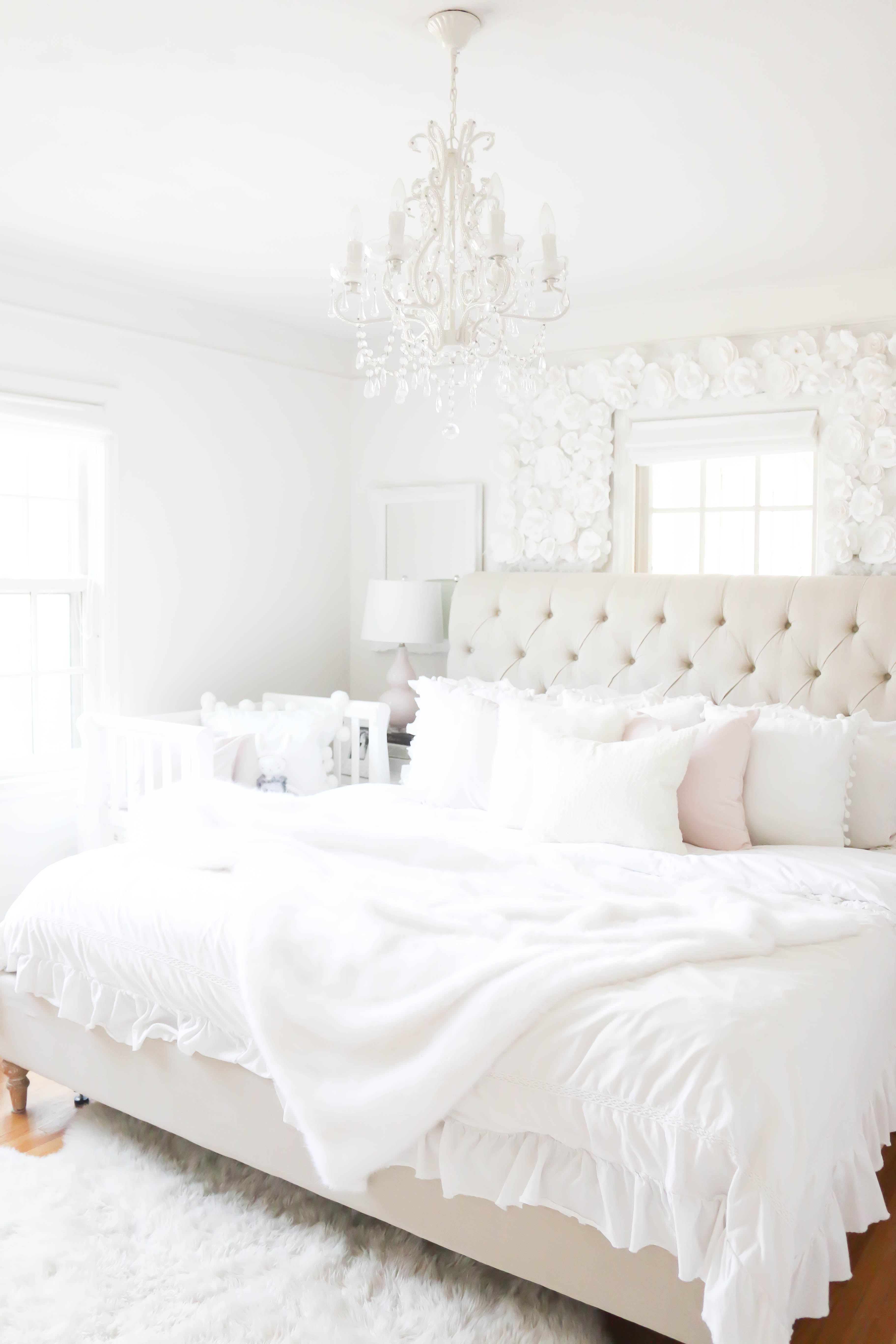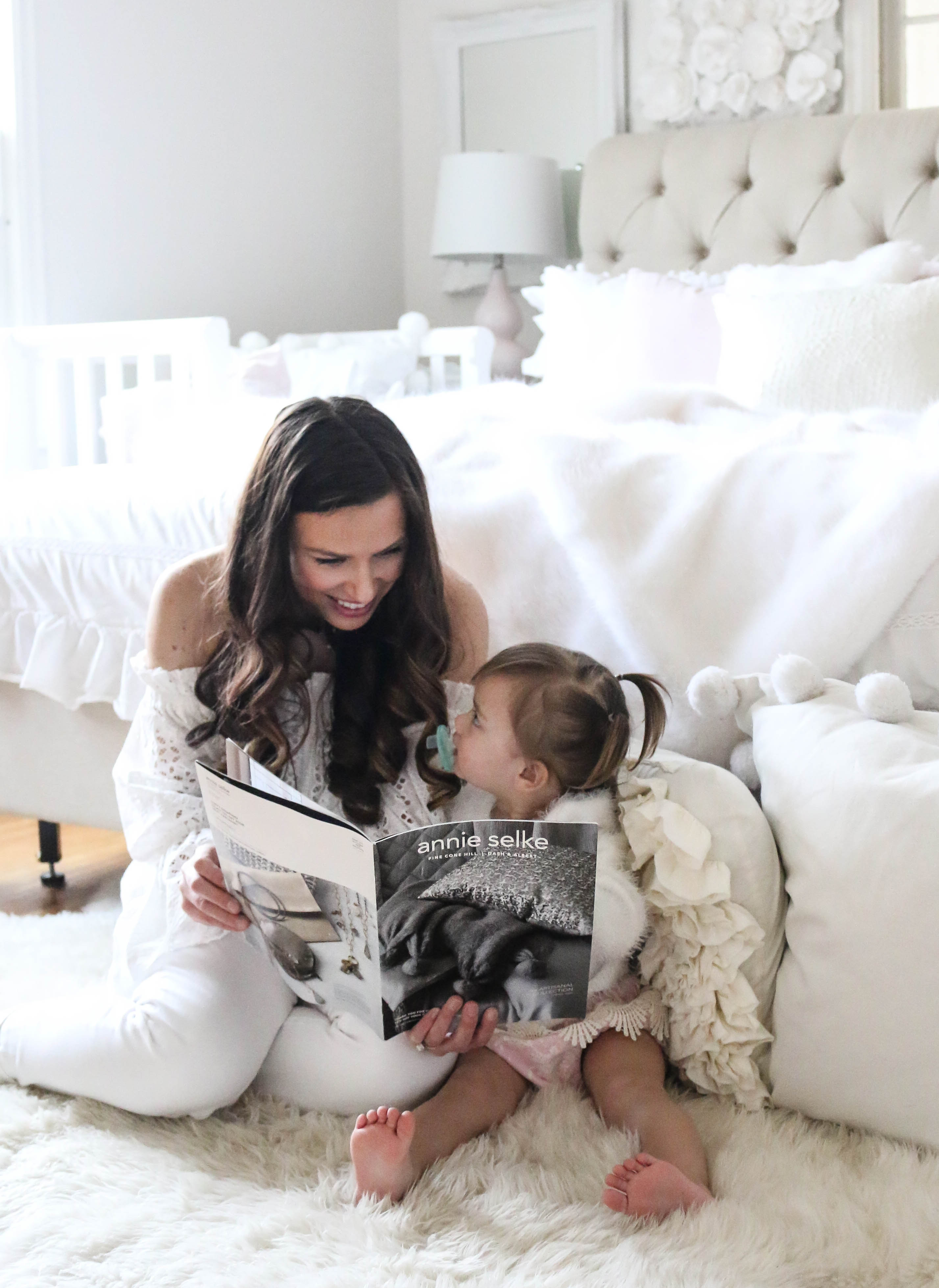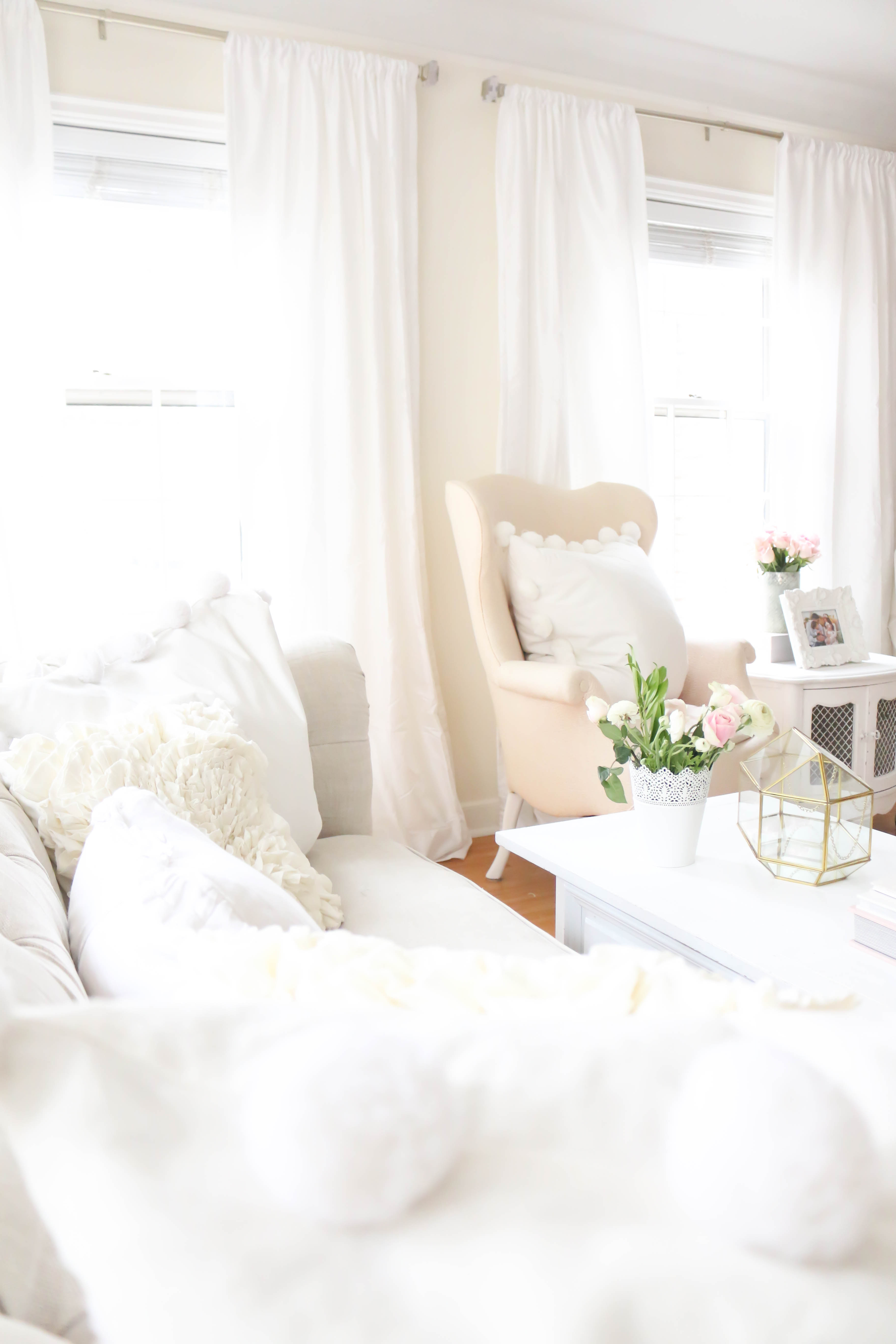 First, I'd love to share our Master bedroom! I love getting new fresh bed linens for spring! The Annie Selke's Artisanal Collection has the most darling ruffle sheets here! They are so soft and comfy! Also, I love to add some new throw pillows to my bed! I found this amazing ivory gloss velvet throw pillow here! As you can see in the photos below, Bella LOVES it! I still keep my winter throws in the bedroom because we live in the frozen tundra and it can still get pretty chilly into the late spring. I also switched out our wood lamps for these beautiful pink glass lamps! They add a refreshing light touch. Lastly, adding fresh flower or plants to the room can instantly give the feeling of spring!