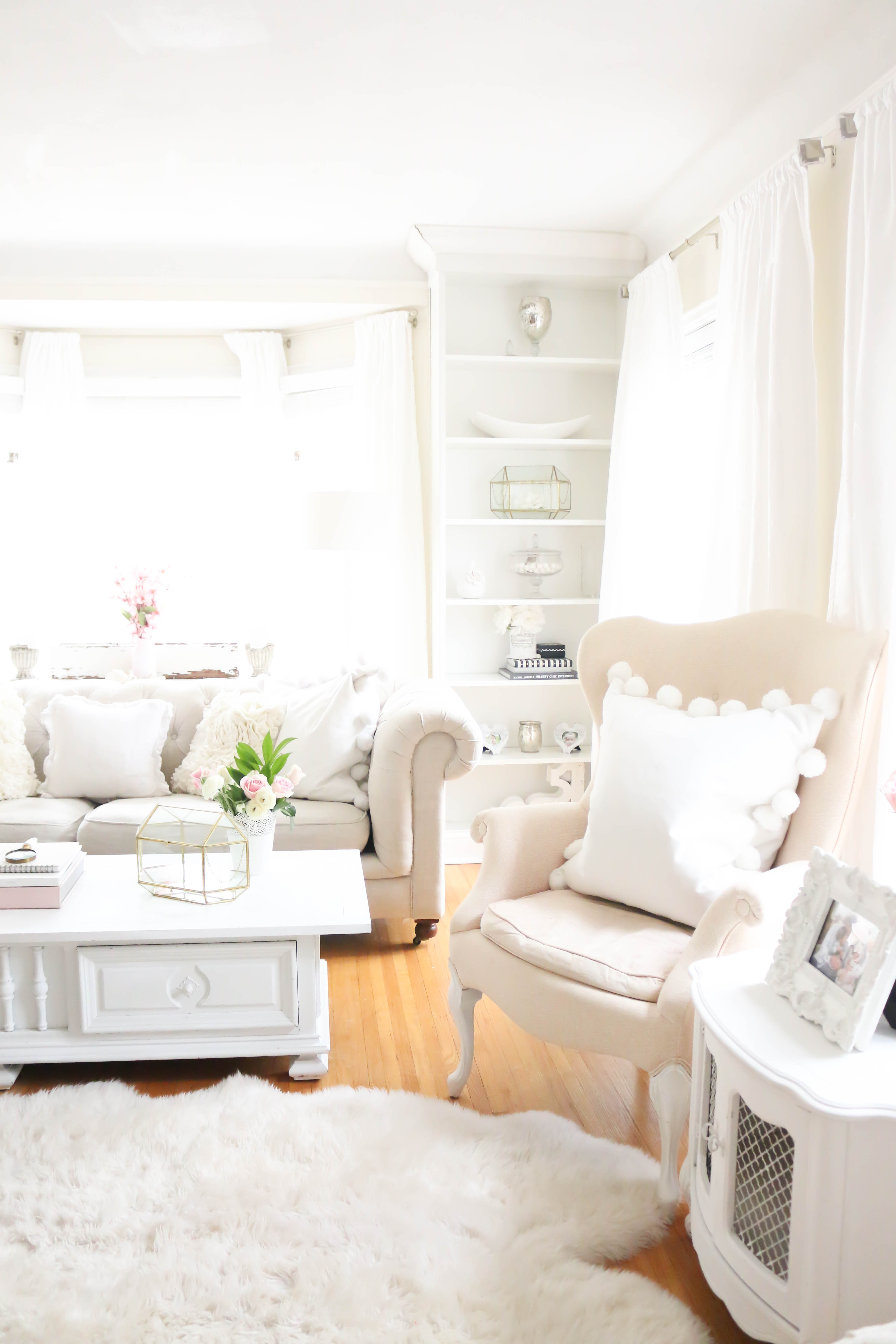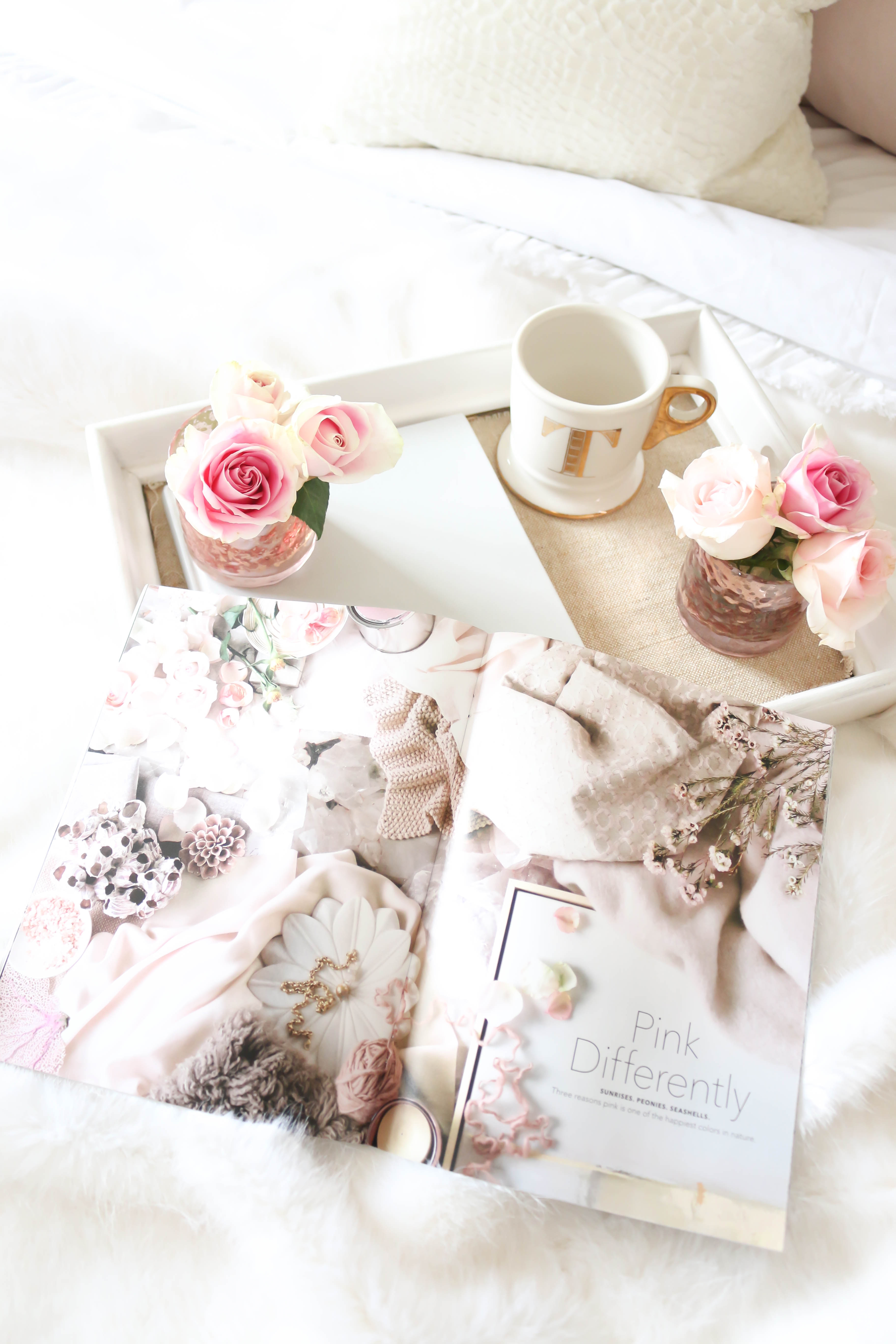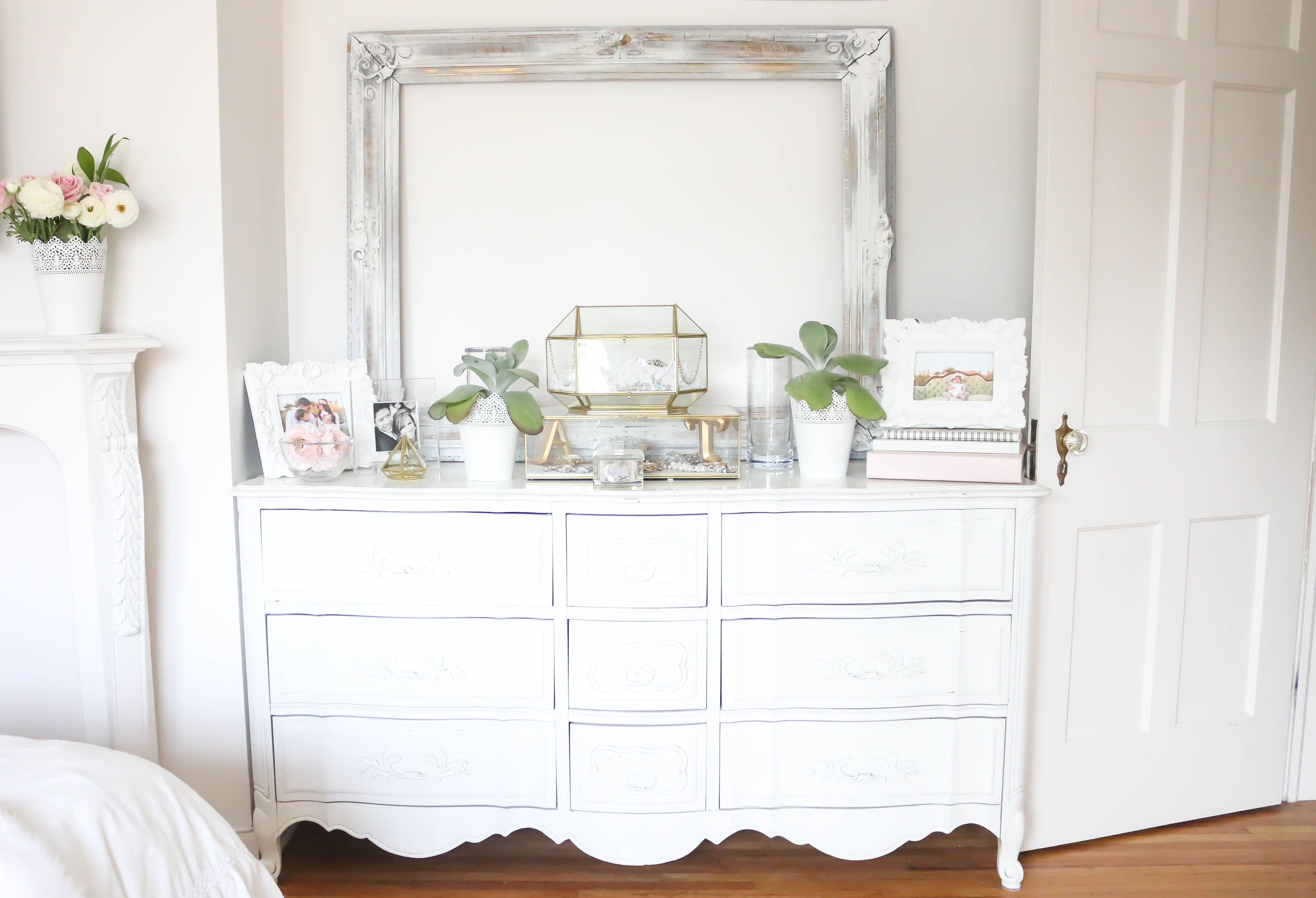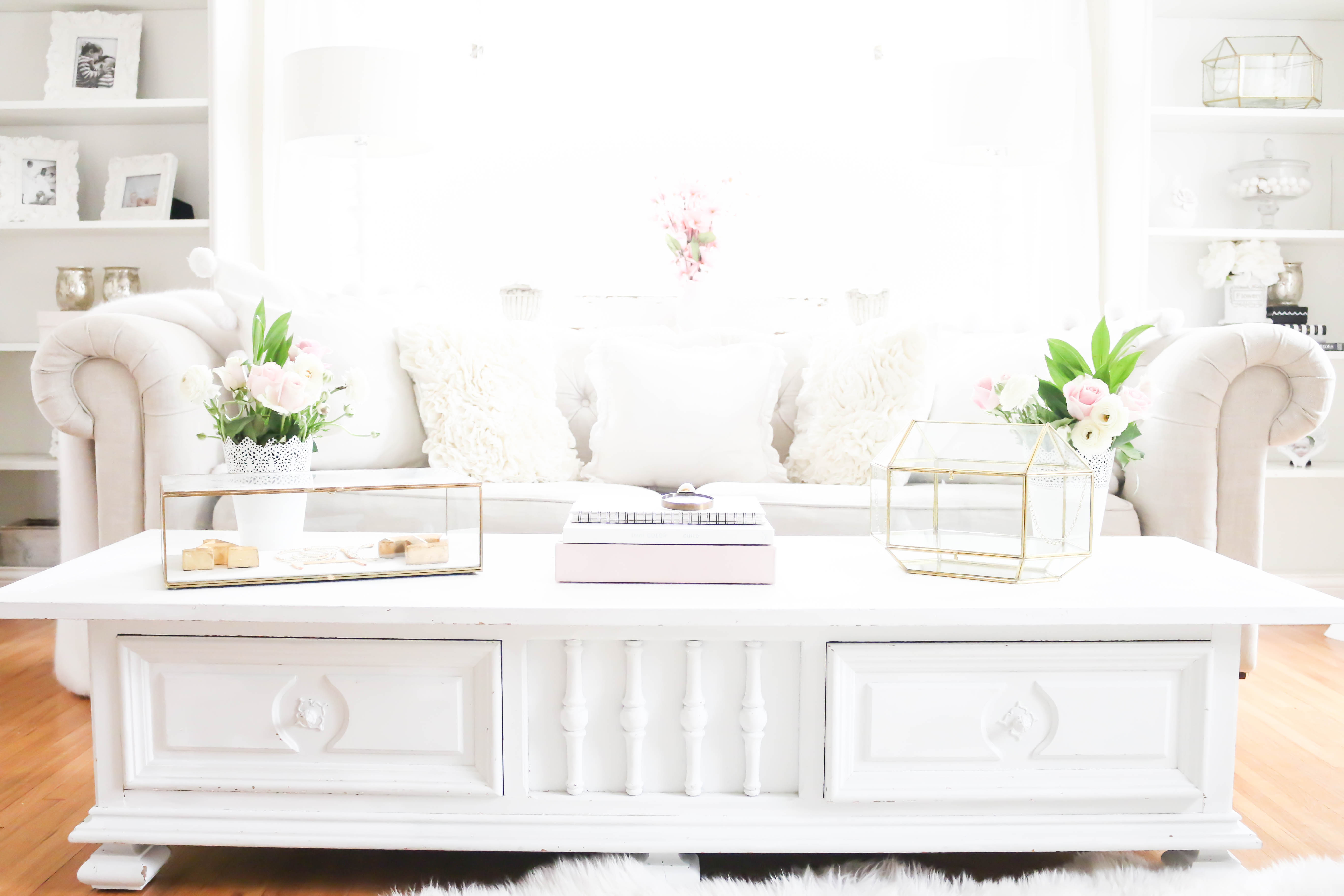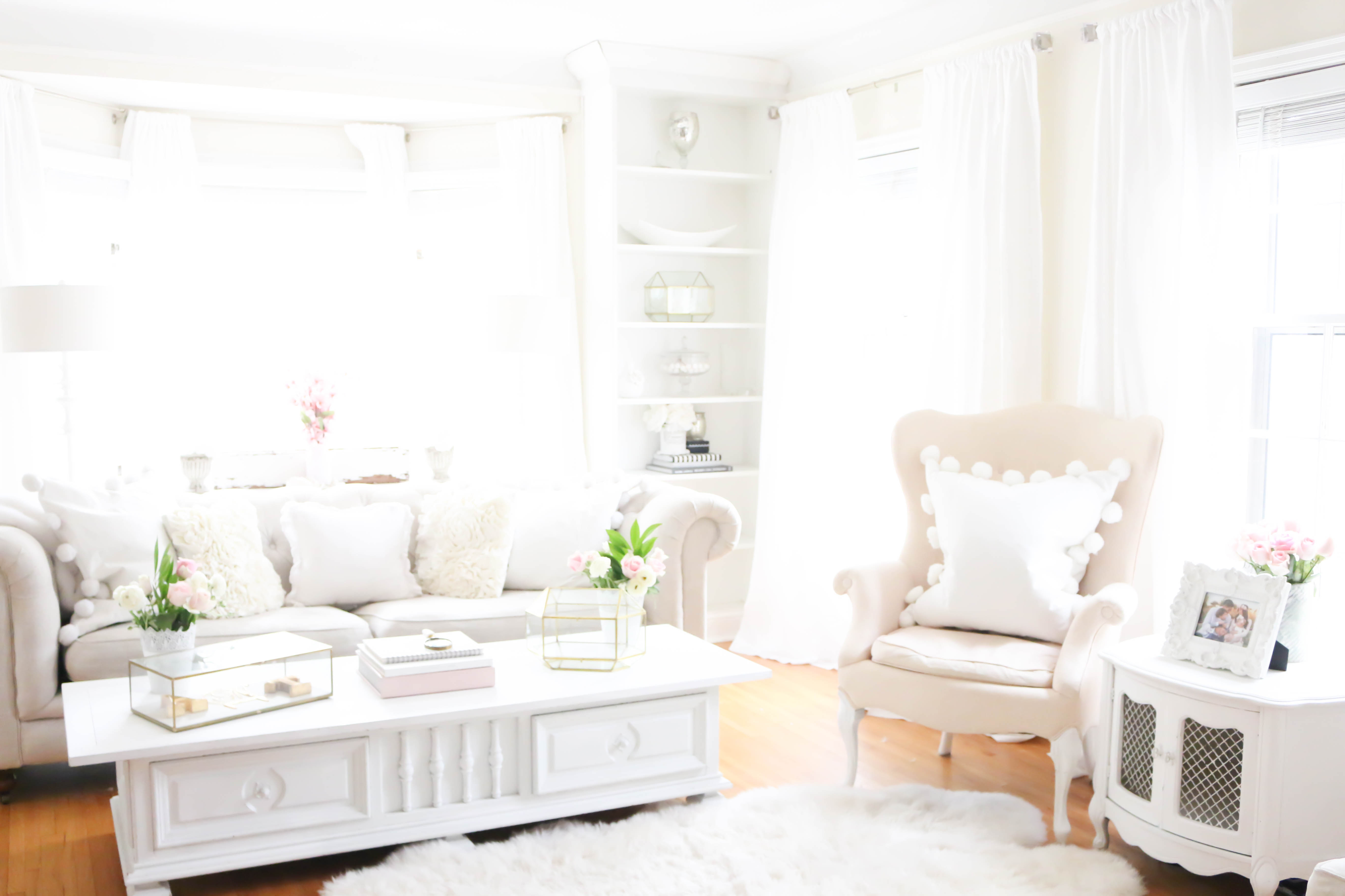 First, I'd love to share our Master bedroom! I love getting new fresh bed linens for spring! The Annie Selke's Artisanal Collection has the most darling ruffle sheets here! They are so soft and comfy! Also, I love to add some new throw pillows to my bed! I found this amazing ivory gloss velvet throw pillow here! As you can see in the photos below, Bella LOVES it! I still keep my winter throws in the bedroom because we live in the frozen tundra and it can still get pretty chilly into the late spring. I also switched out our wood lamps for these beautiful pink glass lamps! They add a refreshing light touch. Lastly, adding fresh flower or plants to the room can instantly give the feeling of spring!