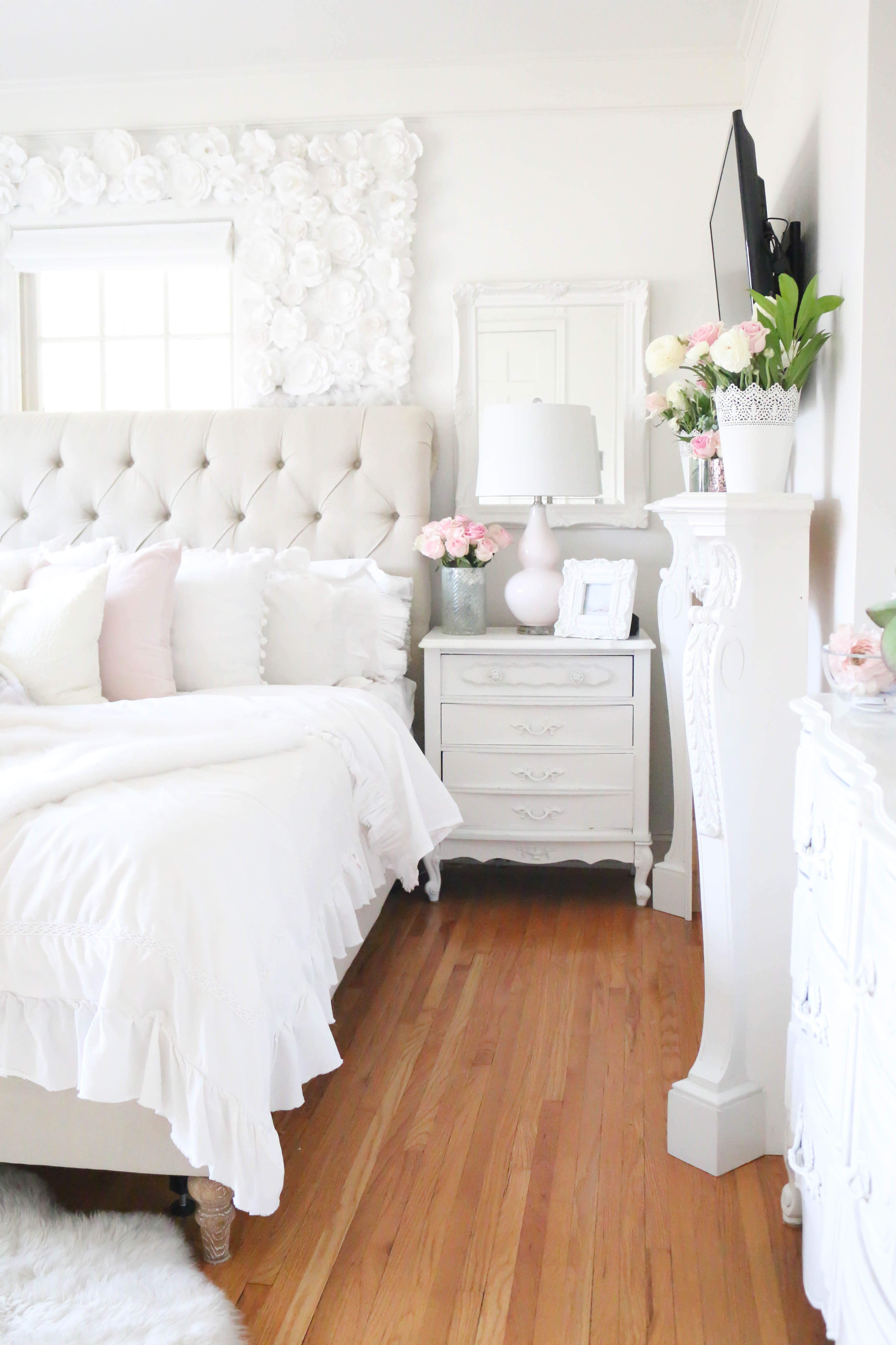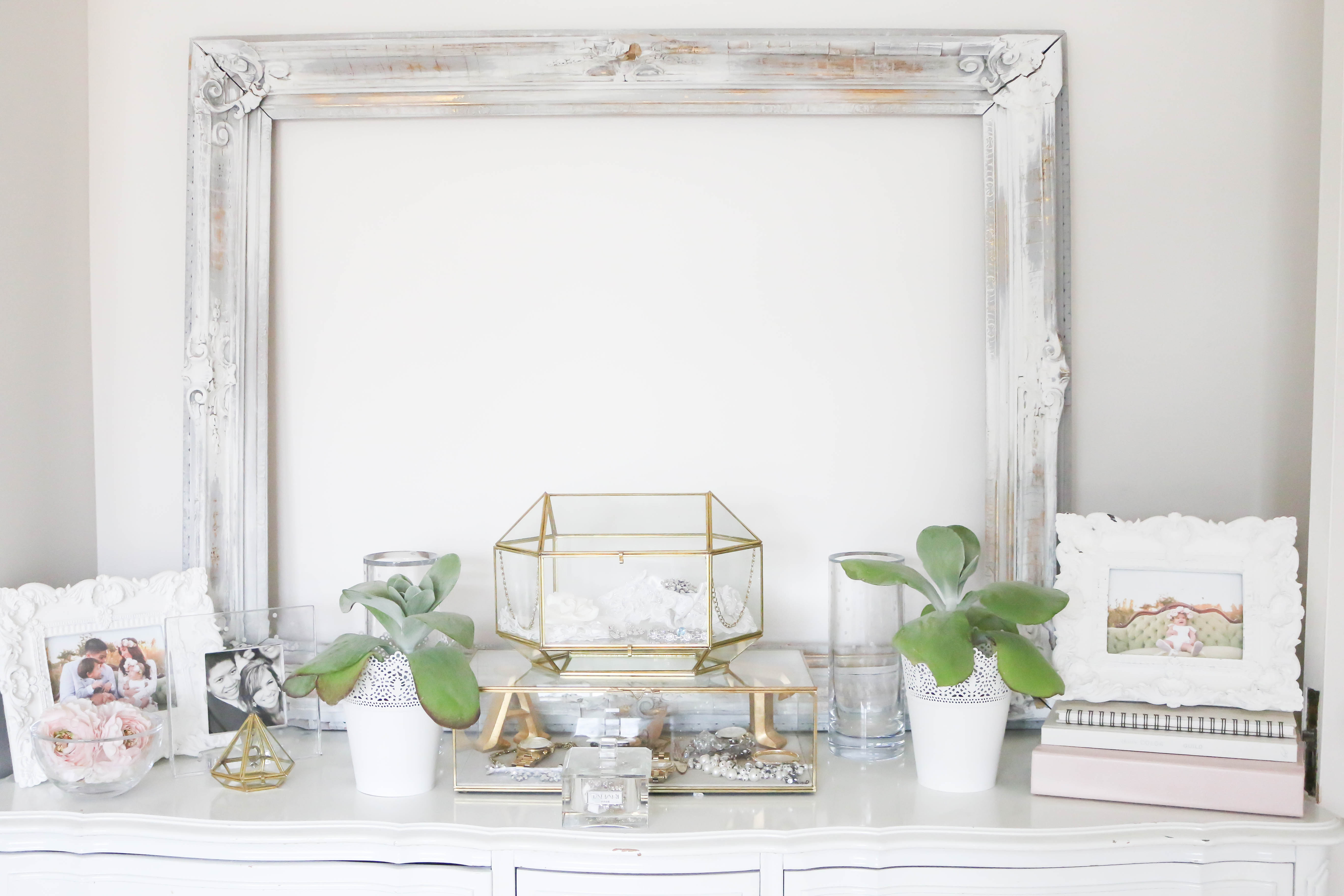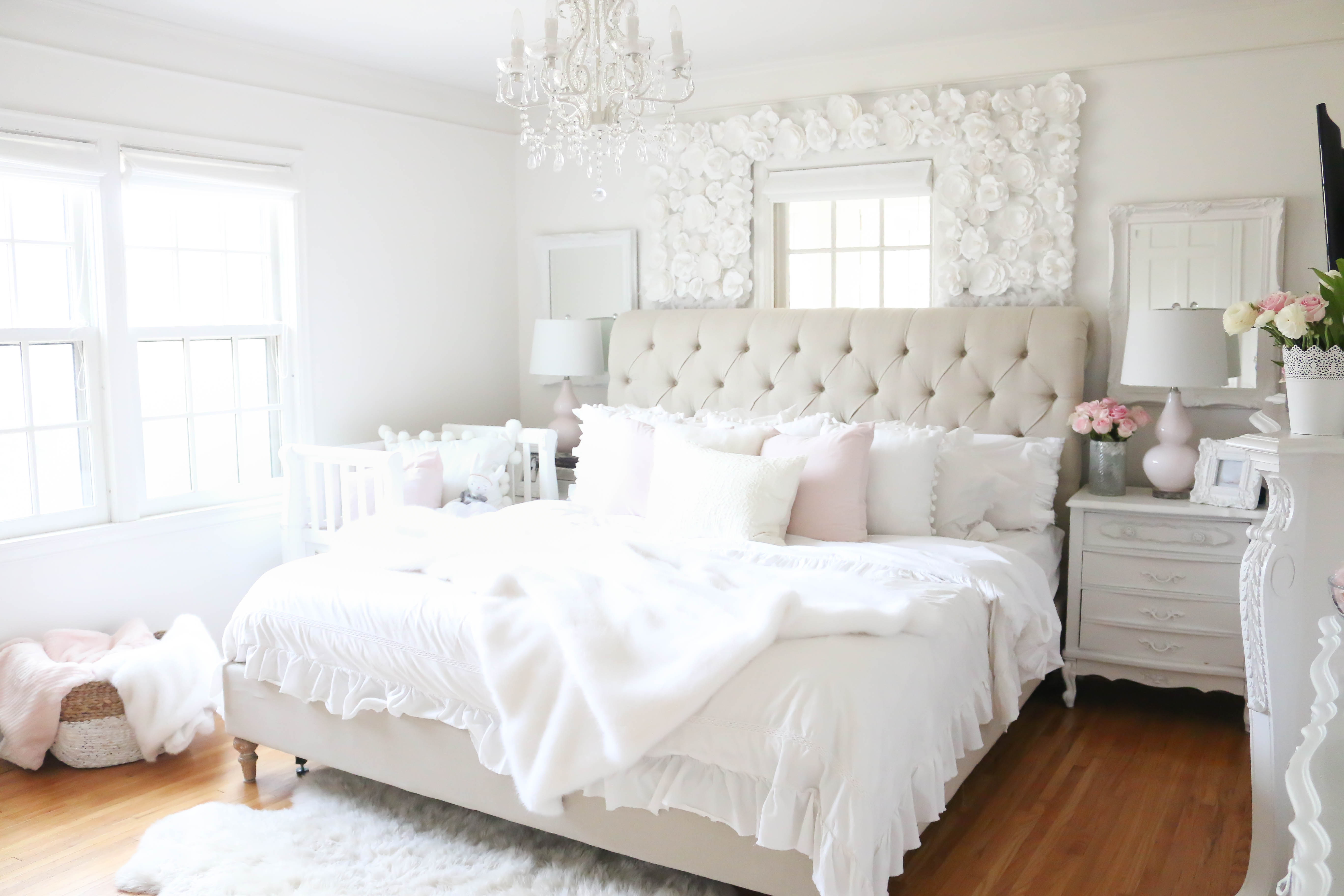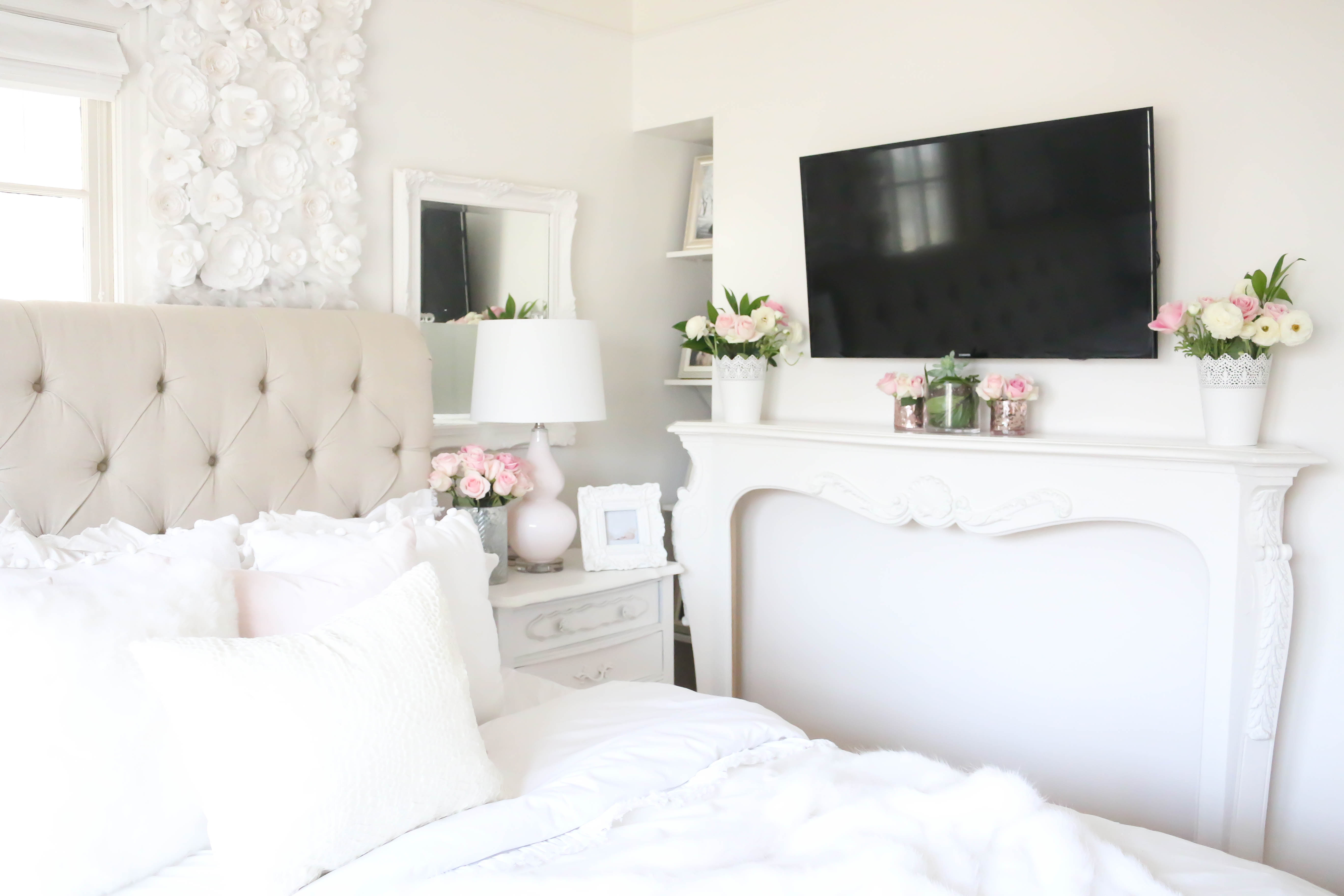 First, I'd love to share our Master bedroom! I love getting new fresh bed linens for spring! The Annie Selke's Artisanal Collection has the most darling ruffle sheets here! They are so soft and comfy! Also, I love to add some new throw pillows to my bed! I found this amazing ivory gloss velvet throw pillow here! As you can see in the photos below, Bella LOVES it! I still keep my winter throws in the bedroom because we live in the frozen tundra and it can still get pretty chilly into the late spring. I also switched out our wood lamps for these beautiful pink glass lamps! They add a refreshing light touch. Lastly, adding fresh flower or plants to the room can instantly give the feeling of spring!