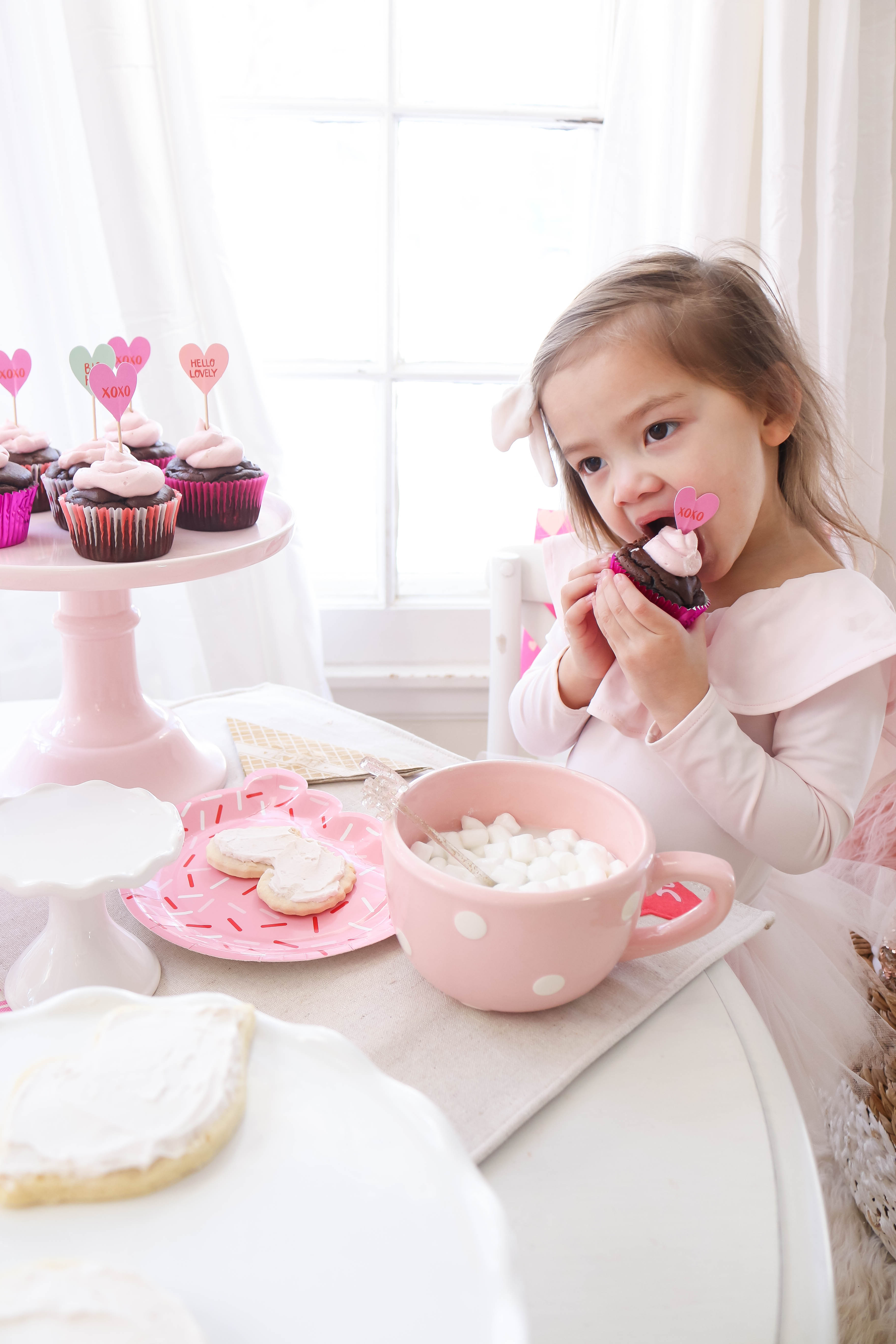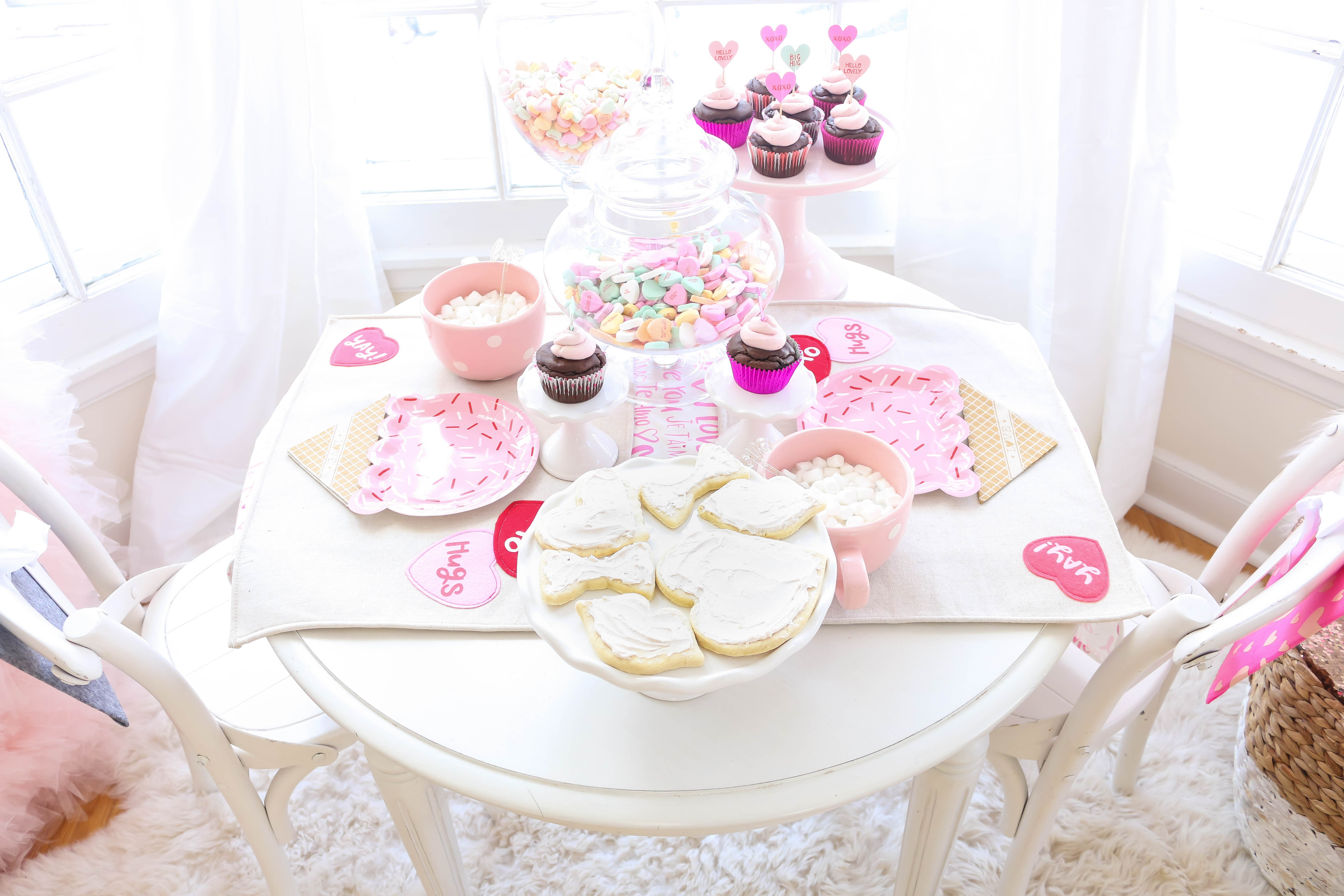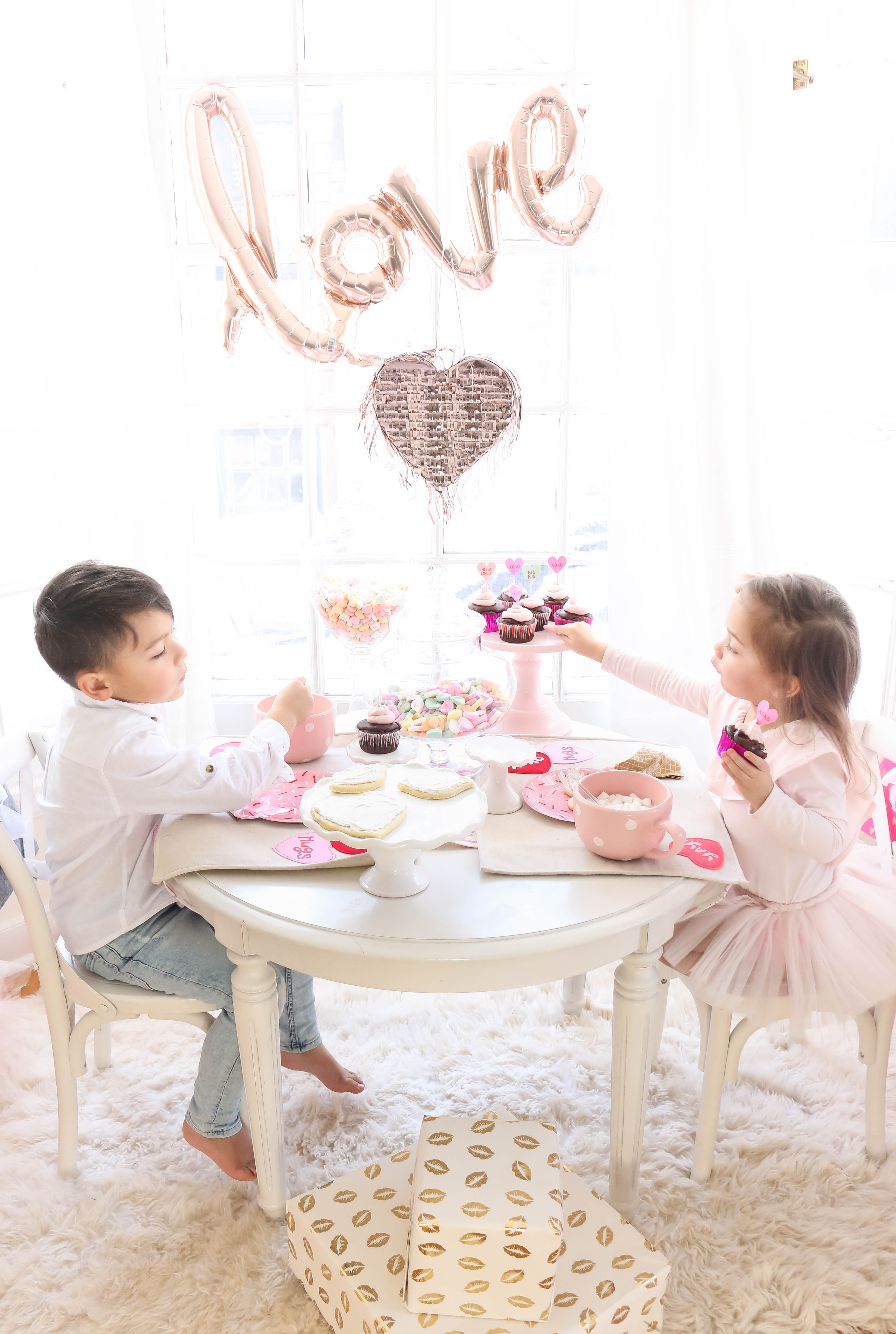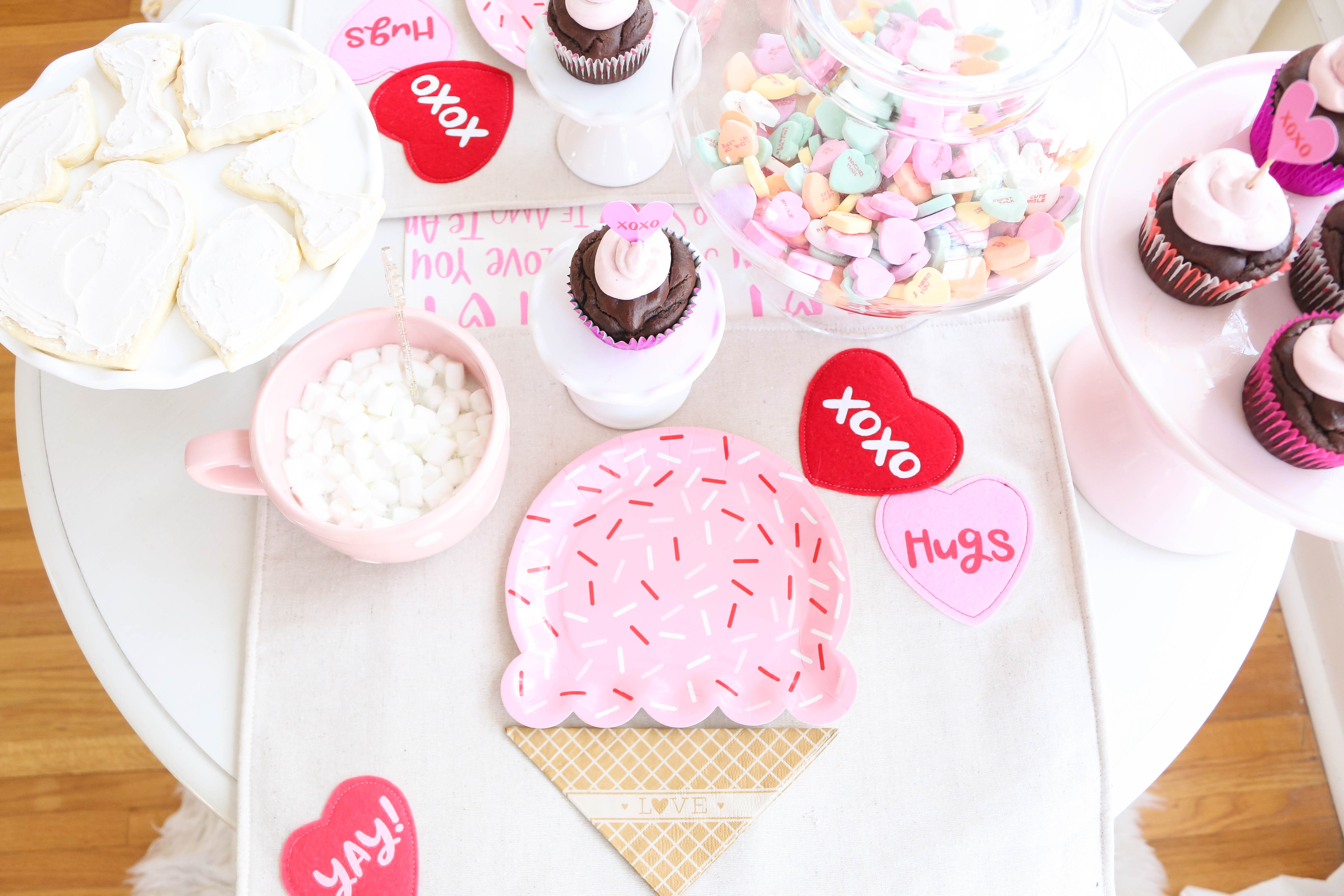 Today, I'm sharing a cute little pre Valentine's day party I threw for Camden and Bella! We ate cupcakes and cookies, drank hot cocoa and made our Valentine's for their friends. I purchased a table runner and place mats from the Target dollar section and these envelopes on the back of their chairs I purchased from there last year too. I just cut holes in them and attached them to their chairs with ribbon! Also...this love sign is from last year and it stayed blown up all year! Win win!!! I added all the shopping details for everything else below! I hope you all have a wonderful Valentine's day with your loved ones!