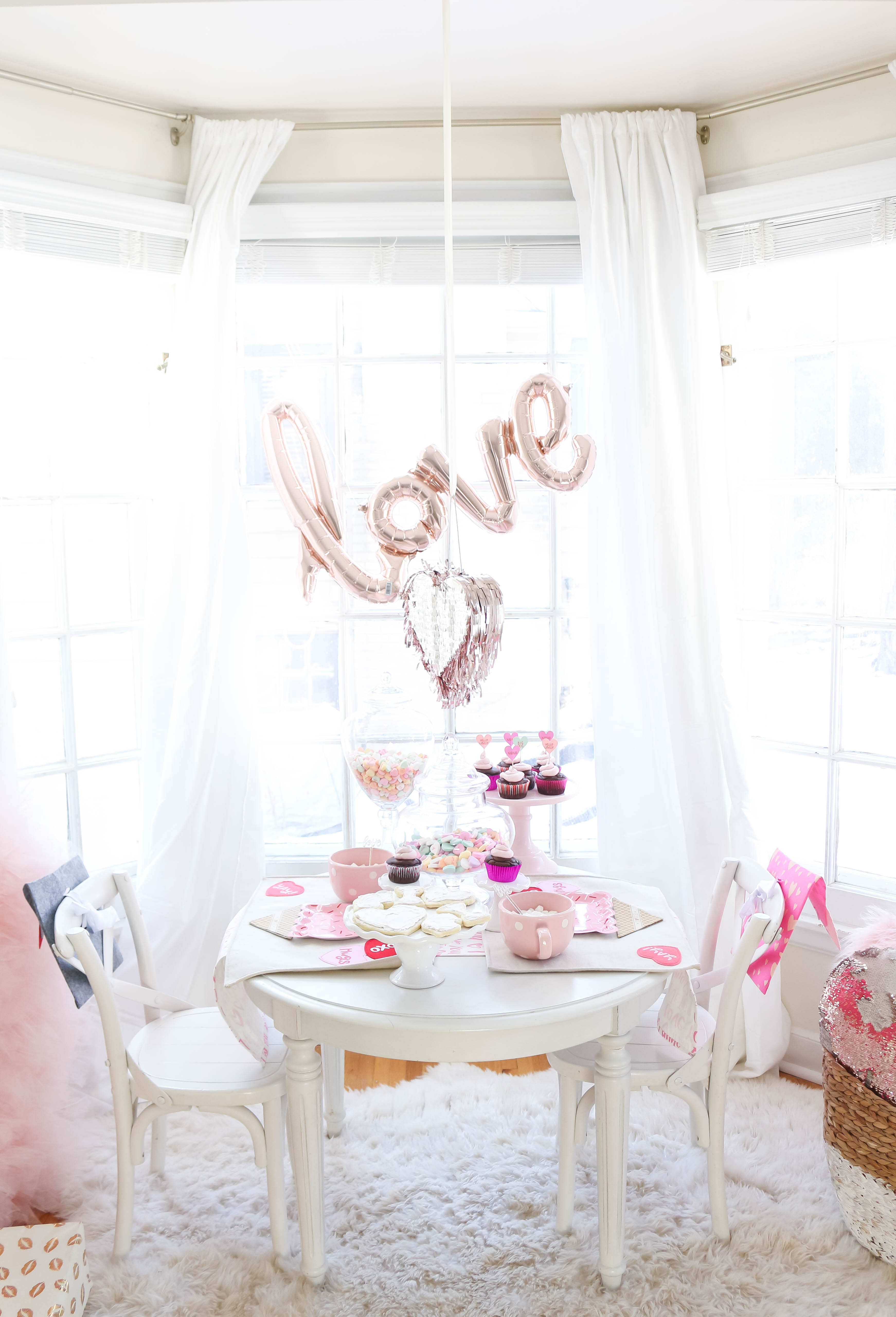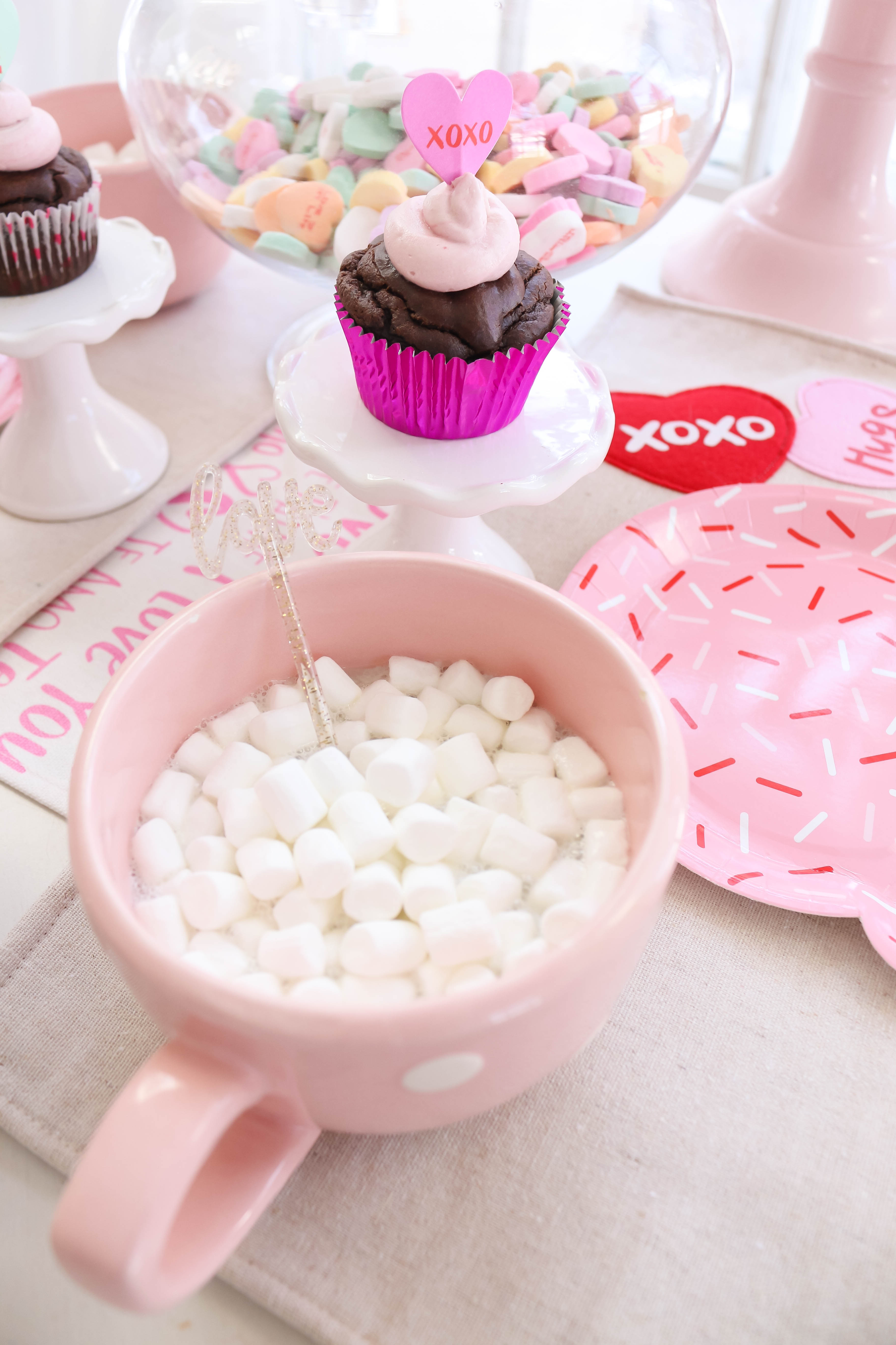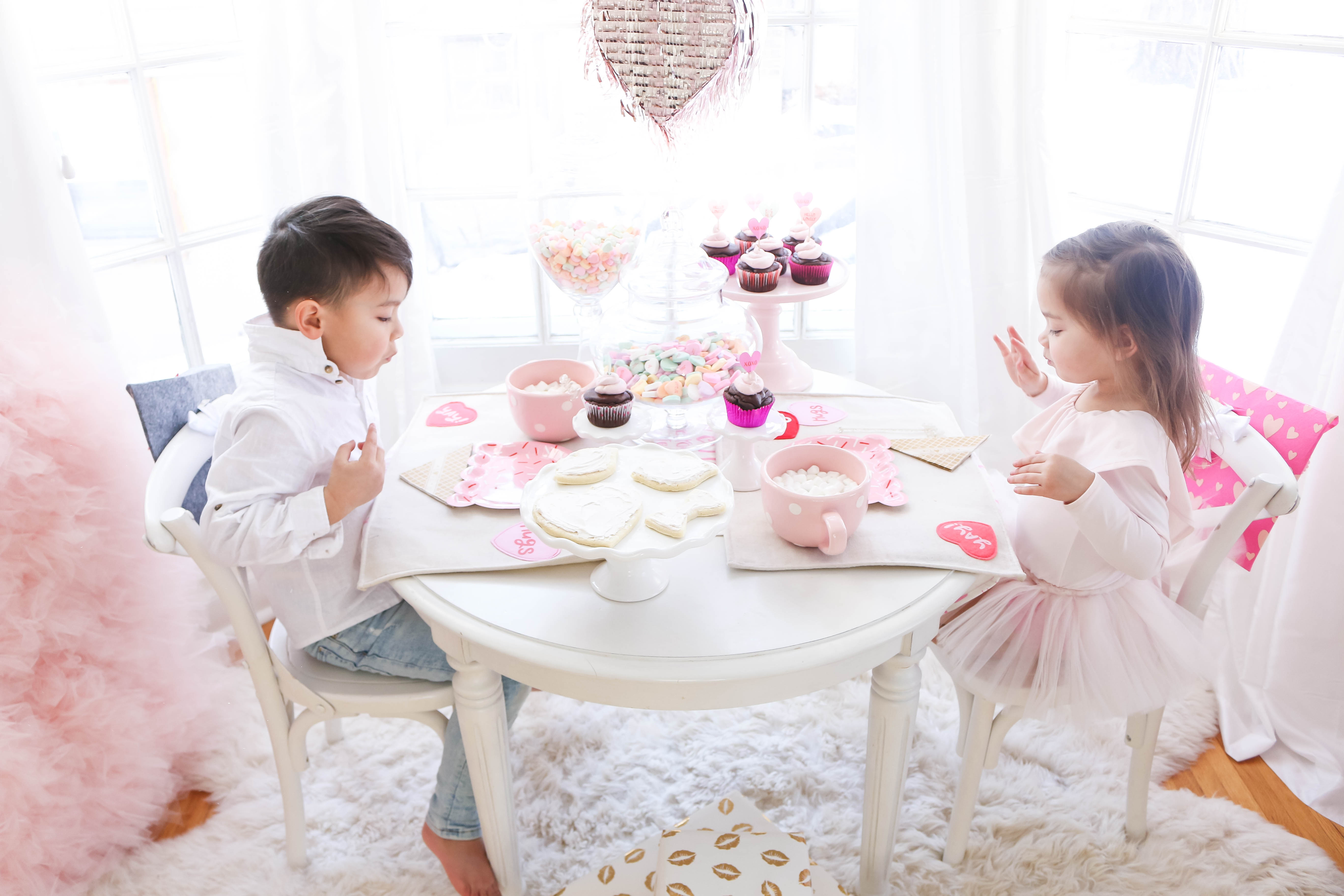 Today, I'm sharing a cute little pre Valentine's day party I threw for Camden and Bella! We ate cupcakes and cookies, drank hot cocoa and made our Valentine's for their friends. I purchased a table runner and place mats from the Target dollar section and these envelopes on the back of their chairs I purchased from there last year too. I just cut holes in them and attached them to their chairs with ribbon! Also...this love sign is from last year and it stayed blown up all year! Win win!!! I added all the shopping details for everything else below! I hope you all have a wonderful Valentine's day with your loved ones!