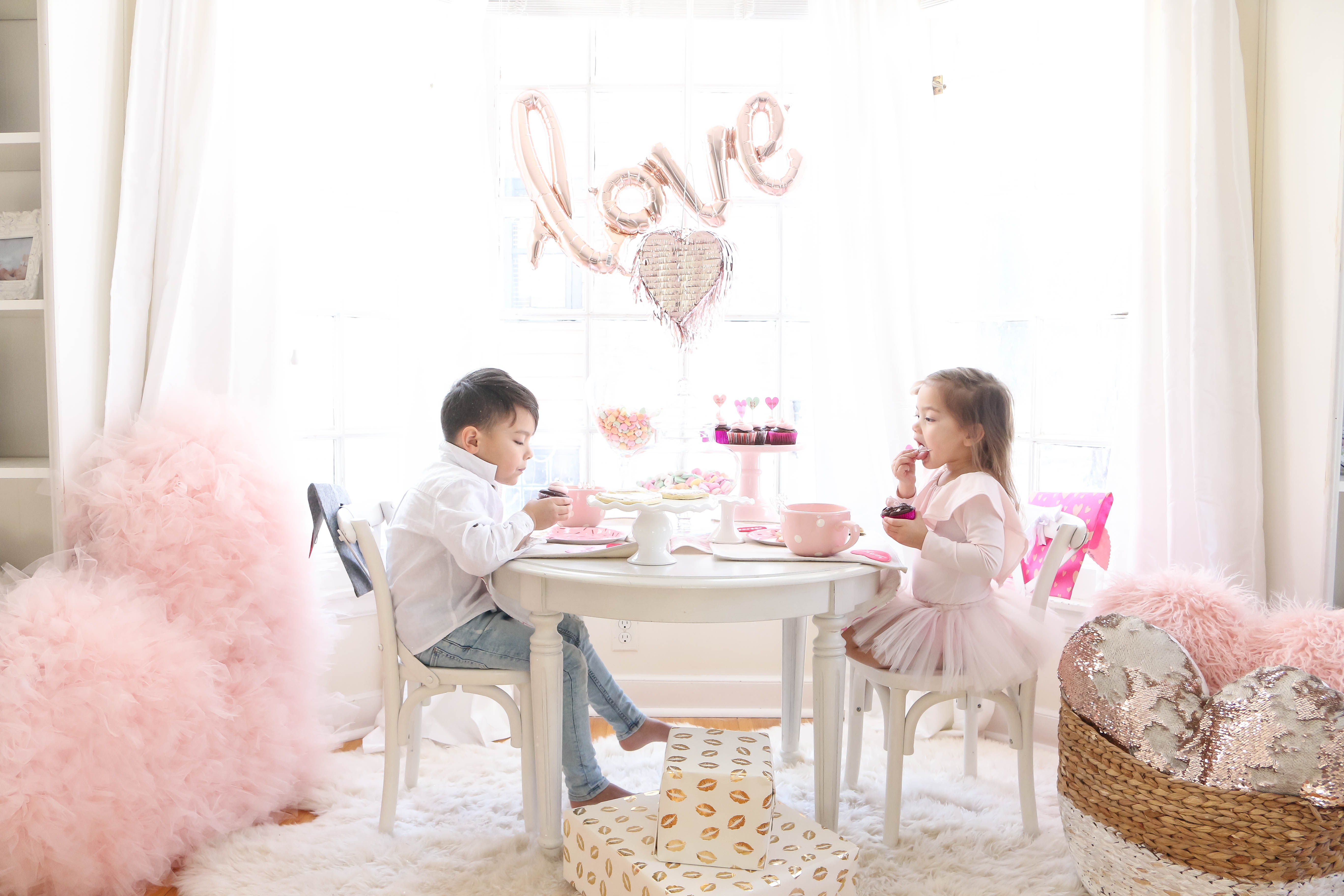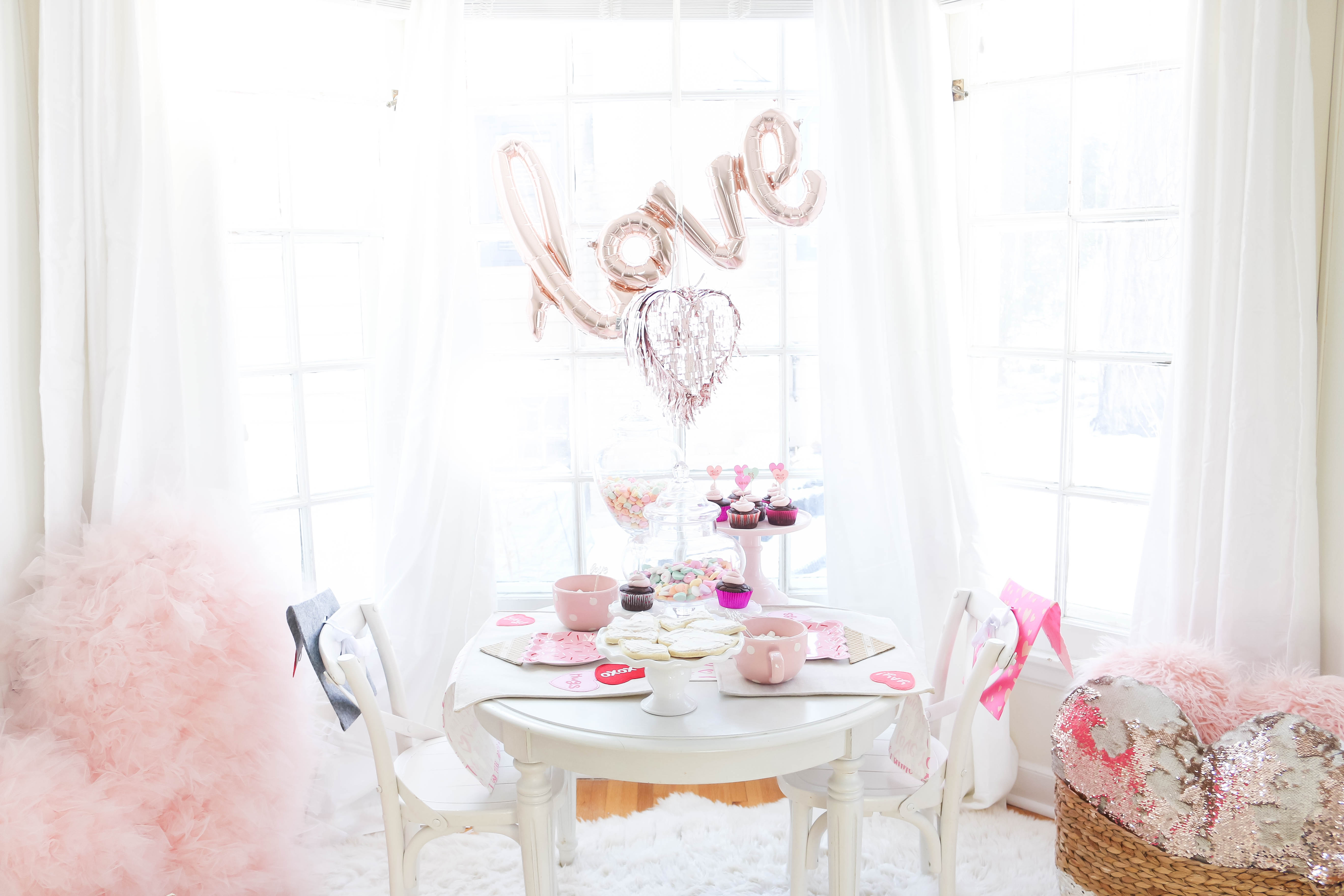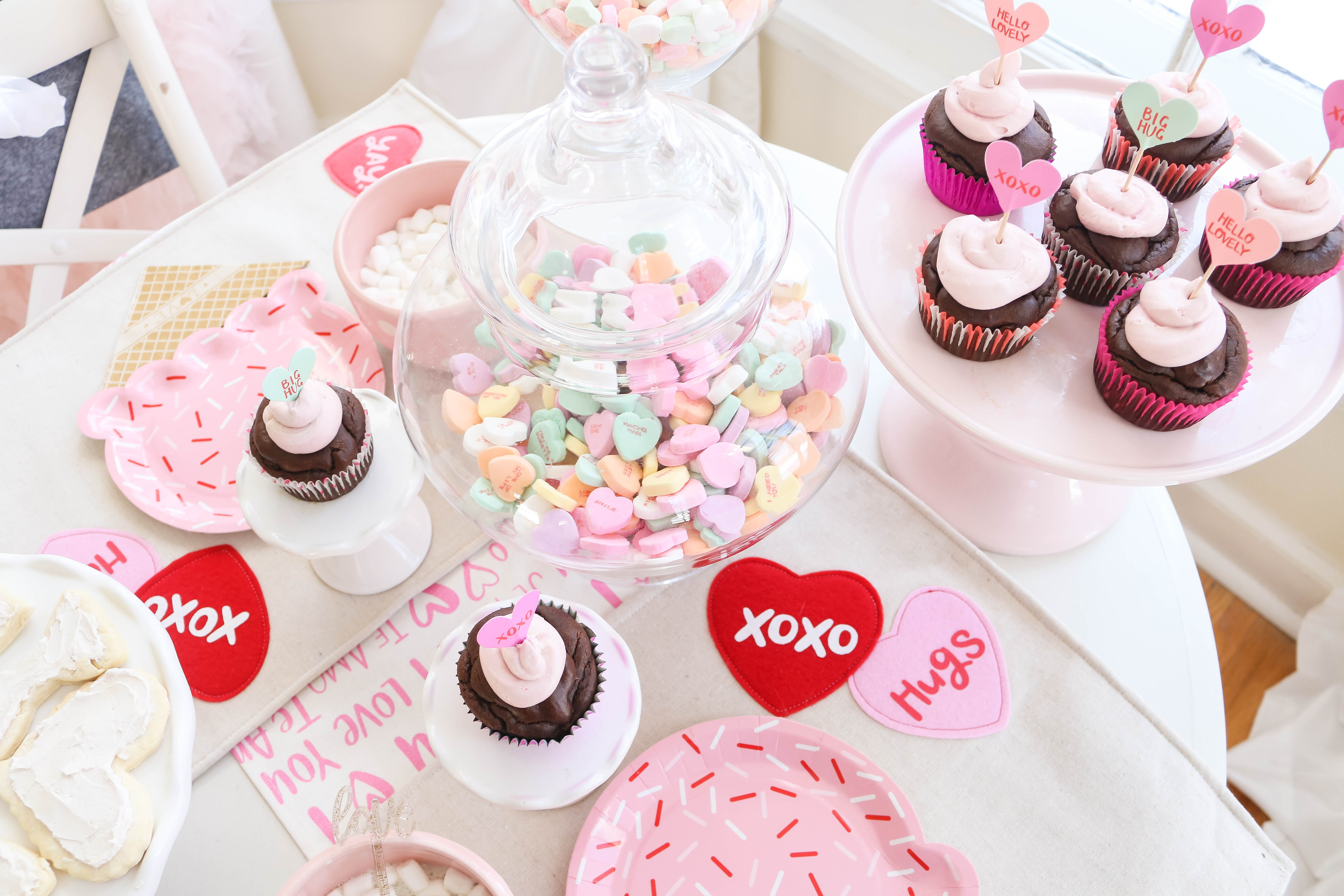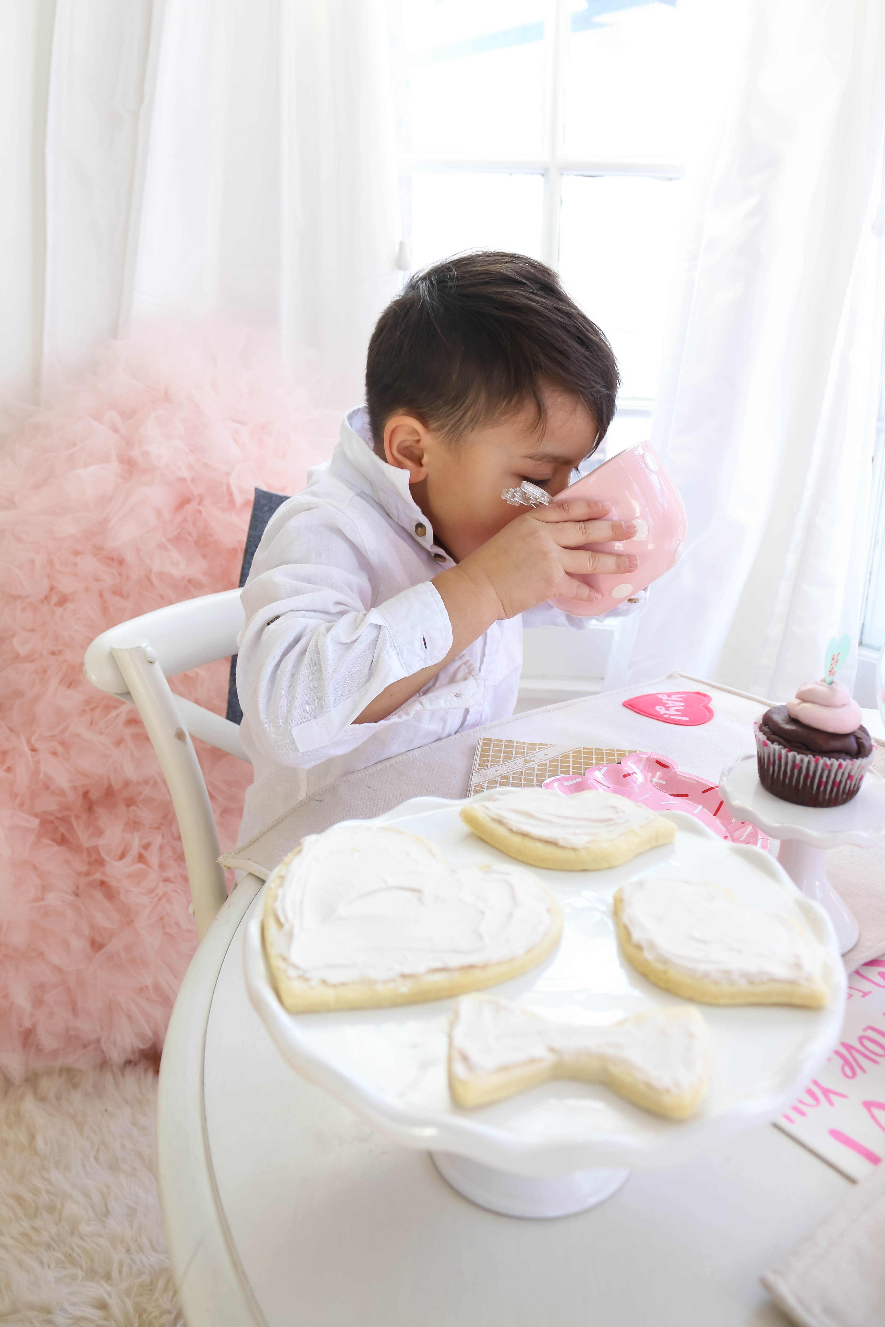 Today, I'm sharing a cute little pre Valentine's day party I threw for Camden and Bella! We ate cupcakes and cookies, drank hot cocoa and made our Valentine's for their friends. I purchased a table runner and place mats from the Target dollar section and these envelopes on the back of their chairs I purchased from there last year too. I just cut holes in them and attached them to their chairs with ribbon! Also...this love sign is from last year and it stayed blown up all year! Win win!!! I added all the shopping details for everything else below! I hope you all have a wonderful Valentine's day with your loved ones!