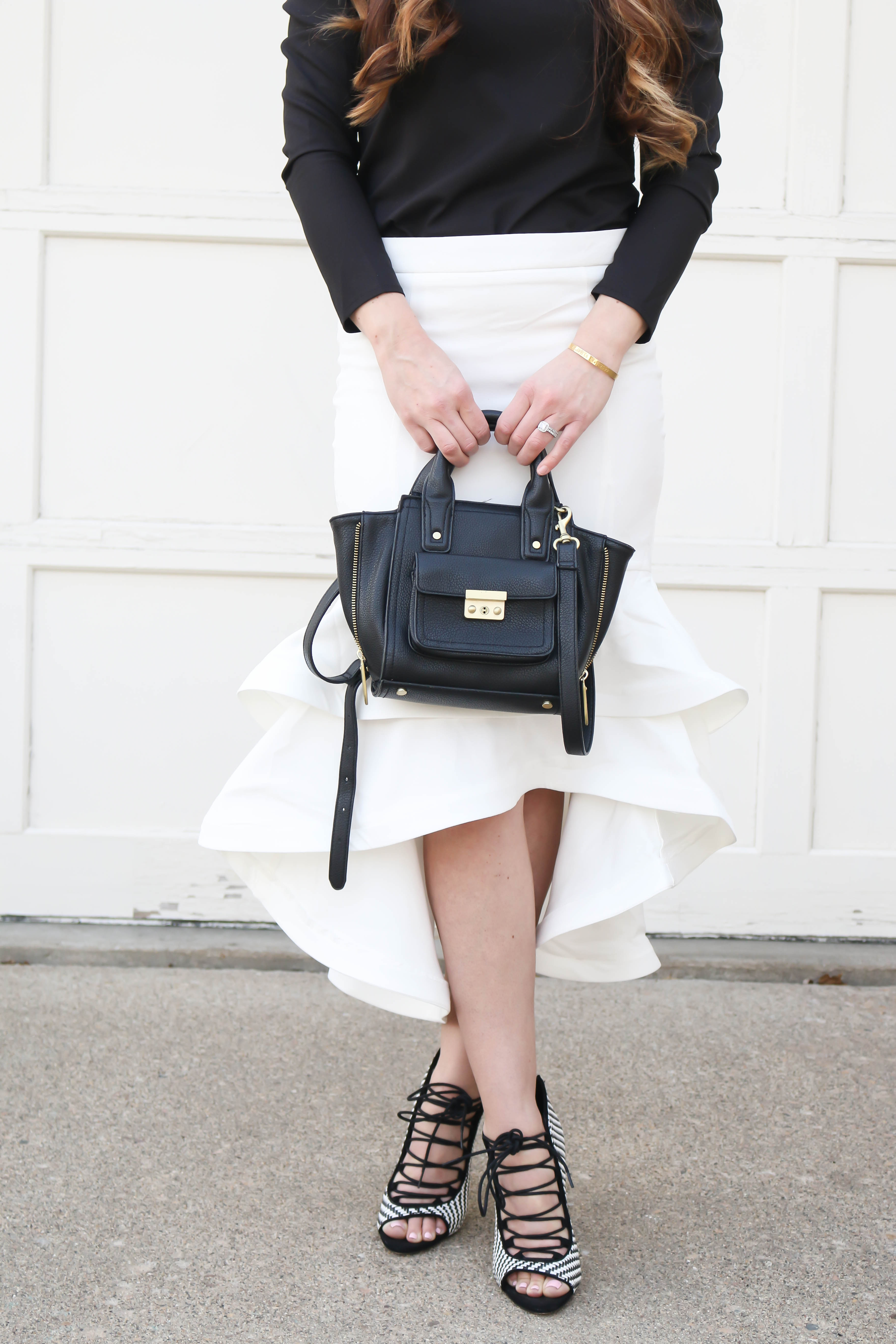 Handbag is from the Target Phillip Lim line a few years ago. Similar style here and very affordable option here and the original Phillip Lim version here.