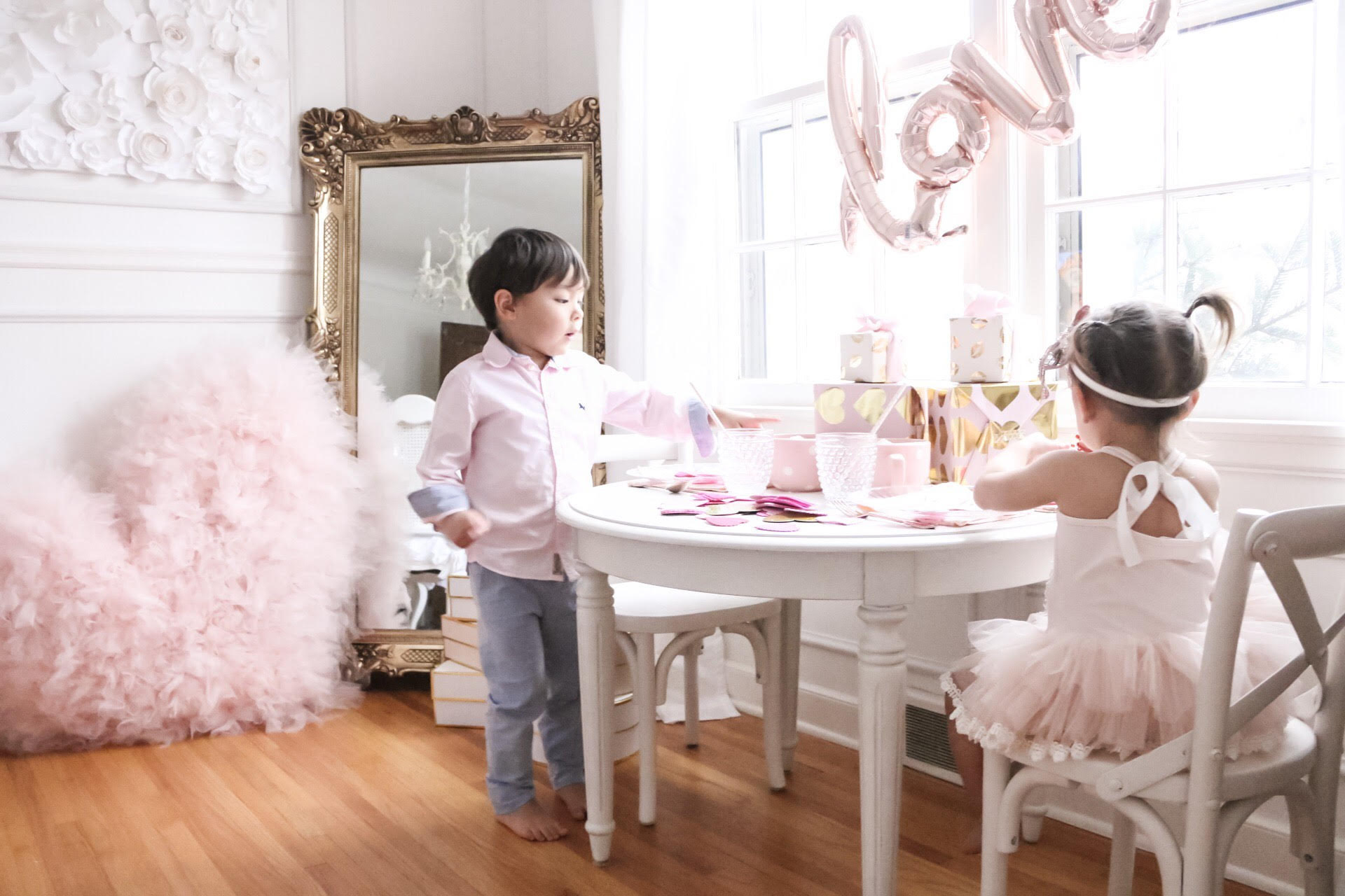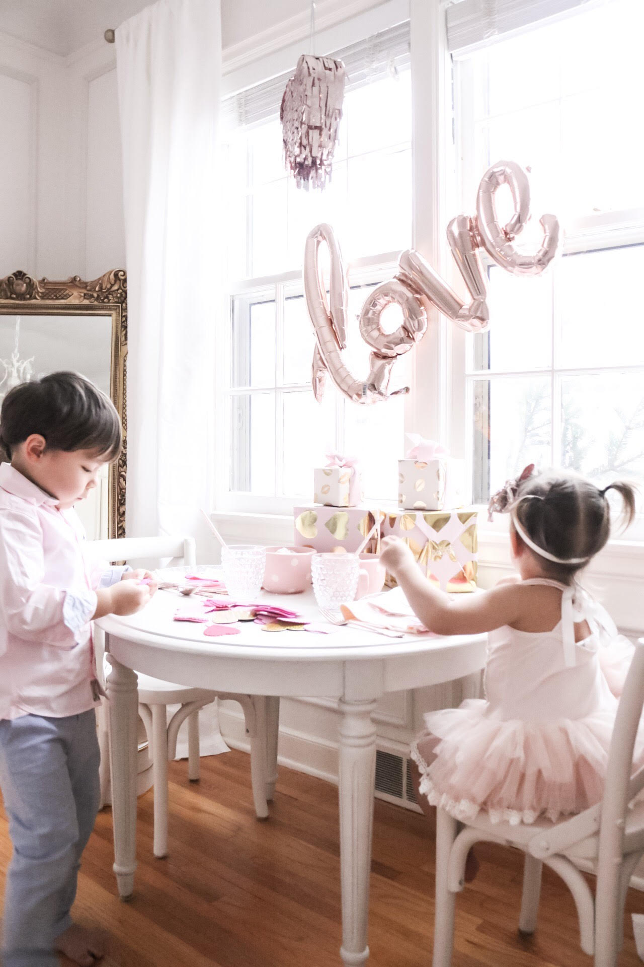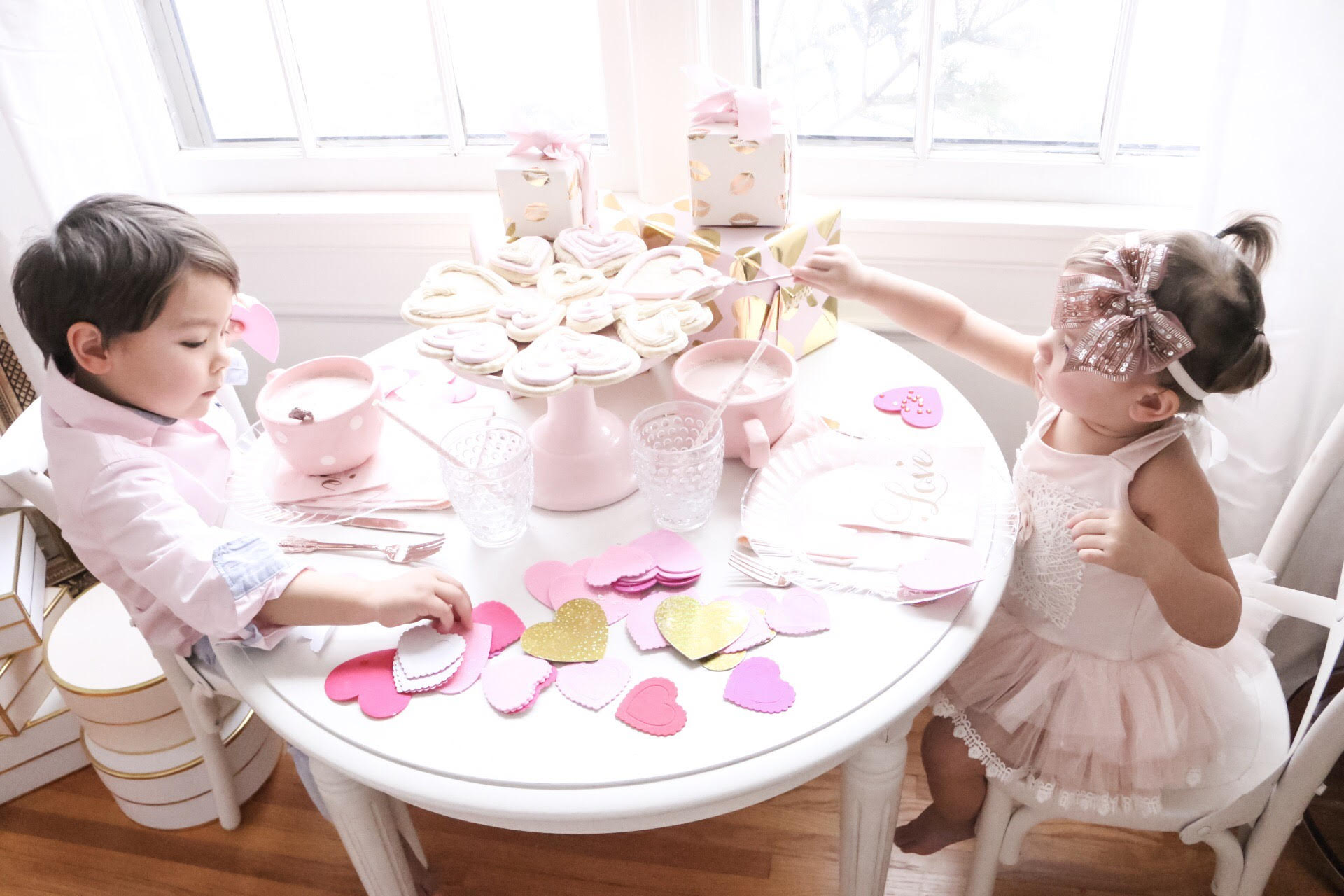 Today, I'm sharing a sweet little Valentine's Party we had earlier this week. It was packed full of sweets, hearts and so much love. Camden and Bella were so excited to eat the cookies that they helped bake, drink some white hot chocolate topped with a huge pink homemade marshmallow and open some sweet little gifts. Below I linked all the party supplies along with some tips on throwing a party!