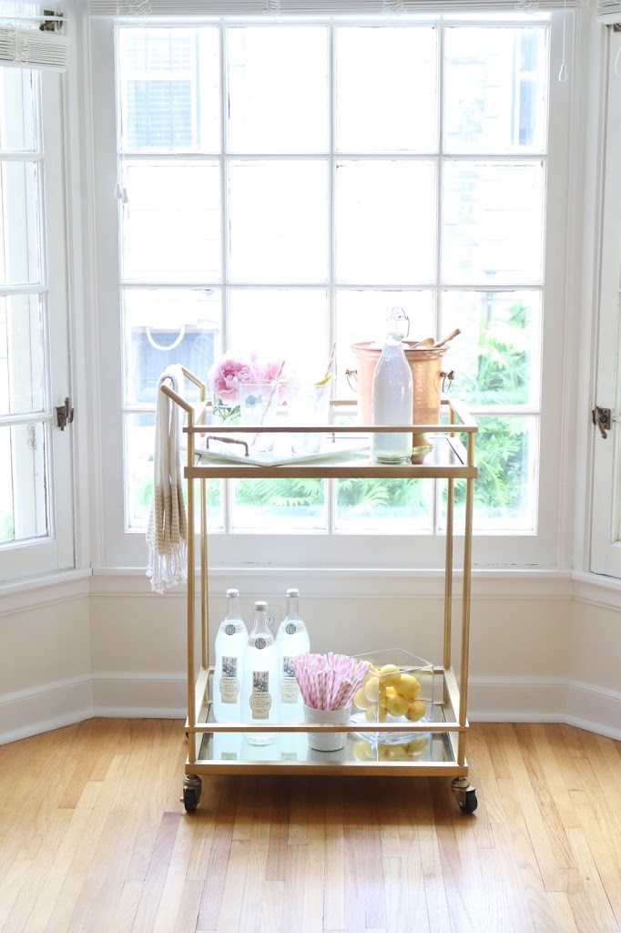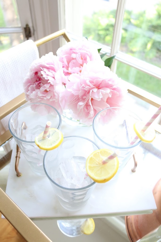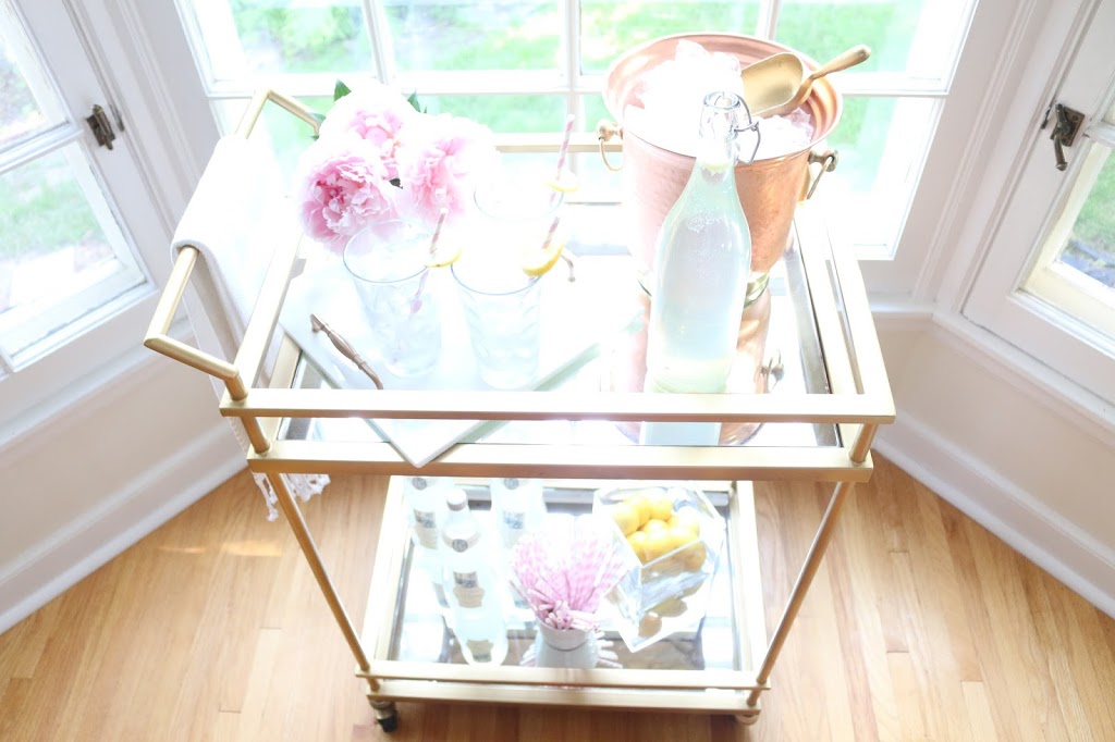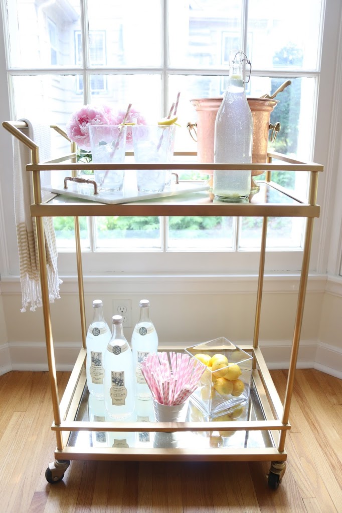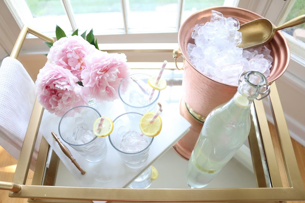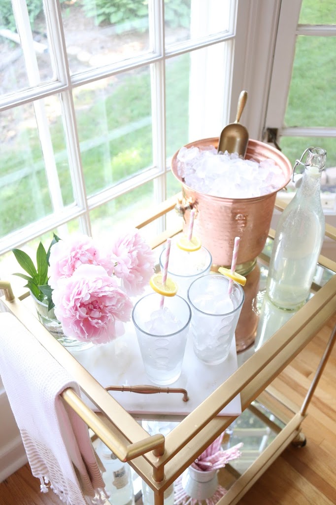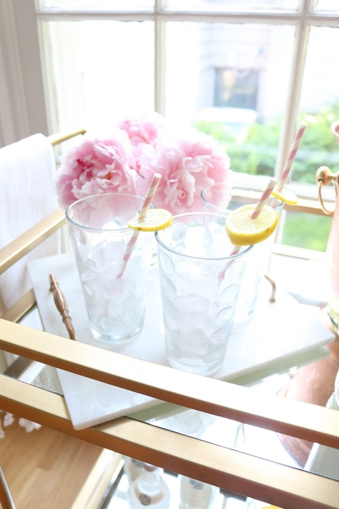 Ice Bucket: Homegoods / Towels: Homegoods / Glasses: Homegoods / Marble Tray: DIY / Straws: Homegoods / Bar Cart ( DIY with mirrors and sprayed it gold) / Lemonade: Trader Joes