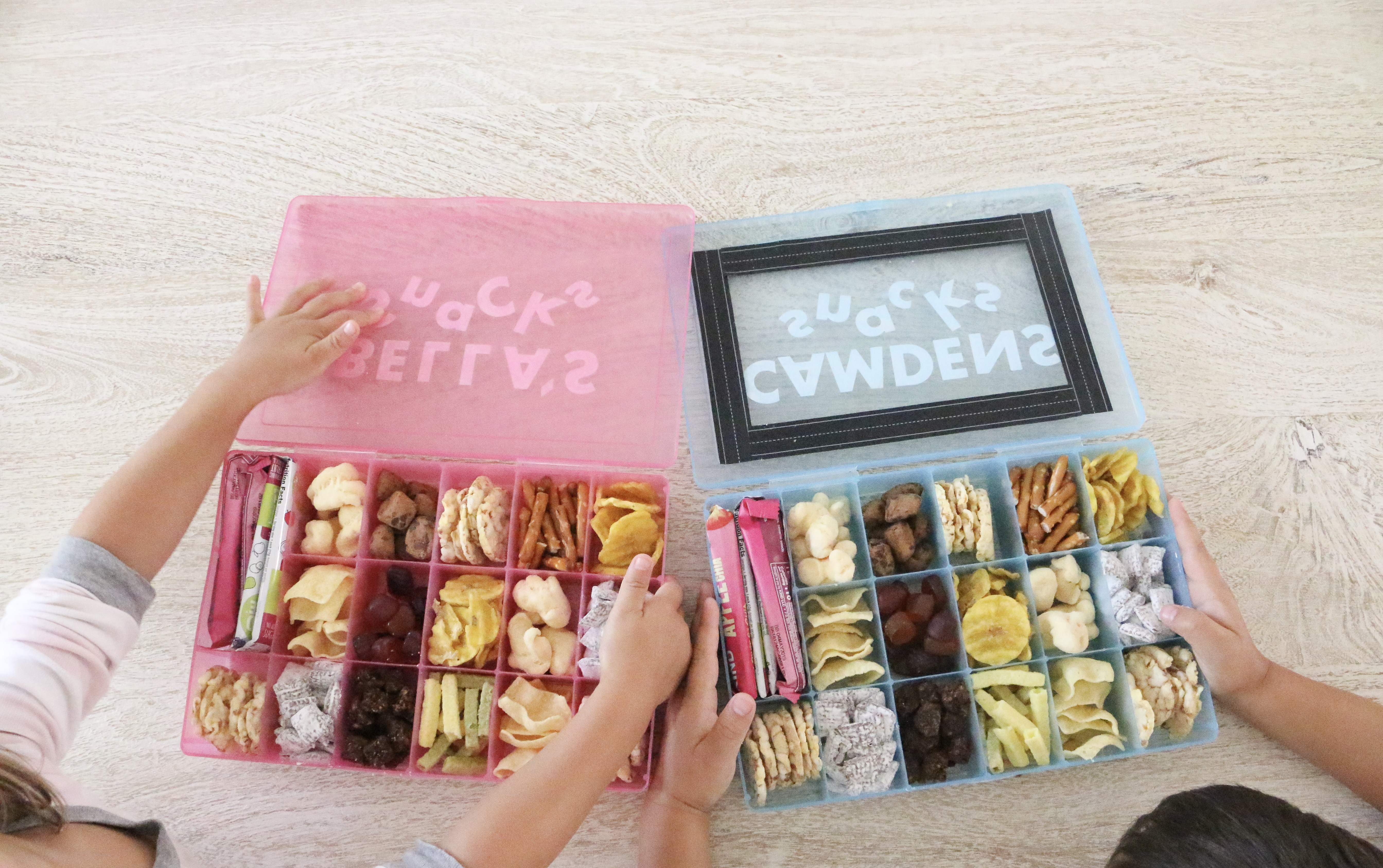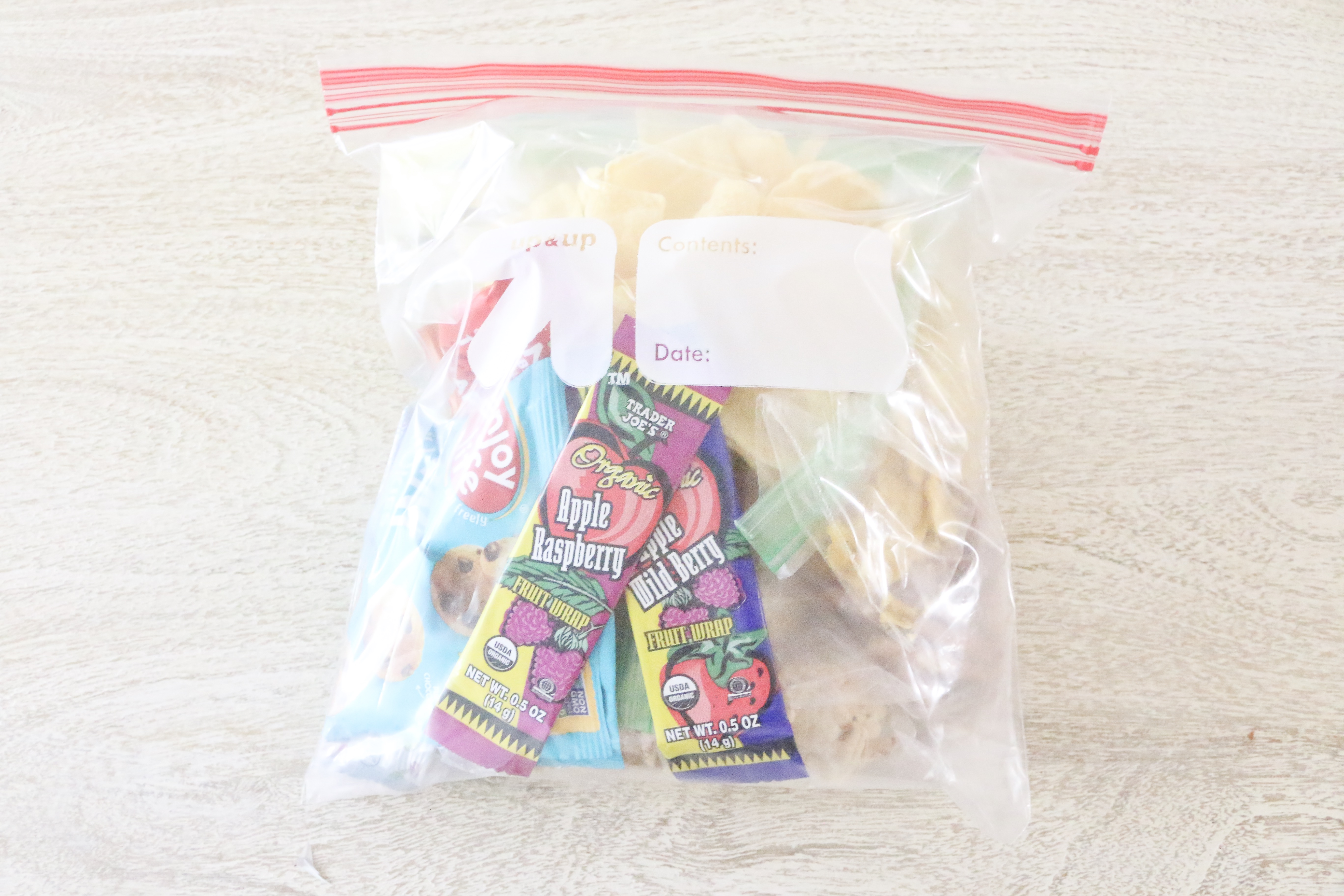 For coming home, I pack a bunch of snacks in smaller sandwich bags and put them in a gallon size bag.