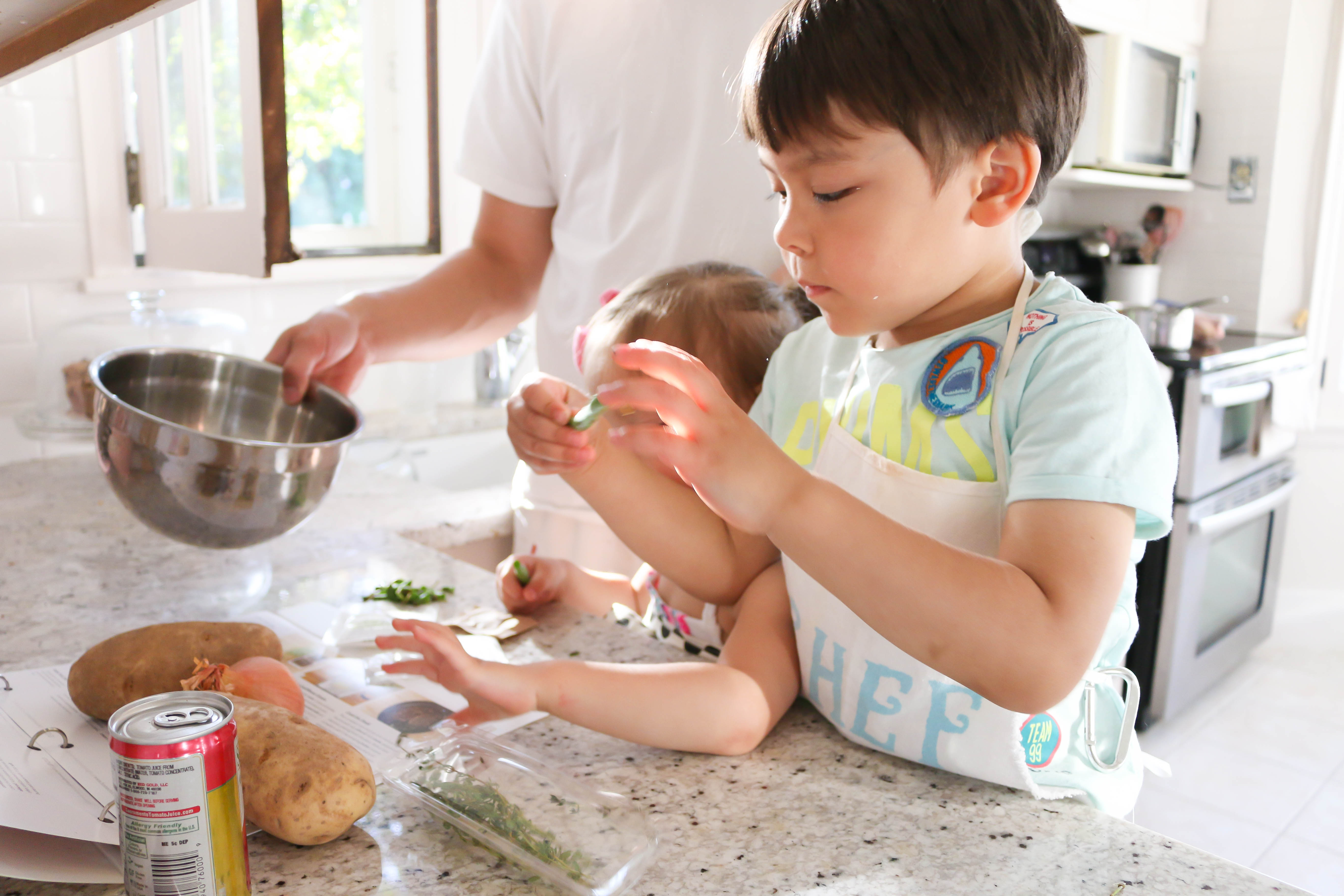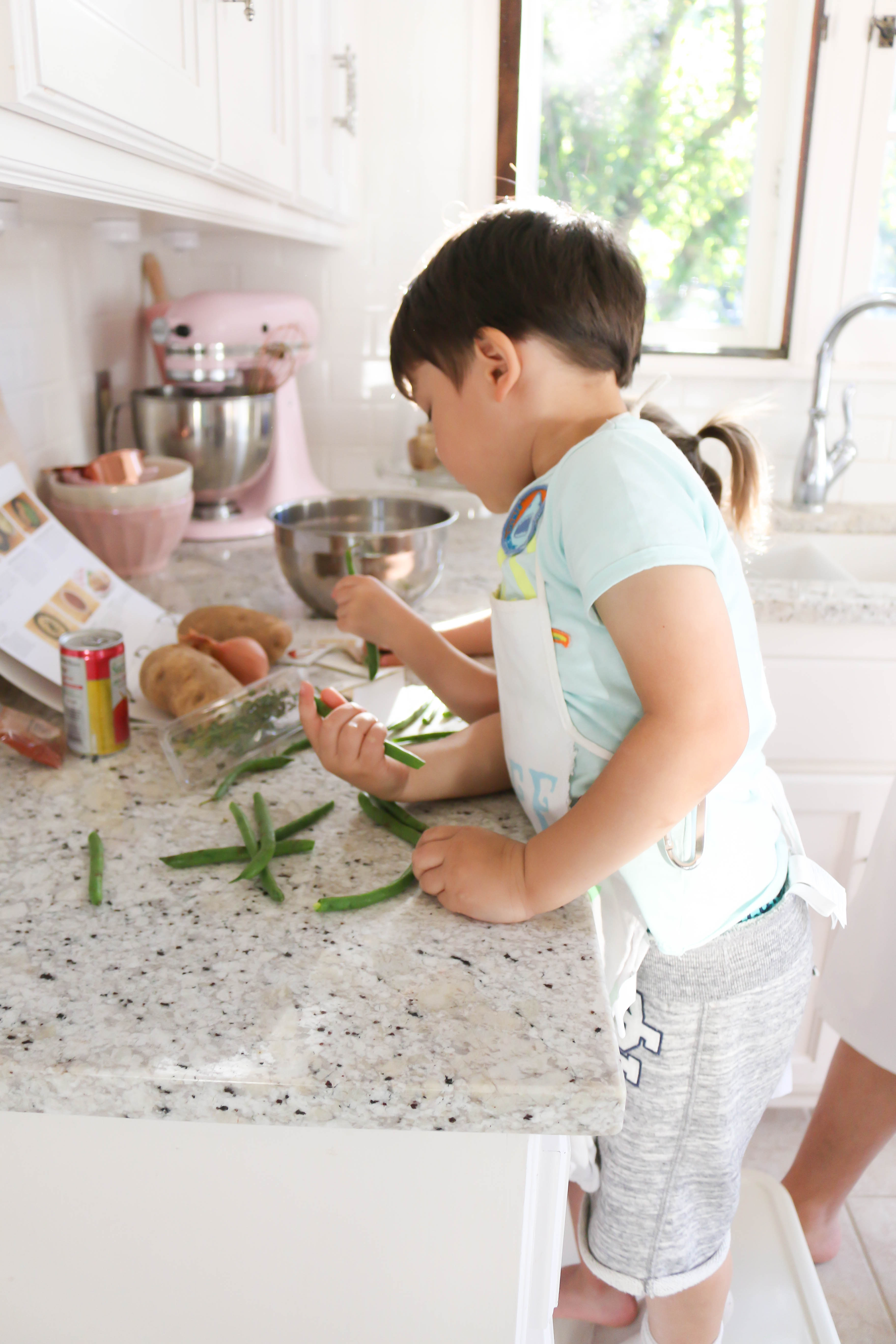 It was so fun cooking with Camden and Bella. They got the directions out and put their aprons on and were ready to help. Camden was most excited for the homemade "french fries" (that's what he called them). I never realized that adding corn starch to fresh potatoes would give them such a crispy coating.